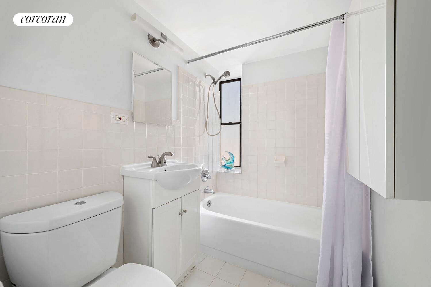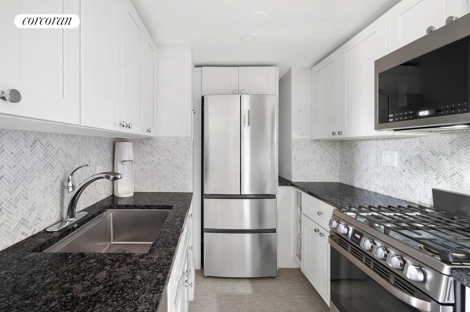 The apartment opens with a gracious entry foyer featuring a utility closet with a brand-new washer and dryer. A long hallway leads into a bright and comfortable living and dining area where east-facing windows provide consistent natural light throughout the day. The dining space easily accommodates a table for six, while remaining open and relaxed. Just off the living room, the renovated kitchen offers stainless steel appliances, granite countertops, a marble tile backsplash, and ample cabinet storage, balancing function with clean finishes.