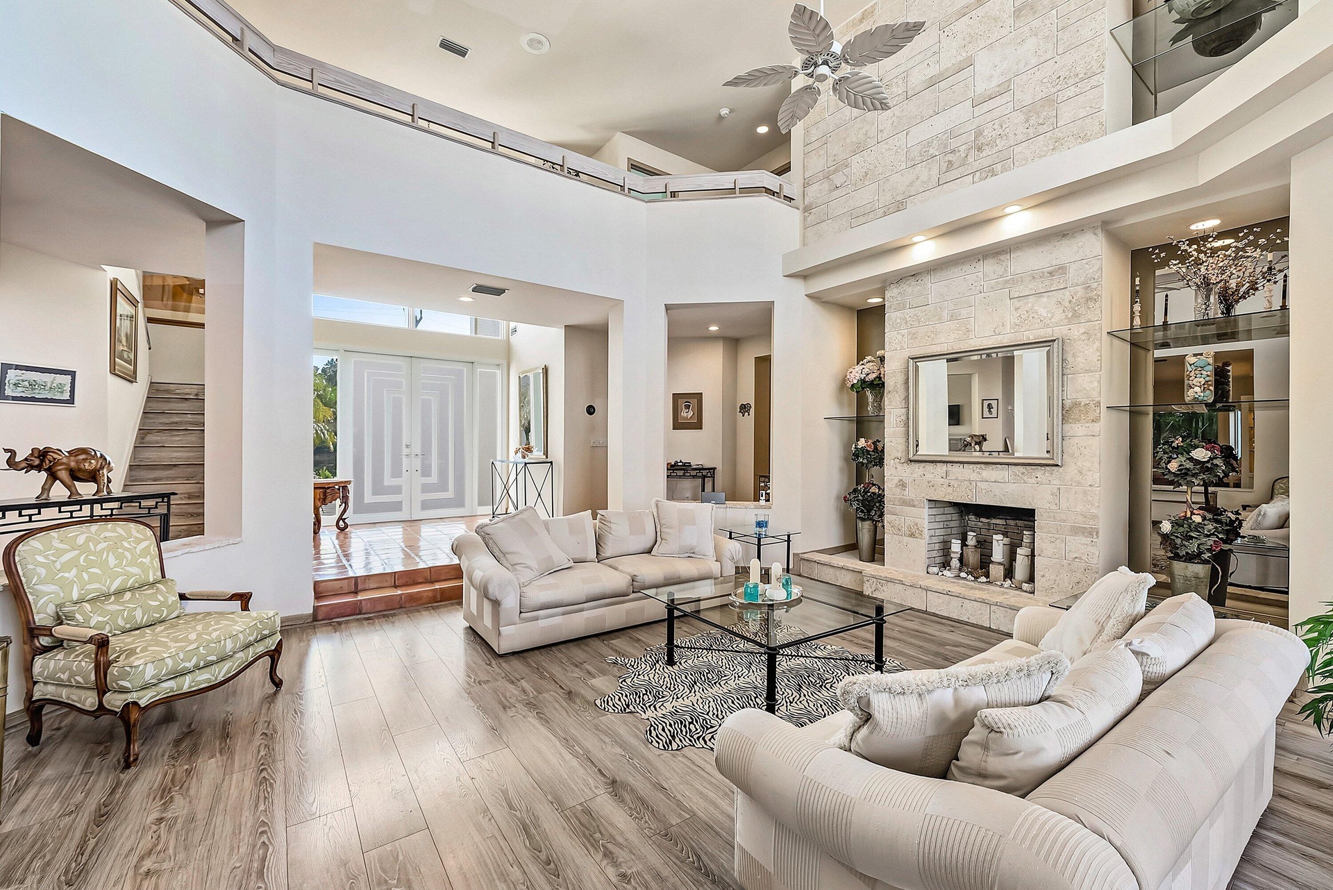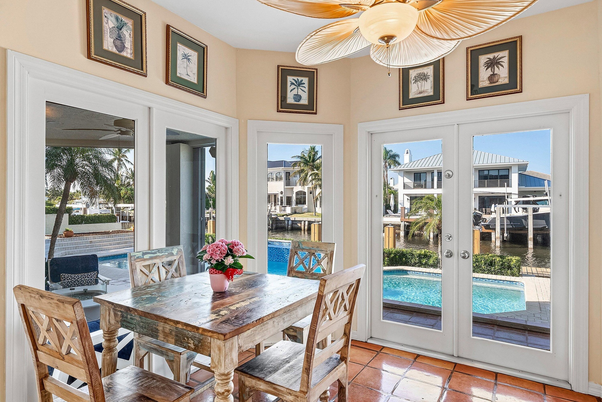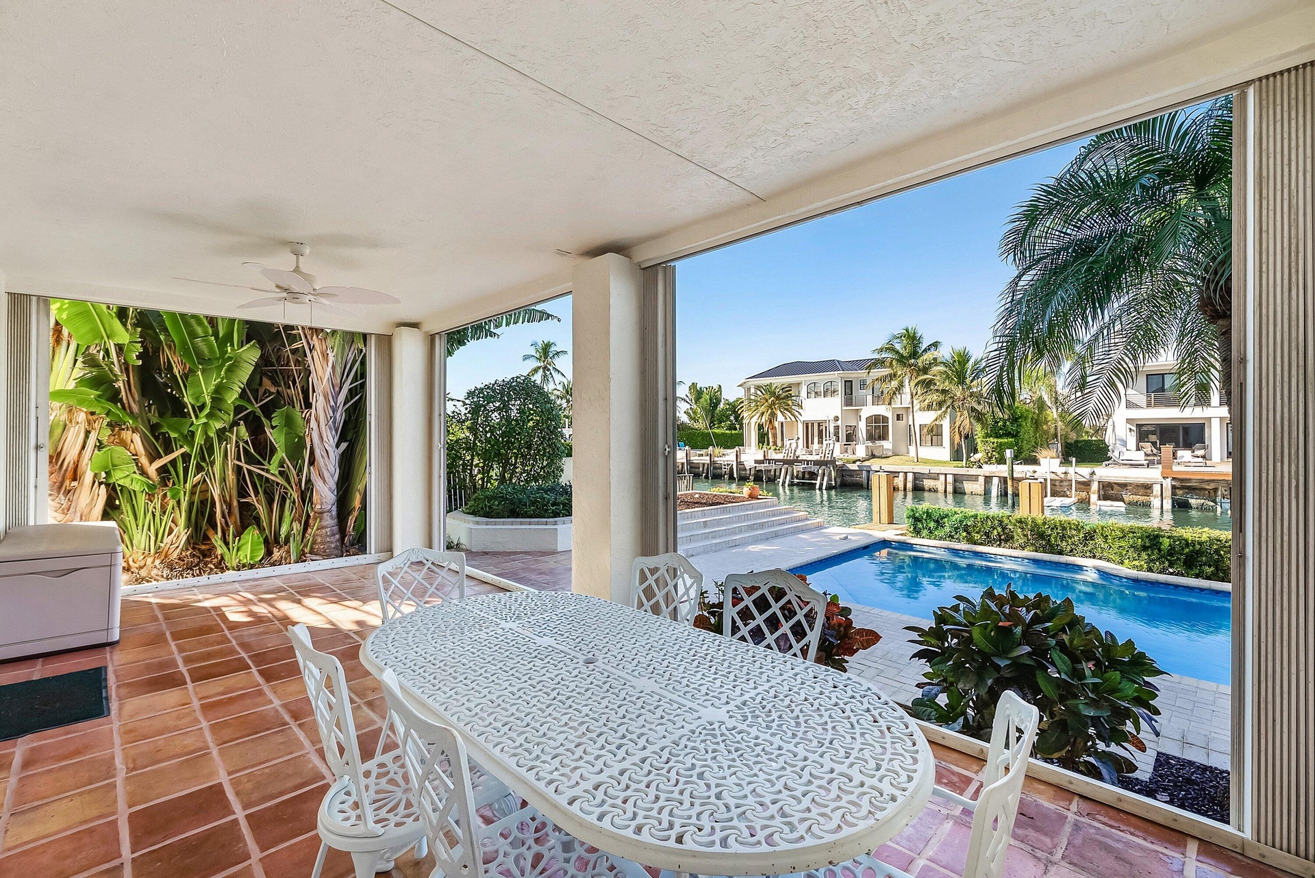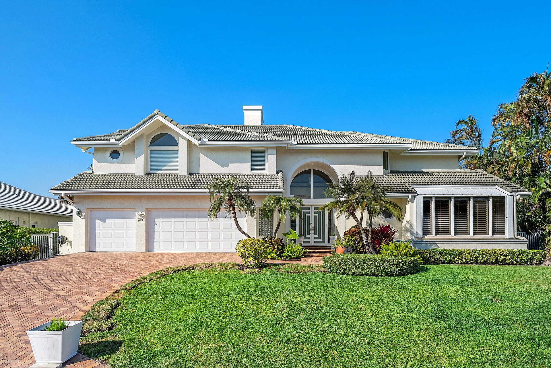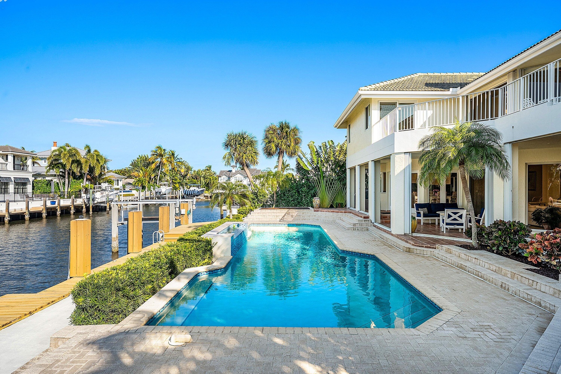 Experience the ultimate in waterfront luxury at 11 Inlet Cay, Ocean Ridge, FL -- a breathtaking residence inspired by wide water views and serene tropical gardens in the prestigious enclave of Ocean Ridge. Perfectly positioned on 100 feet of Deepwater frontage, this light-filled two-story estate offers 4,531 square feet of refined living space, featuring four bedrooms, five full bathrooms, a private office, and a three-car garage. Designed for both grand entertaining and relaxed coastal living, the home showcases soaring vaulted ceilings, expansive living areas, and walls of glass that frame tranquil water views. The spacious primary suite is a true retreat, complete with a fireplace and private balcony overlooking the water. The spa-inspired primary bath features a whirlpool tub, separate shower, and dual marble vanities. An oversized family room with ample space for a billiards table invites lively gatherings, while the dramatic living room impresses with a fireplace and soaring ceilings. The beautifully appointed kitchen overlooks the pool and sparkling waterway, seamlessly connecting to a bright outdoor loggia designed for effortless entertaining. Surrounded by lush tropical landscaping, the pool area creates a private resort-style atmosphere. Boating enthusiasts will appreciate the 60-foot dock with boat lift, offering direct access to deep water and the open Intracoastal. Tucked away on a quiet cul-de-sac just moments from pristine beaches, fine dining, and boutique shopping, this exceptional residence represents Florida waterfront living at its finest.