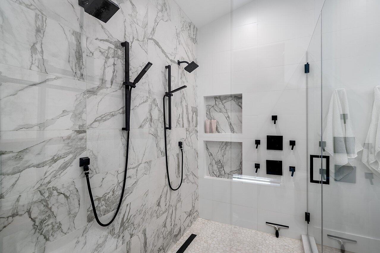 Completely Designer 6 BD 5.5 BA in Devon Place with elevated finishes throughout, where rich dark accents create a sophisticated and inviting atmosphere. Set on a quiet cul-de-sac with great curb appeal, the home welcomes you into an open floor plan anchored by a striking main living room with high volume ceilings, floor-to-ceiling windows, and abundant natural light overlooking the pool, creating a bright, open centerpiece for the home. The statement kitchen spans the entire side of the living space and is thoughtfully designed for both everyday living and entertaining, featuring Levant custom cabinetry, a striking brown leathered granite island and full-wall matching backsplash, a large Sub-Zero refrigerator, a built-in Wolf coffee maker and microwave, an oversized pantry, and generous storage throughout. A dedicated dining area is seamlessly integrated into the kitchen layout, creating a natural gathering space for meals and conversation. French doors off the kitchen open directly to the pool, enhancing the home's effortless indoor-outdoor flow, while a beautifully detailed coffered ceiling adds architectural interest and elegance. Just off the living room, a full bar with a built-in cooler, ice maker, and separate sink creates the perfect entertaining hub. The primary suite is a true retreat with direct access to the pool, two extra-large walk-in closets, and a spa-inspired bath featuring warm wood finishes, two private water closets, and a spacious his-and-hers shower. An upstairs bedroom features an oversized designer bathroom with beautiful finishes and hand-laid stone in the shower, while additional downstairs bedrooms and a dedicated office offer flexible space for guests, work-from-home living, or multi-generational needs. Each bathroom throughout the home is uniquely designed with elevated finishes, creating a distinct and memorable experience in every suite. Outdoors, enjoy a private resort-style setting with a pool and spa, outdoor kitchen, multiple seating areas, and a cabana bath. The eco-friendly landscaping includes a grid-pattern turf design with Turkish marble accents, creating a low-maintenance yet striking backyard retreat.