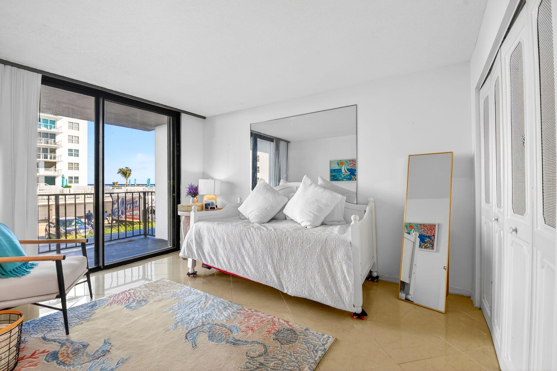 Spectacular Ocean to Intercostal views. Enjoy these views as you relax on its 40 foot balcony. Beachfront Living at its finest. A walk down the hall on the 1st floor and through one door will take you to the pool area and beach. You will find covered canopies, umbrella tables, two large gas grills, and steps to the sandy white beach. Also enjoy the many amenities: gym, Saunas, Car Wash, Billiards, Library and Bike Room. 15 minutes to PBI airport, Par 4 Golf Course, Worth Avenue and Palm Beach Tennis. Short stroll to shopping and dining.