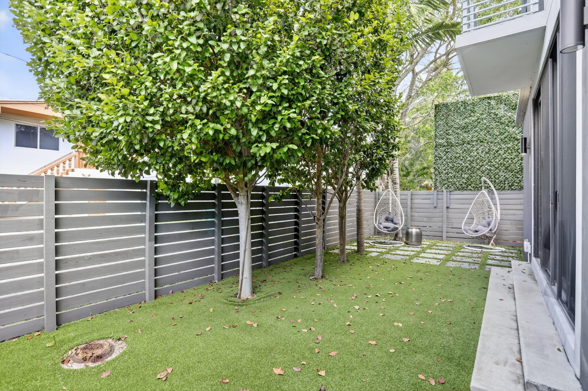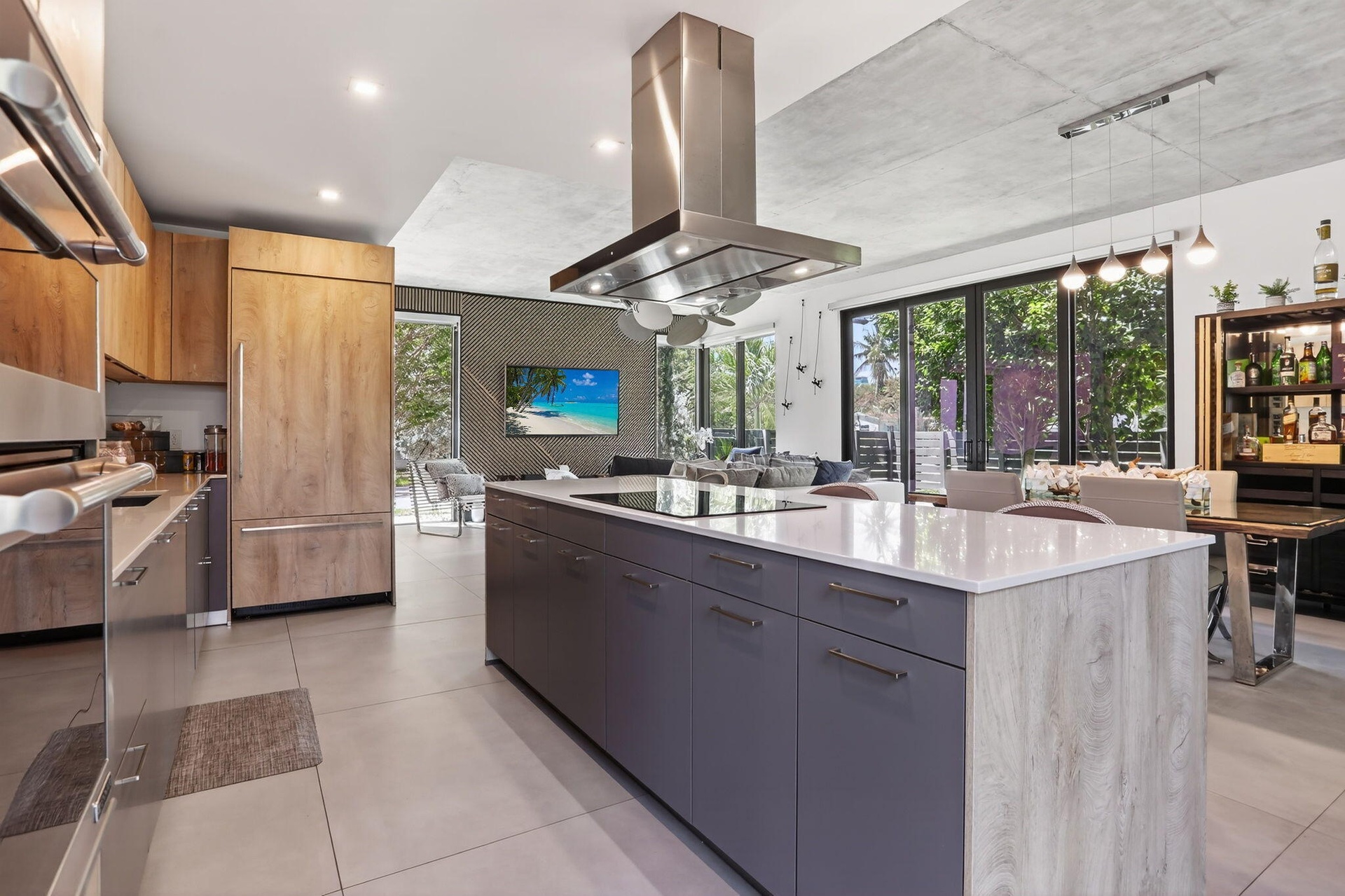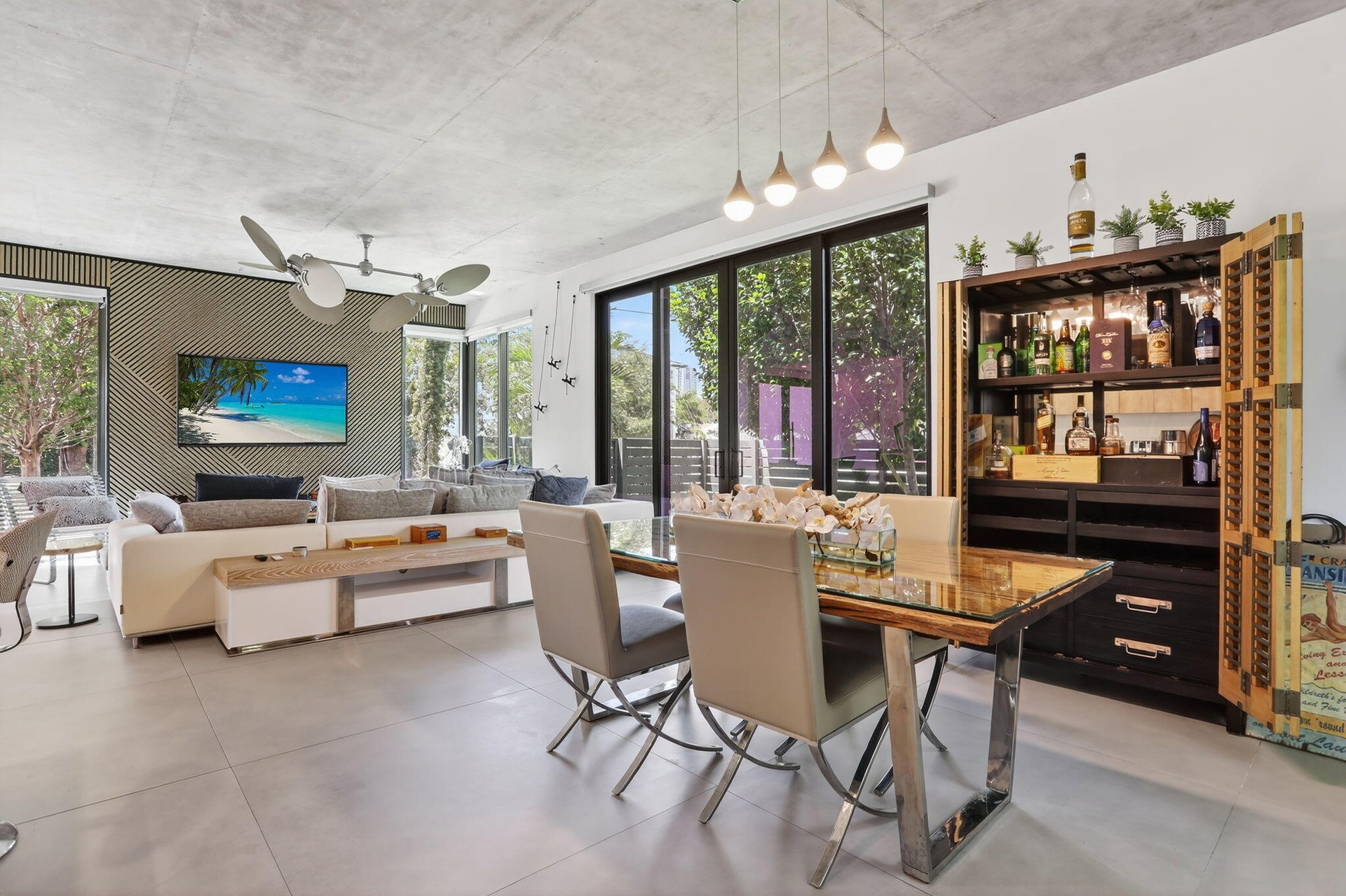 Step inside to an expansive open living area designed for entertaining, where natural light pours through floor to ceiling hurricane impact windows and highlights the home's sleek finishes. A custom wet bar and seamless connection to the lush, manicured backyard create the perfect indoor-outdoor flow for hosting or relaxing in style. The modern kitchen with brand new/unused appliances and dining spaces complement the home's elegant aesthetic, while front and rear balconies offer serene retreats to enjoy morning coffee or evening cocktails. The primary suite impresses with space, sophistication, and privacy, completing the home's refined feel. The master is followed by two other on-suite bedrooms.