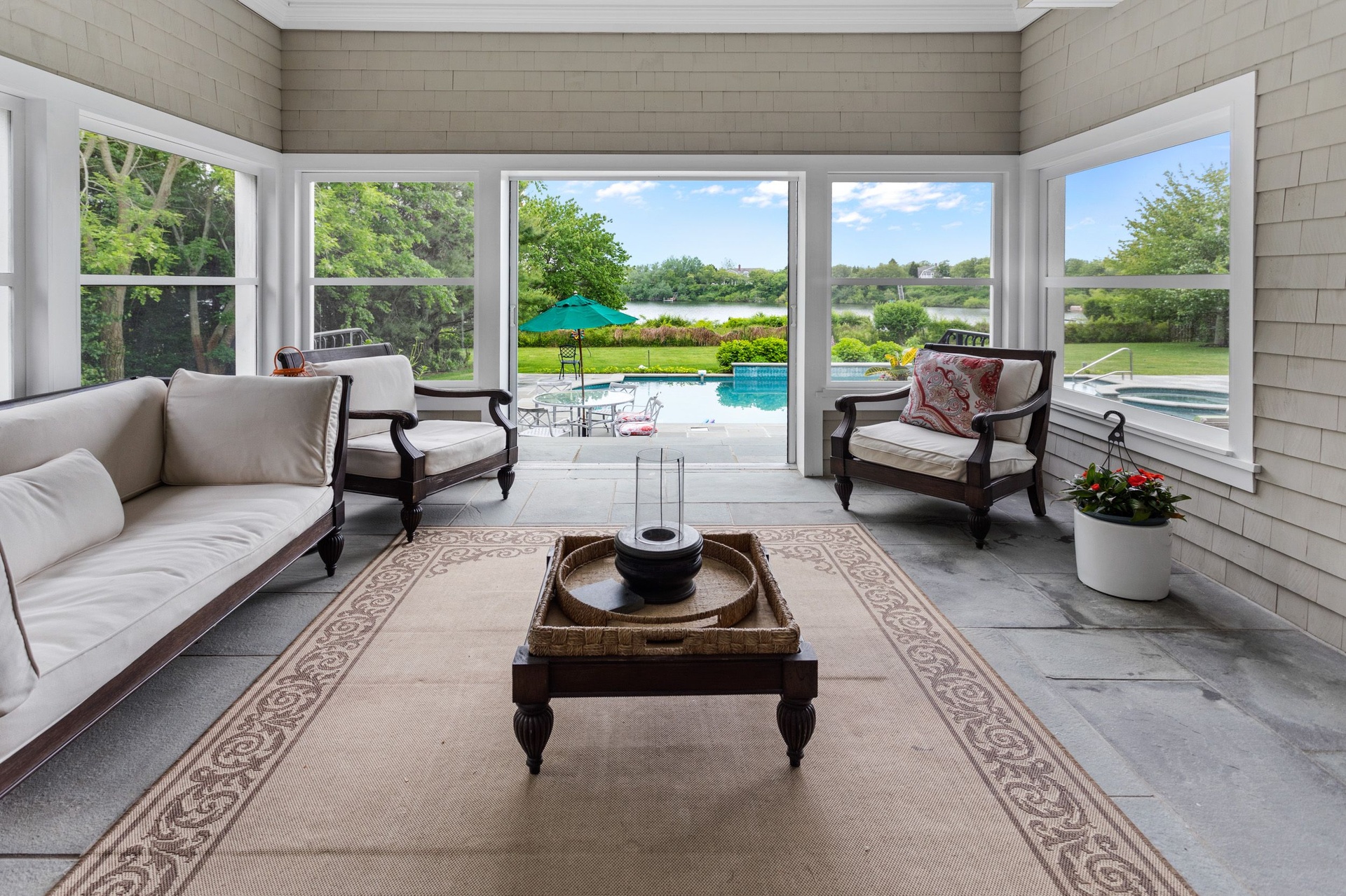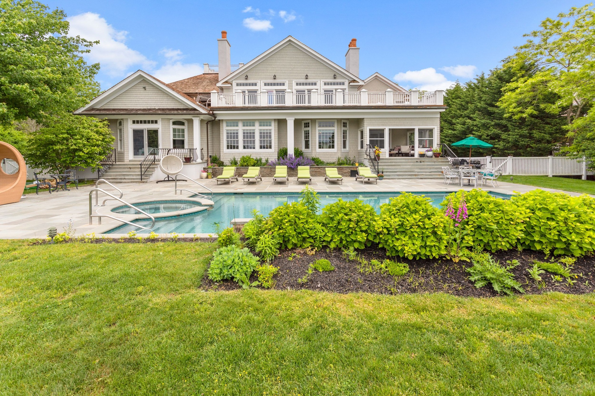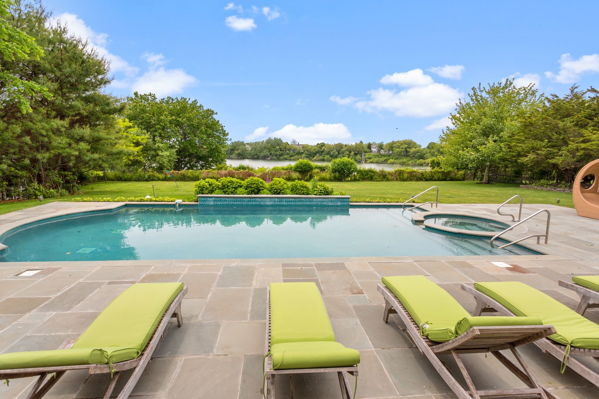 This six bedroom, six and a half bathroom home is great for both relaxing and entertaining. The bar, large screened in porch, and fire pit all include stunning views of Kellis pond. Large gourmet kitchen with windowed dining area, formal dining room, spacious den or office which can also be a second living room. Fabulous first floor master bedroom suite with adjoining oversized screened porch. Additional guest ensuite bedroom. Take the open staircase with landing overlooking the first level to the second floor which features a super open living room with fireplace, full oversized bar and out-of-this-world views of Kellis Pond from inside and the outdoor deck. The deck comes complete with several areas for entertaining along with firepit. Second level also has a master suite with private terrace. Three additional guest bedrooms with full baths. Enjoy the scenic backyard while lounging by the pool, entertaining family or friends, fishing or kayaking at Kellis Pond. All high end furnishings and linens, elevator, CAC, laundry room on first level and three car garage. Only a few minutes to the ocean at Sagg Main Beach, village of Bridgehampton, Water Mill and a short distance to Southampton and Sag Harbor to access great restaurants, shopping, art galleries, wineries, coffee shops, library and farmstands. Truly a special home not to miss.