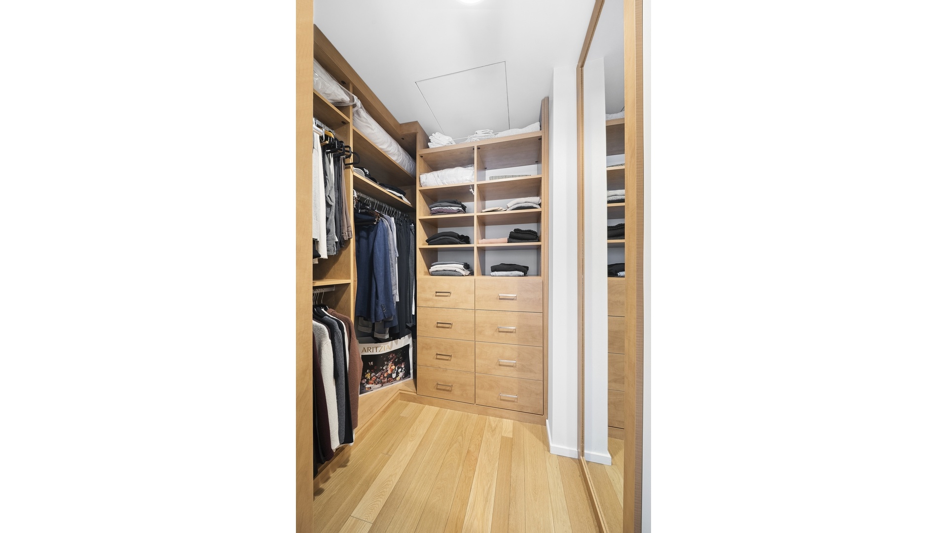 Outfitted primary walk in closet designed by California Closets. New window treatments throughout the home.