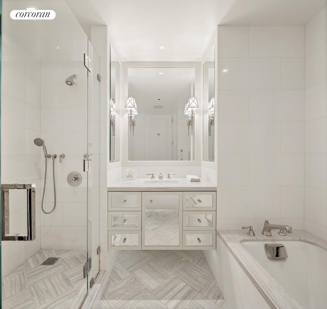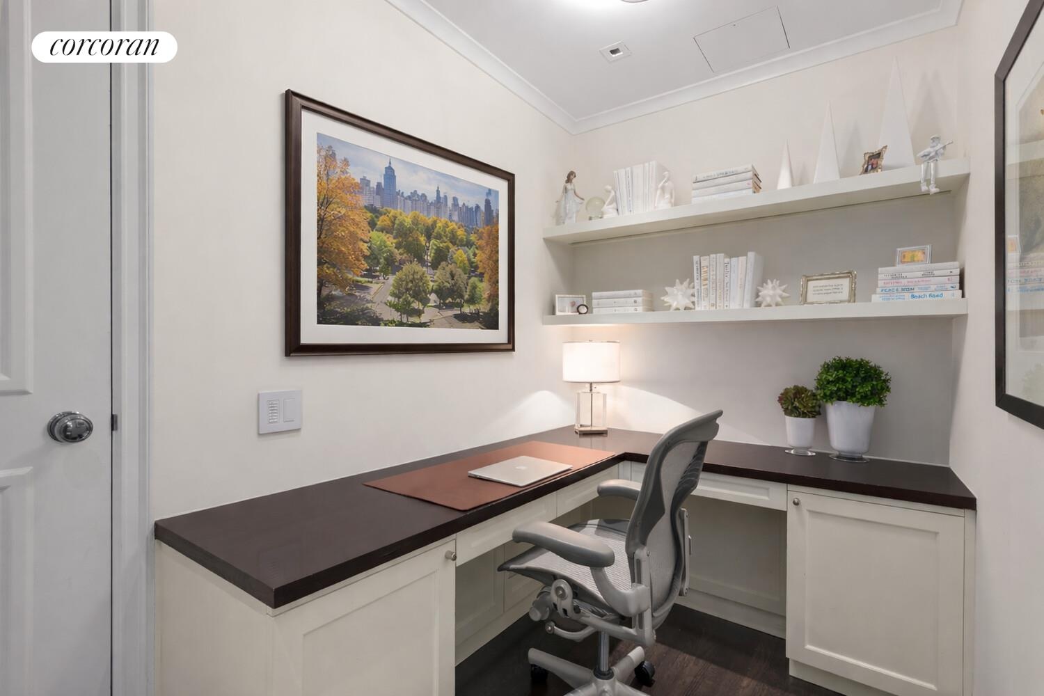 32D has a thoughtful floorplan with generous room proportions. There are two large bedrooms, both with ensuite bathrooms plus an additional, dreamy powder room with luminous pearl-like wall tiles. The spacious primary bedroom offers a dressing area with a beautiful mirrored vanity and Kallista sink in addition to the large spa-like bathroom with deep soaking tub, and separate shower. Also found in the primary bedroom is a large, convenient built-out home office. The expansive living area feels open and voluminous.