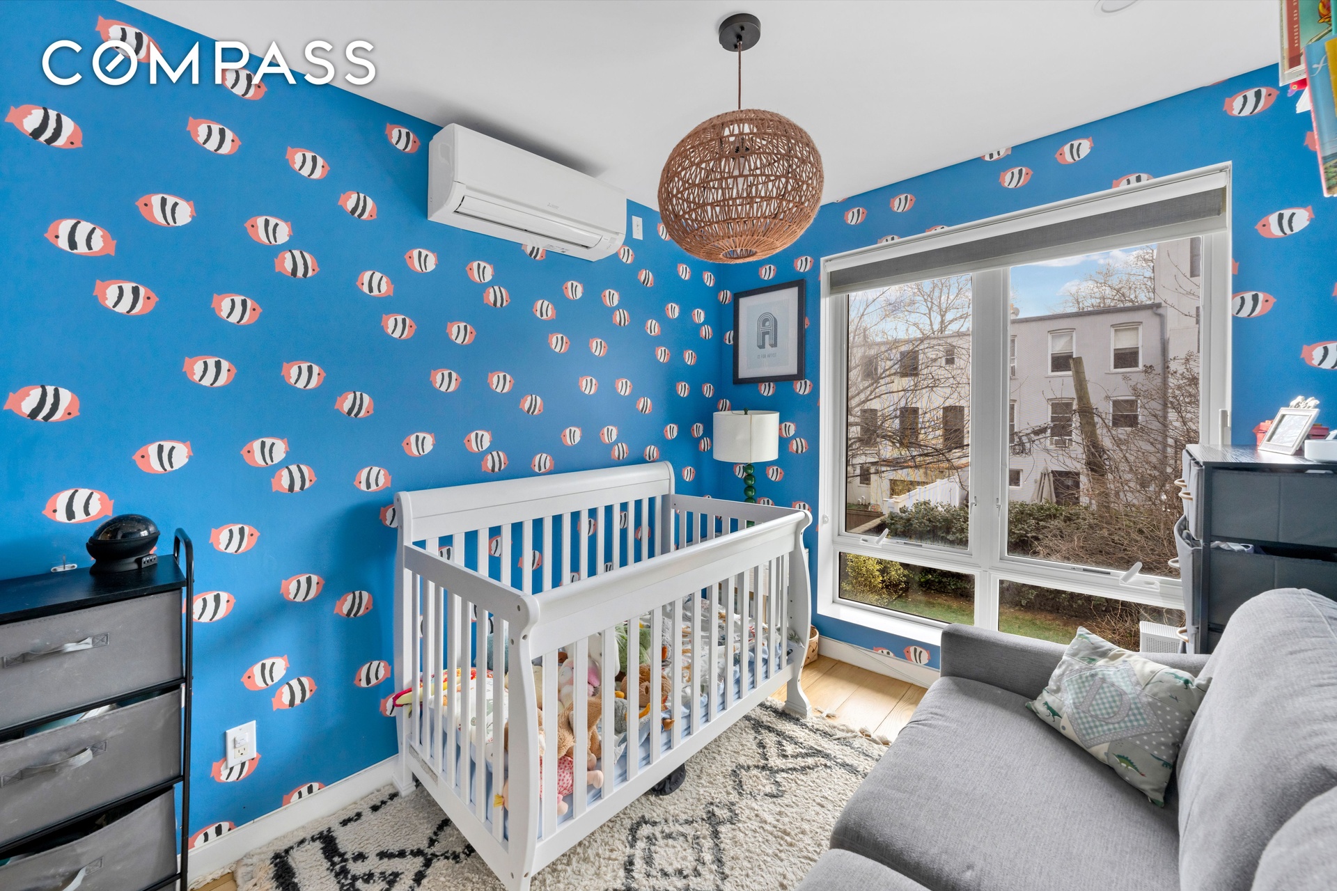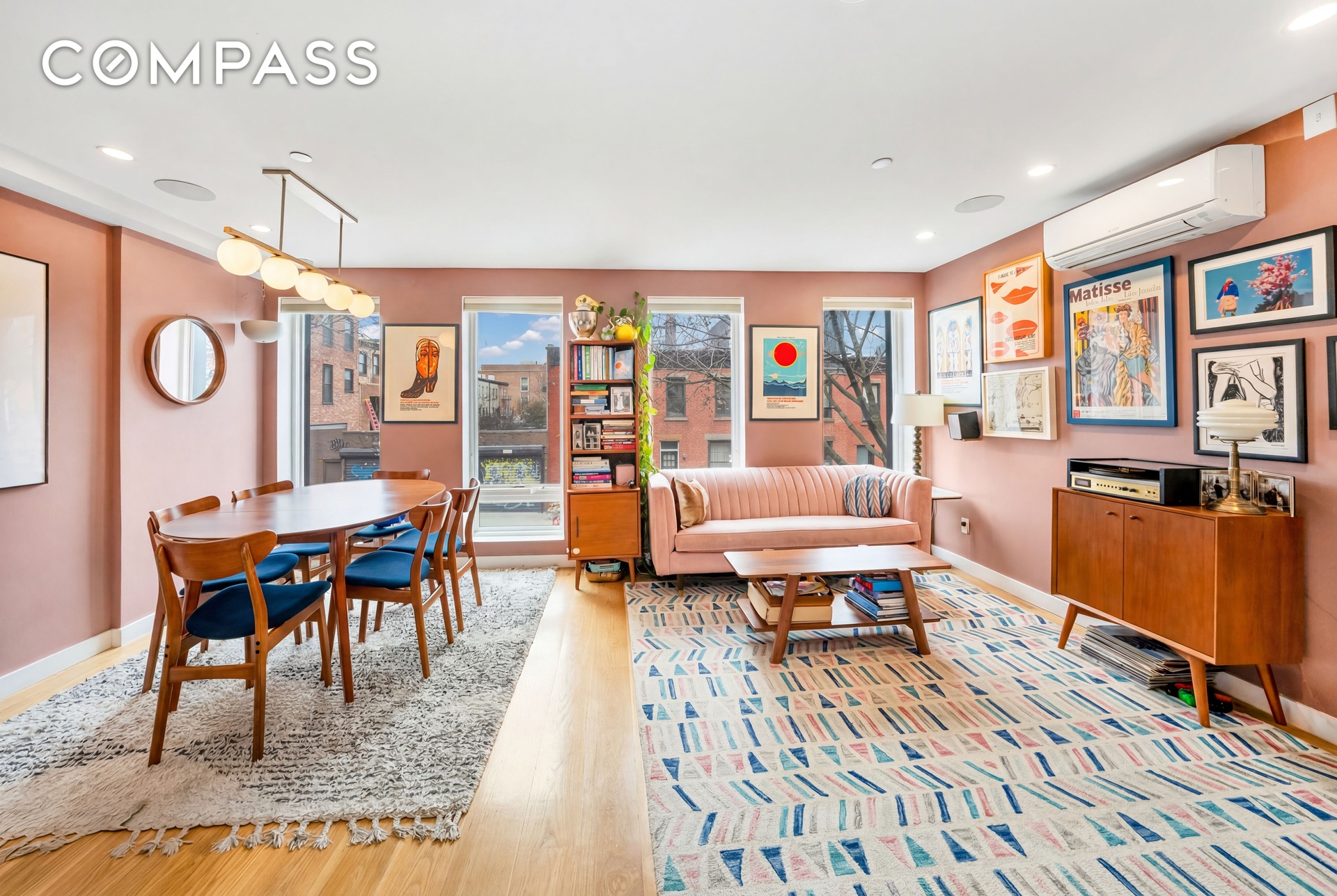 Just one flight up, enter into the bright and spacious living and dining room with an open kitchen. Two of the bedrooms and one bath complete the first level with natural light coming in from every direction.