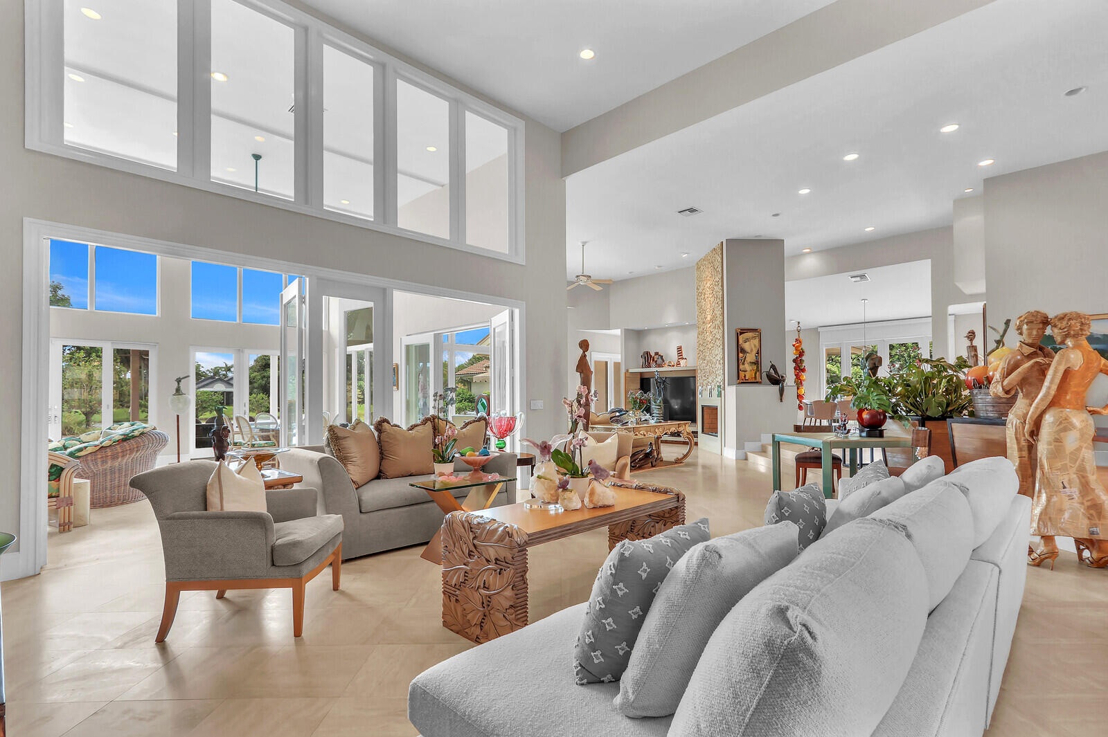 Designed for both grand entertaining and comfortable everyday living, the thoughtful crafted floor plan features generous living spaces enhanced by tasteful updates throughout. A contemporary kitchen and a striking double-sided fireplace elegantly adorns the main entertaining spaces. Soaring volume ceilings and an entire wall of windows frame exquisite lake views to create perfect Florida indoor/outdoor living.