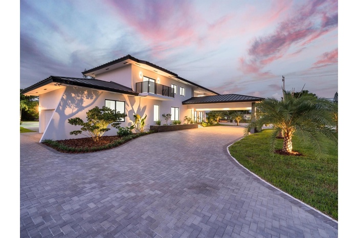 Nestled in the prestigious Miller Estates, this 7,000+ sq ft residence sits on over an acre in one of the most sought-after neighborhoods. A grand circular driveway, expansive carport, and pivot front door set the tone for a resort-like lifestyle. Inside, every detail shines—from a marble staircase, elevator, and water feature to a brand-new metal roof, impact windows, and designer LED lighting. Enjoy a massive kitchen, resort-style pool, basketball court, 2/1 guest house, and a bonus detached space ideal for a gym, yoga studio, or cigar lounge. Offering elegance, comfort, and privacy while just minutes from major highways, this estate truly has it all.