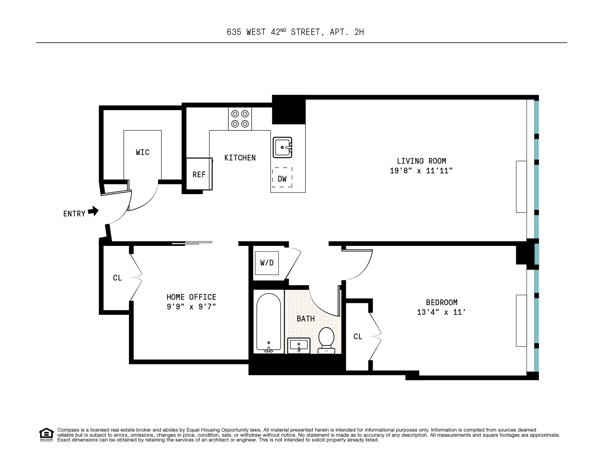 Spanning 837 square feet with 11-foot ceilings, this spacious home is filled with south-facing sunlight and enjoys open-sky views in the oversized living room, while the sleek, open chef's kitchen dazzles with excellent cabinet space, a breakfast bar and top-notch stainless steel appliances. Gleaming white oak floors guide you to the south-facing bedroom where you'll find two large closets. The bathroom is filled with floor-to-ceiling marble, the adjacent hall closet provides ample storage space, and the in-unit washer-dryer adds effortless convenience to this sunny Hell's Kitchen home.
