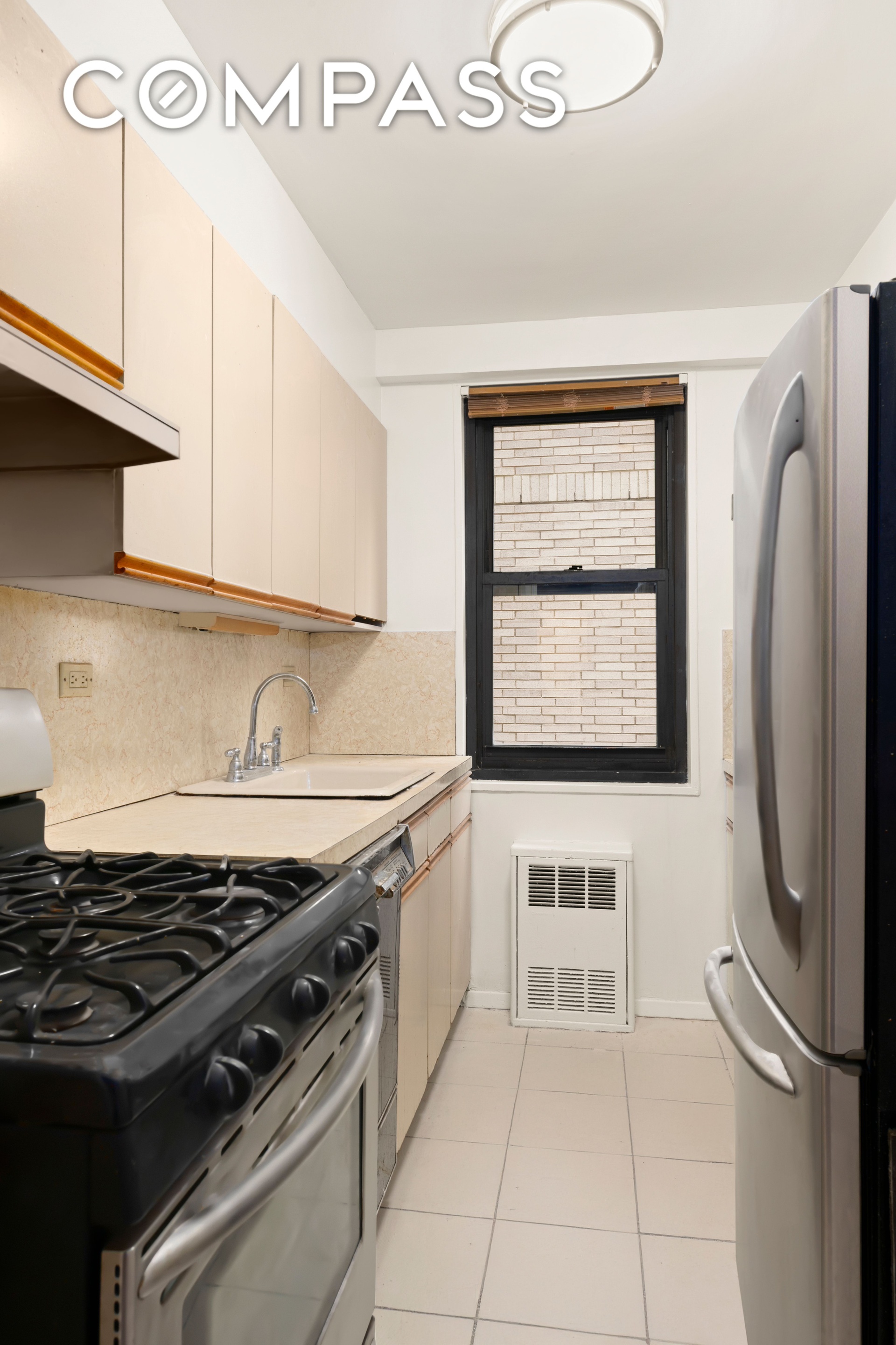 A welcoming foyer entry creates a natural separation from the hallway and opens into an expansive living and dining area flooded with light from multiple exposures. Oversized windows frame peaceful neighborhood views, while the adjoining private terrace provides the perfect setting for outdoor dining, morning coffee, or quiet evenings above the treetops. The windowed kitchen sits conveniently adjacent to the dining space and features ample cabinetry and workspace, ready to be reimagined to suit your personal style.