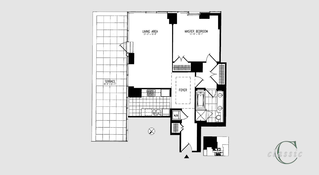 Relax on your private spectacular 35' north facing terrace from 12D, a spacious one-bedroom condominium with bright city views! There are Brazilian Cherry hardwood floors, floor to ceiling windows, a windowed kitchen with Absolute black granite countertops and floors, white lacquer cabinetry, Miele range & dishwasher, a Subzero refrigerator, a GE microwave and a wine cooler. The marble bathroom features double sinks, a stall shower, soaking tub and towel warmer. 12D has central air conditioning and heat and a washer dryer. This is a one bedroom with everything to make a home complete!