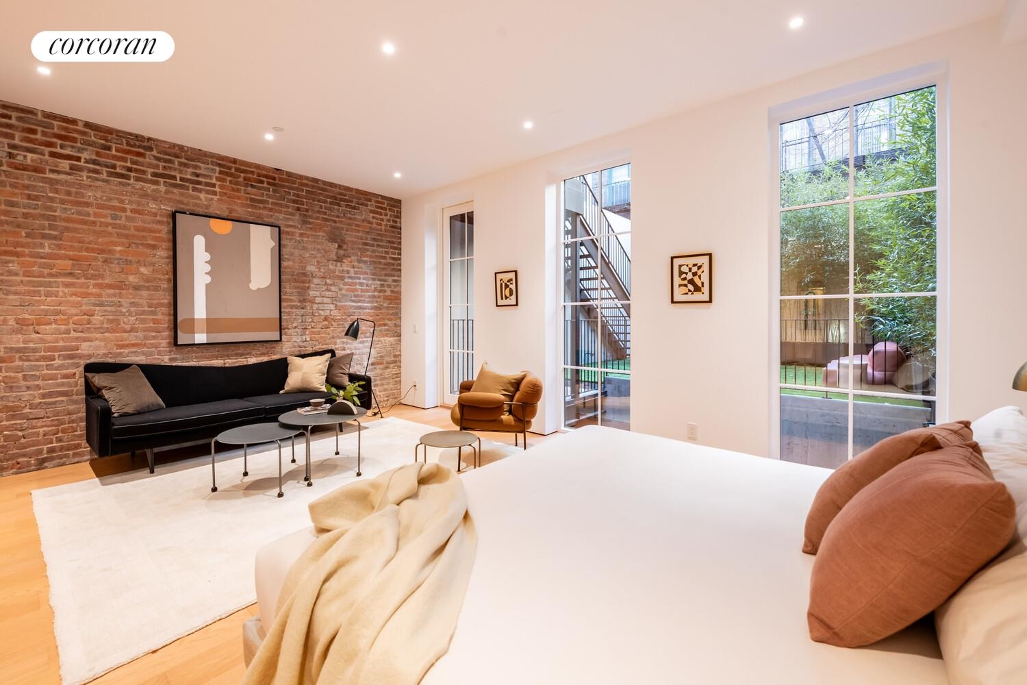 The garden level is dedicated to private living and features two oversized bedroom suites, offering comfort and scale more commonly associated with single-family homes. The north-facing primary suite opens directly to the massive private garden, creating a rare indoor-outdoor experience. At nearly 20 feet wide, the suite spans the full width of the house and functions as a true retreat, complete with oversized windows, dual walk-in closets, and a spa-like en-suite bath with a freestanding soaking tub, walk-in shower, water closet, and refined finishes. The second bedroom suite, located on the south side of the home, also includes a large sleeping area, walk-in closet, and a full en-suite bath. A washer and vented dryer complete the level.