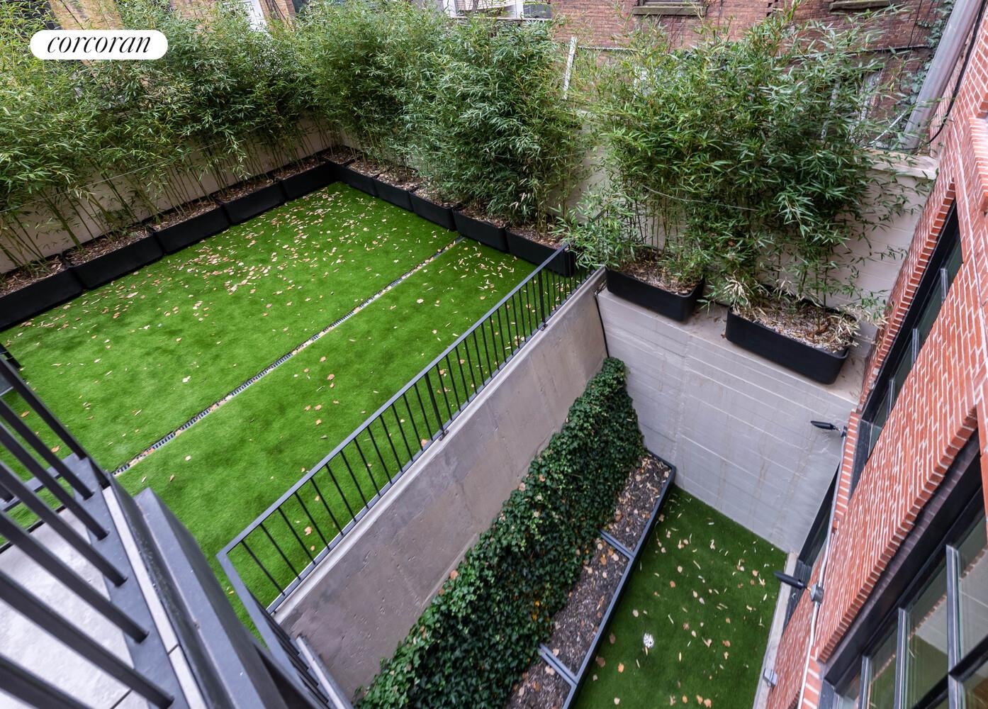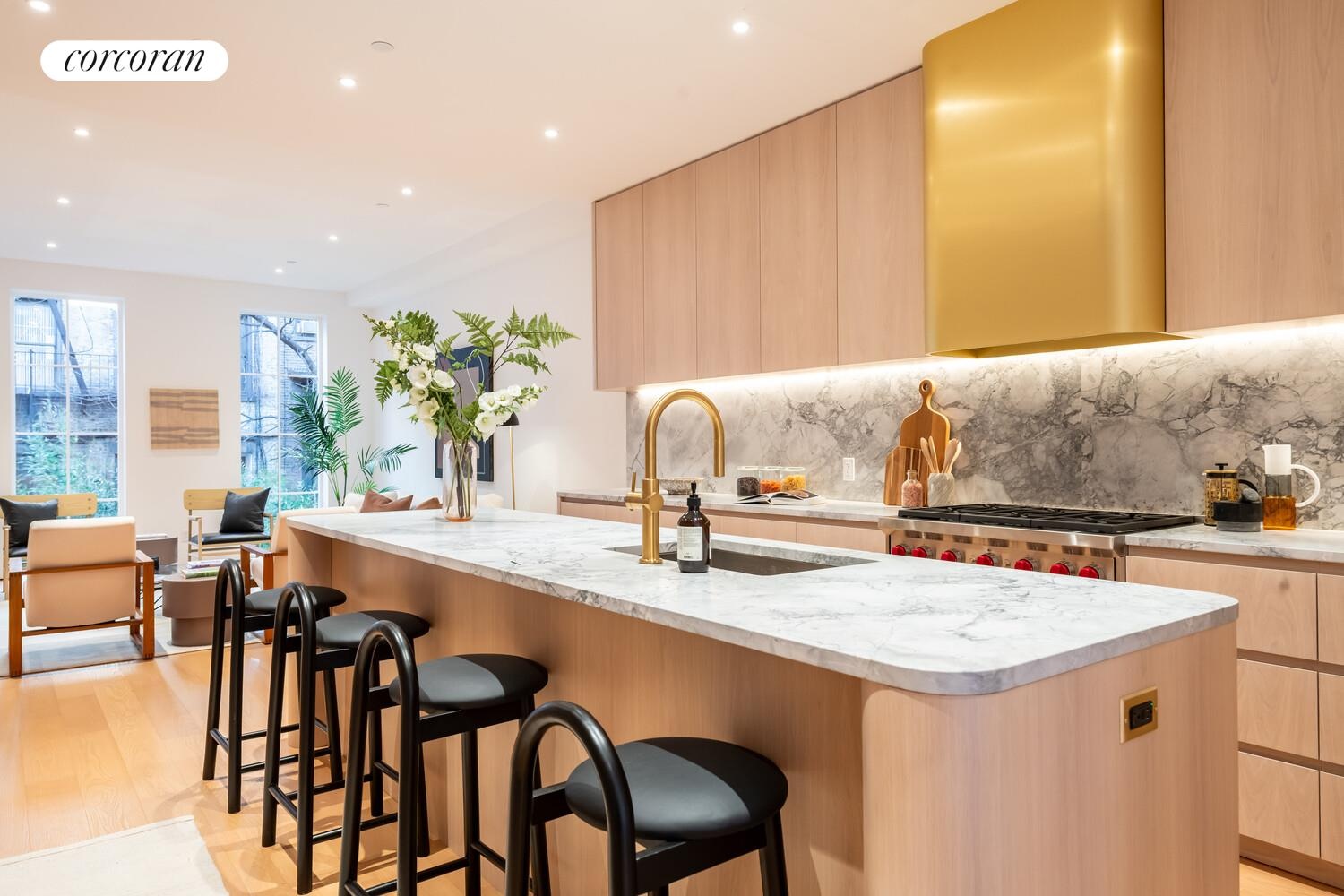 Ascending the classic brownstone stoop, the entryway opens onto an entire floor devoted to entertaining. With both north- and south-facing floor-to-ceiling windows, the parlor level features an expansive kitchen with a central island and exceptional storage, including custom cabinetry, pantries, and integrated closets. Truly the heart of the home, it is designed for both daily living and hosting. Custom millwork, brass fixtures, and a premium appliance package, including a wine refrigerator, anchor the space, while generous proportions allow for a seamless flow between areas. Moving through the kitchen, the space opens into a light-filled living room, with views of lush greenery and access to the home's private garden, bordered by mature bamboo plants, perfect for escaping the city, hosting, or dining al fresco.