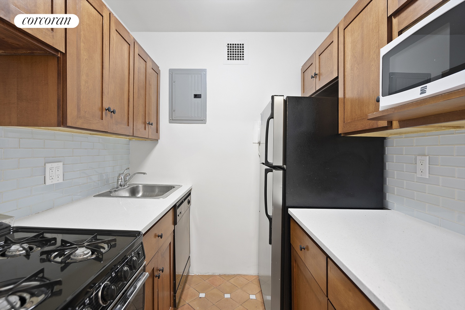 The galley kitchen is outfitted with generous cabinetry, ample counter space, and a dishwasher, ideal for both everyday use and entertaining. The bathroom has been tastefully updated, completing this move-in ready residence.