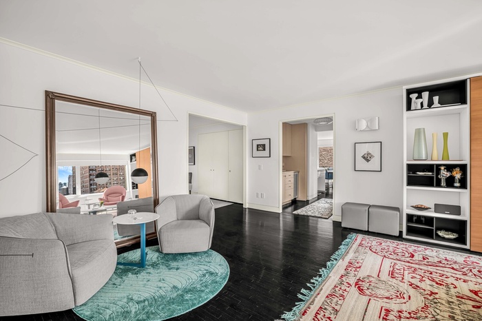 Ideally situated in the heart of the Upper East Side, this sun-filled apartment boasts expansive south and east facing city views through oversized tilt-and-turn windows. A gracious entry foyer, complete with generous closet space and a full bathroom, sets the tone and leads into a spacious living room-perfect for relaxing or hosting guests. Just off the living area, a stylish wet bar with a wine fridge and additional storage enhances the home's entertaining appeal.