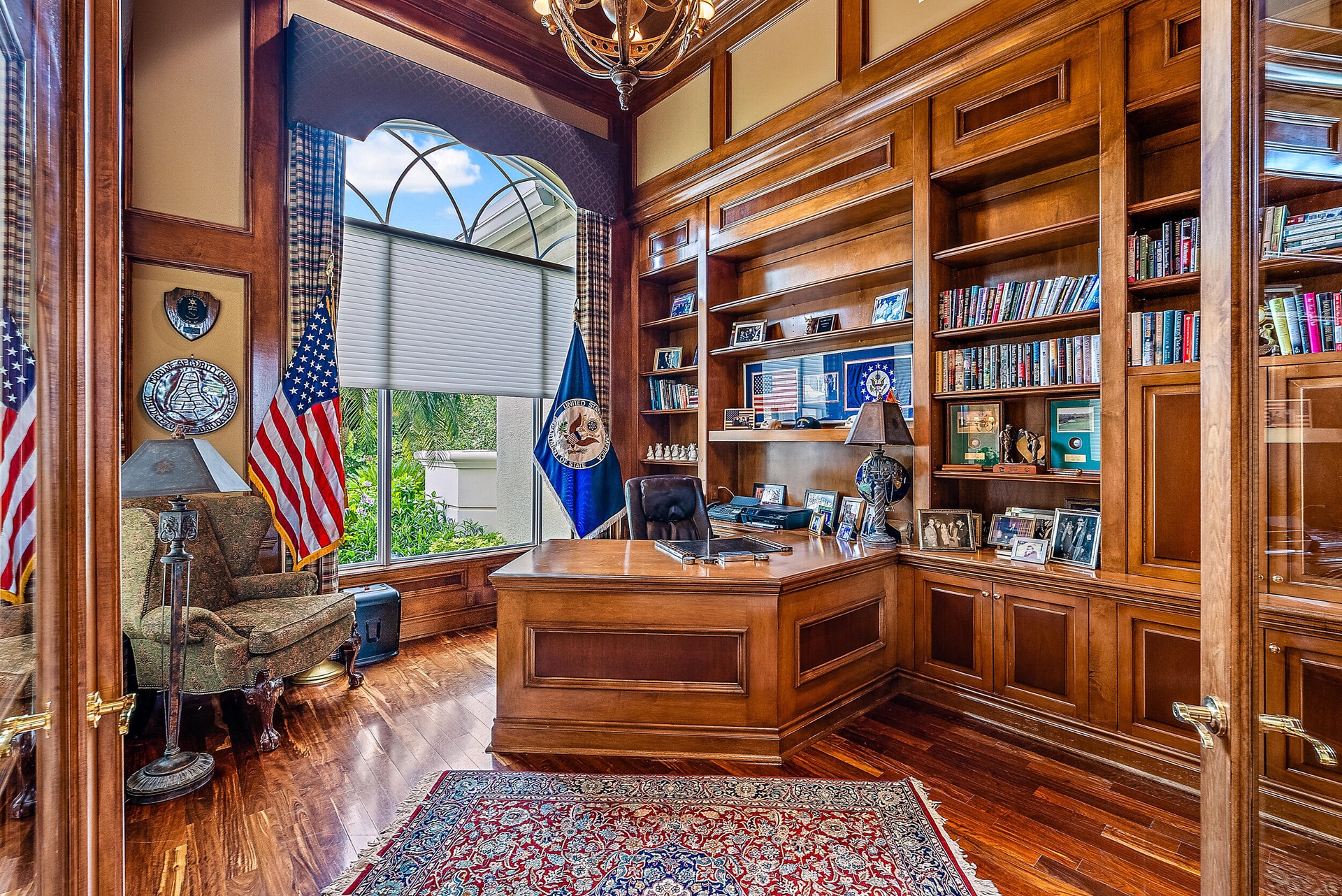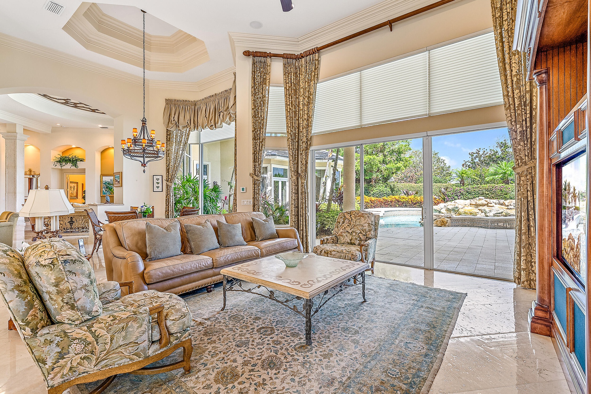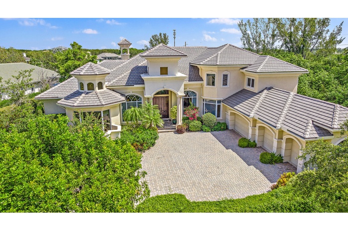 Situated on Intracoastal Terrace in a unique private setting, this home offers a new family endless opportunity. Every option for entertaining family and friends can be accommodated in this fabulous enclave. With more than 7,700 sq. ft. under air there is space for the largest of family gatherings and reunions. The ground level offers three ensuite bedrooms. The primary suite is an oasis of tranquility, tucked away in its own wing. Presenting a lovely sitting room, his and her baths and enchanting views of the gardens and pool. Two very large walk-in closets complete the suite. The common space, formal living room, family room and dining room boast light-filled rooms and sparkling views. A large richly paneled library is perfect for reading a book, paying the bills or watching golf. Two additional ensuite bedrooms are located on the second level for a total of five ensuite bedrooms. A large three car garage and expansive storage make this home complete. All this just a short golf cart ride to the first tee, fitness center and practice tee. Come home to the Jupiter Hills lifestyle!