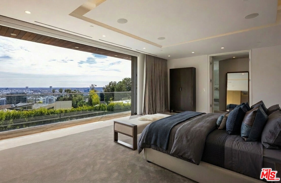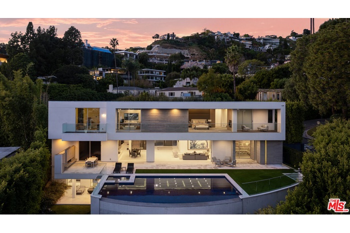 Perched on a secluded promontory above the Sunset Strip, this striking modern residence, newly constructed in 2020, is situated behind mature hedges, offering the utmost privacy, with unobstructed views of Los Angeles and beyond. Designed with California's signature indoor-outdoor flow, the three-level home artfully balances intimate retreats with grand-scale entertaining spaces. The gated entry, recently enhanced with expanded parking, leads to a dramatic double-height foyer that opens into voluminous living and dining areas. Expansive Fleetwood glass doors dissolve the boundaries between interior and exterior, framing the sweeping cityscape as they open to an infinity-edged pool and terrace that seem to float above the city below. The primary suite is a serene sanctuary unto itself, complete with a fireside sitting area, a private balcony overlooking the Los Angeles basin, dual dressing rooms, and spa-inspired dual bathrooms. For entertainment, the 12-seat private theater with its 20-foot screen and a 1,200-bottle wine cellar sets a standard rarely found even at this level. Additional amenities include a family room, office, library, open-concept kitchen with Miele appliances, a separate chef's kitchen, gym, three-floor elevator, full Crestron automation, and a four-car garage. Spanning approximately 10,500 square feet, this is a rare opportunity to own one of the most coveted modern estates in West Hollywood, just moments from the Sunset Strip's premier dining, shopping, and cultural destinations. A refined architectural statement where privacy, unobstructed views of Los Angeles, and effortless California living converge. A property of this caliber is best experienced in person.