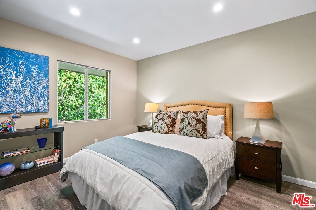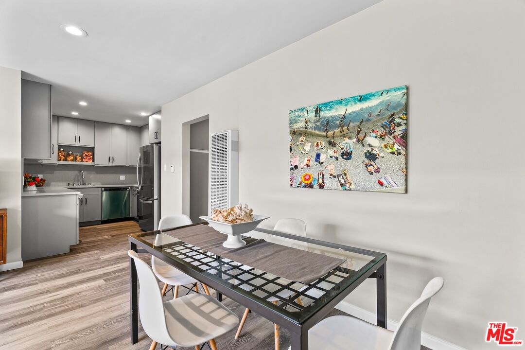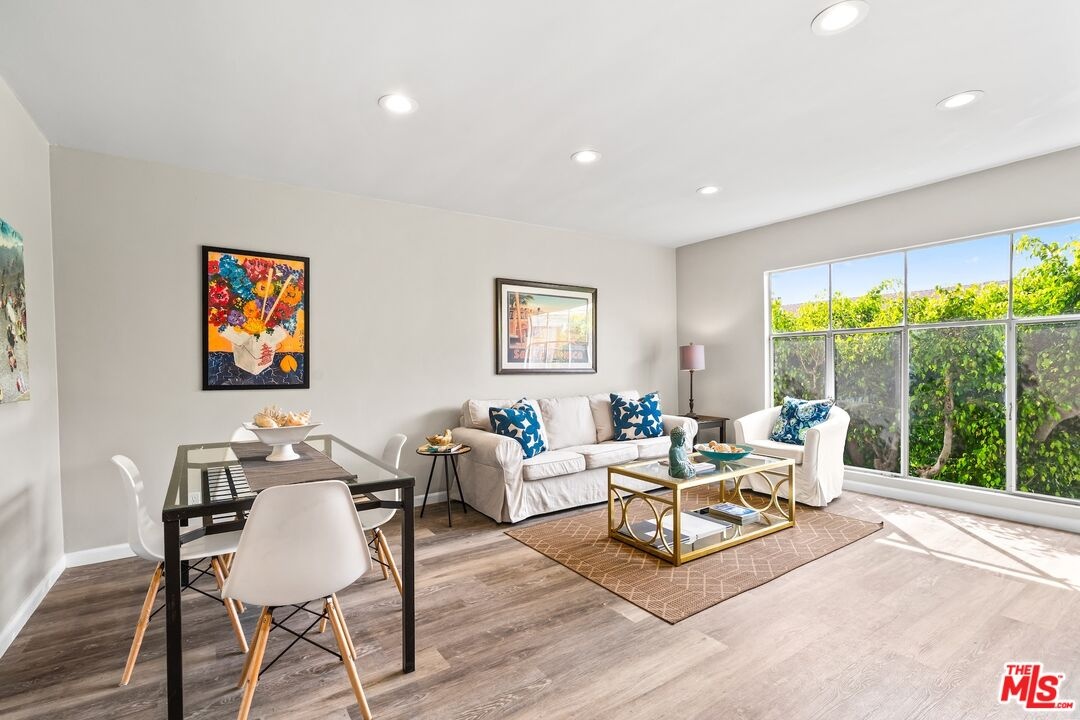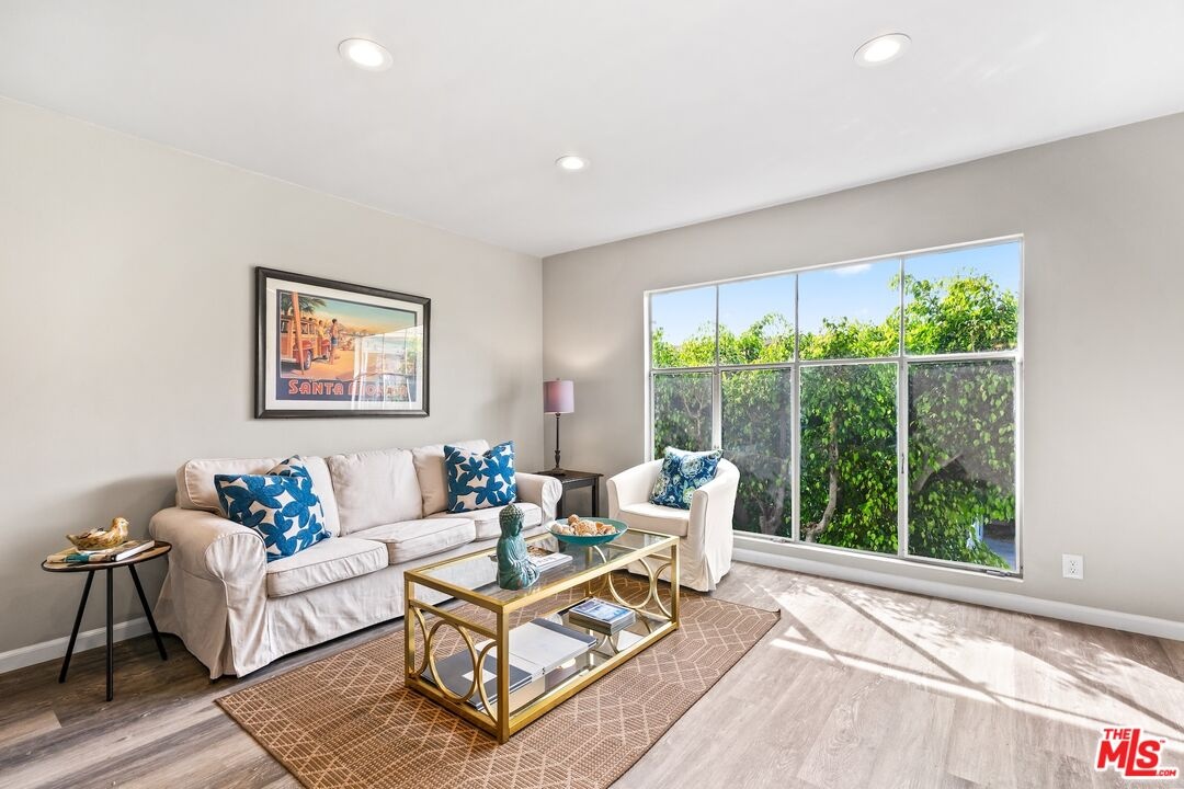 Experience the pinnacle of Santa Monica's coastal contemporary lifestyle in this impeccably modernized 2-bedroom residence. Spanning approximately 800 square feet, the home features a light-filled, airy floor plan that maximizes space and draws the eye toward tranquil views of lush exterior greenery. The interior transformation is defined by sleek wood-style flooring and recessed lighting, leading into a streamlined kitchen equipped with a cohesive stainless steel appliance suite, elegant stone counters, and an integrated breakfast bar. A thoughtfully designed split-bedroom layout ensures maximum privacy, with each room framed by views of established foliage. The updated bathroom mirrors this modern aesthetic with sophisticated finishes and clean, minimalist lines.