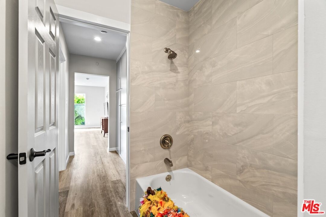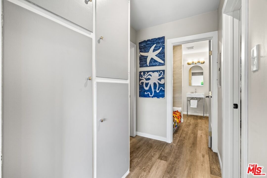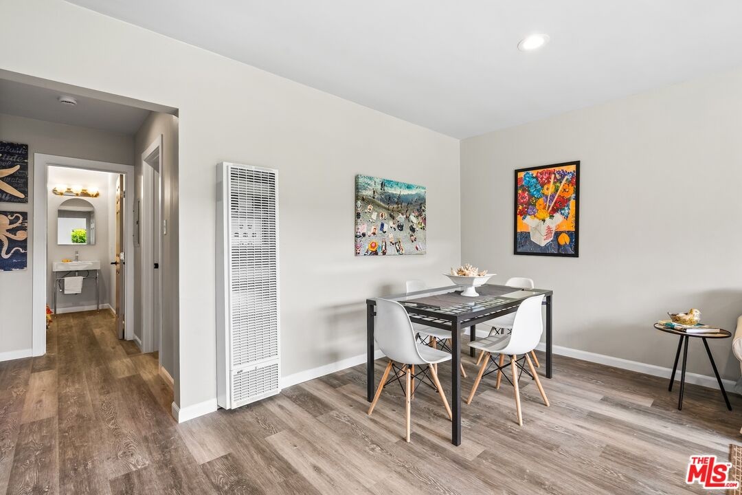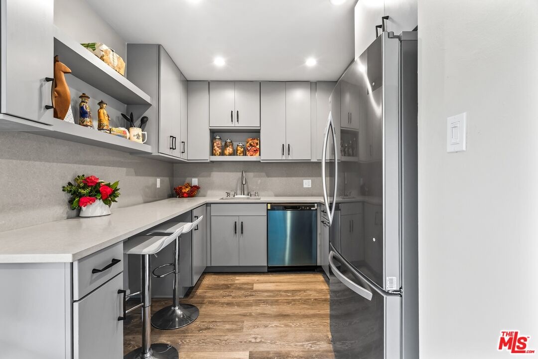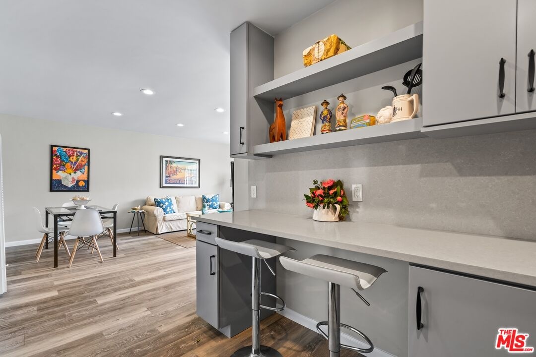 Experience the pinnacle of Santa Monica's coastal contemporary lifestyle in this impeccably modernized 2-bedroom residence. Spanning approximately 800 square feet, the home features a light-filled, airy floor plan that maximizes space and draws the eye toward tranquil views of lush exterior greenery. The interior transformation is defined by sleek wood-style flooring and recessed lighting, leading into a streamlined kitchen equipped with a cohesive stainless steel appliance suite, elegant stone counters, and an integrated breakfast bar. A thoughtfully designed split-bedroom layout ensures maximum privacy, with each room framed by views of established foliage. The updated bathroom mirrors this modern aesthetic with sophisticated finishes and clean, minimalist lines.