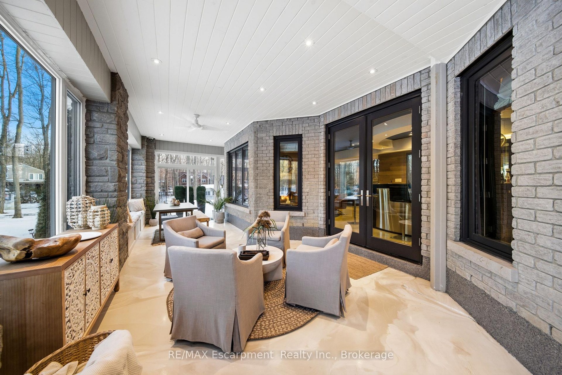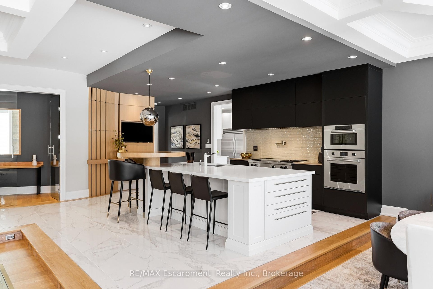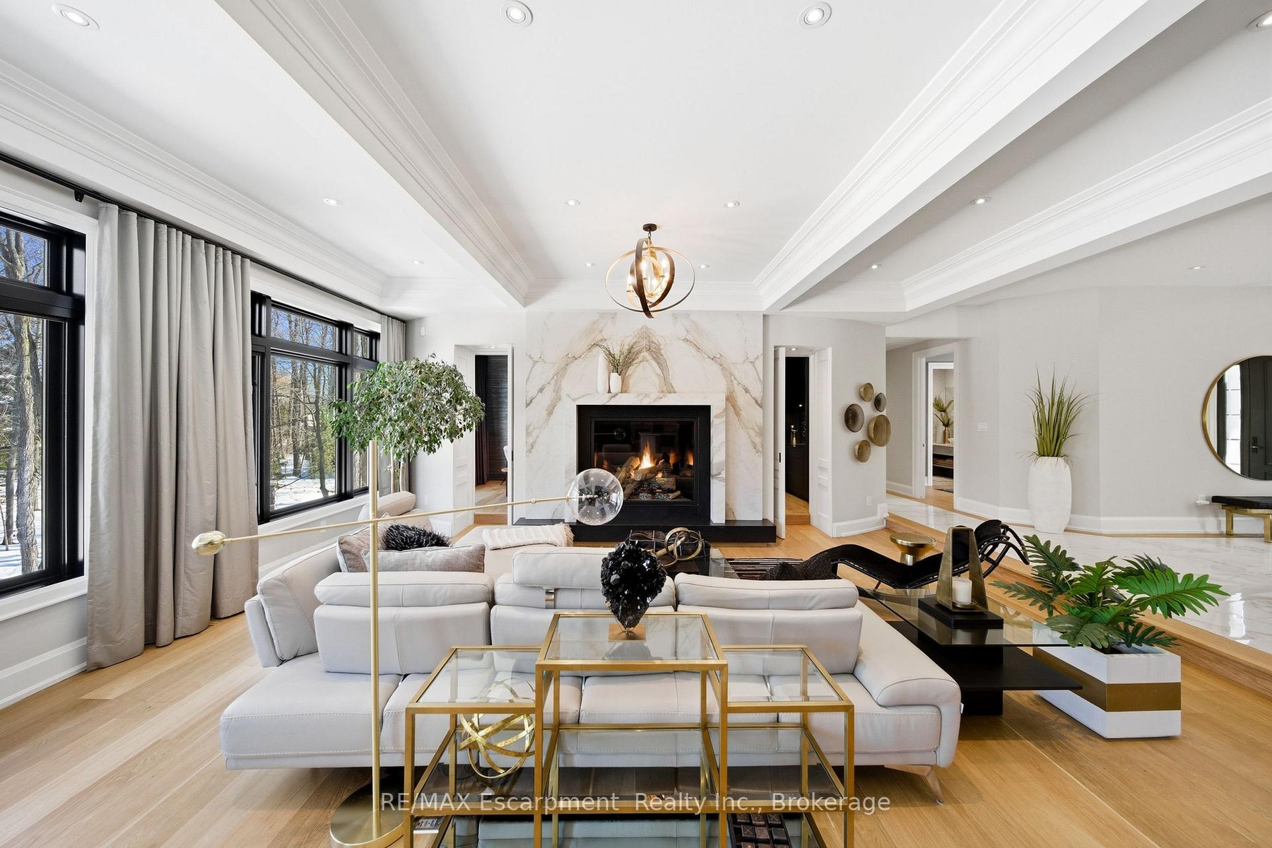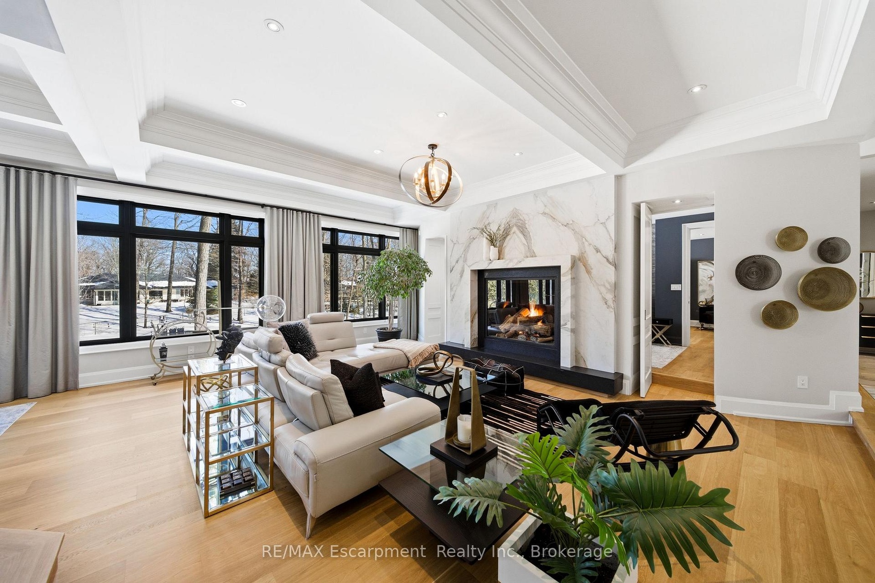 Rare offering on 2 private acres in one of Burlington's most sought after estate communities. Fully renovated bungalow with over 6,000 sq ft of finished living space, beautifully designed for everyday living, entertaining, and long term flexibility. An incredible chef's style kitchen features Wolf and SubZero appliances and a large multifunction island while the separate prep kitchen is ideal for everyday use with a direct walkout to an elevated patio overlooking the pool and landscaped grounds. The open concept living and dining areas are bright, inviting, and flow naturally for both daily life and hosting. The main level includes a beautiful primary suite with a spa-like ensuite, an additional bedroom, and a private office, creating a layout that works just as well years from now as it does today. The lower level is a standout, offering additional bedrooms, a gym, and a large recreation space with custom bar, ideal for entertaining or giving older kids and guests their own space. Outside, the property is truly special. A saltwater pool, multiple cabanas, outdoor kitchen, fireplace, hot tub, and expansive grass and treed areas create a private setting that is hard to find within Burlington. A fully separate coach house offers incredible flexibility with its own kitchen, bedroom, and bathrooms, ideal for extended family, guests, or live in support. Rare lower level garage parking for up to five vehicles, in addition to the attached garage and large driveway. A beautifully finished estate property offering space, privacy, and a level of functionality that is rarely available within the city.