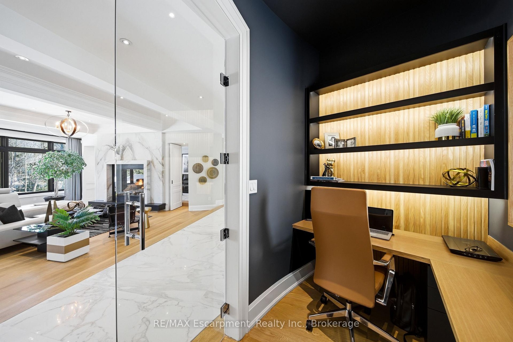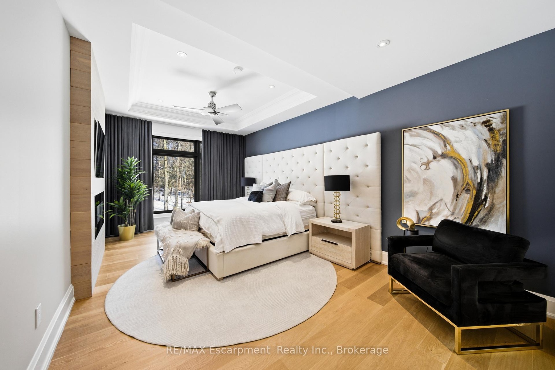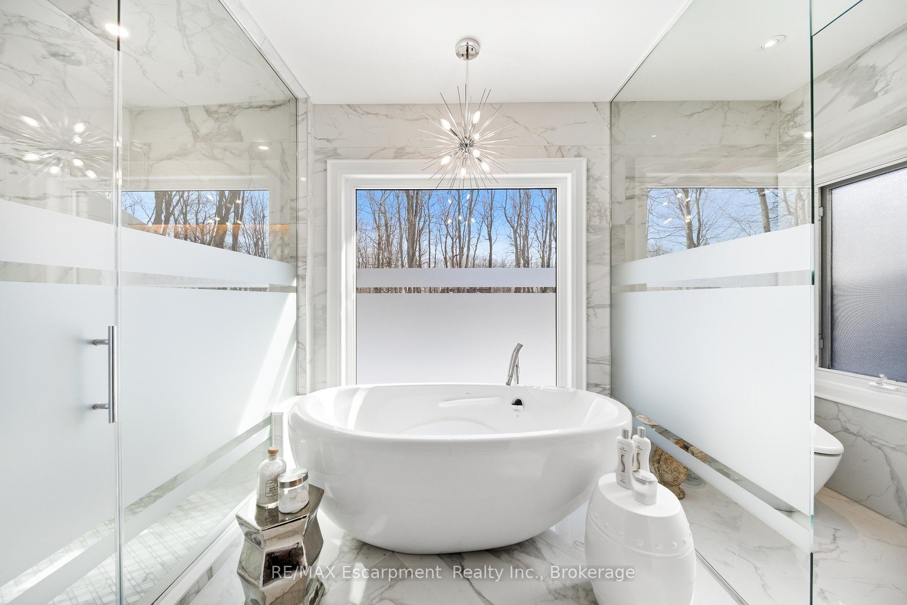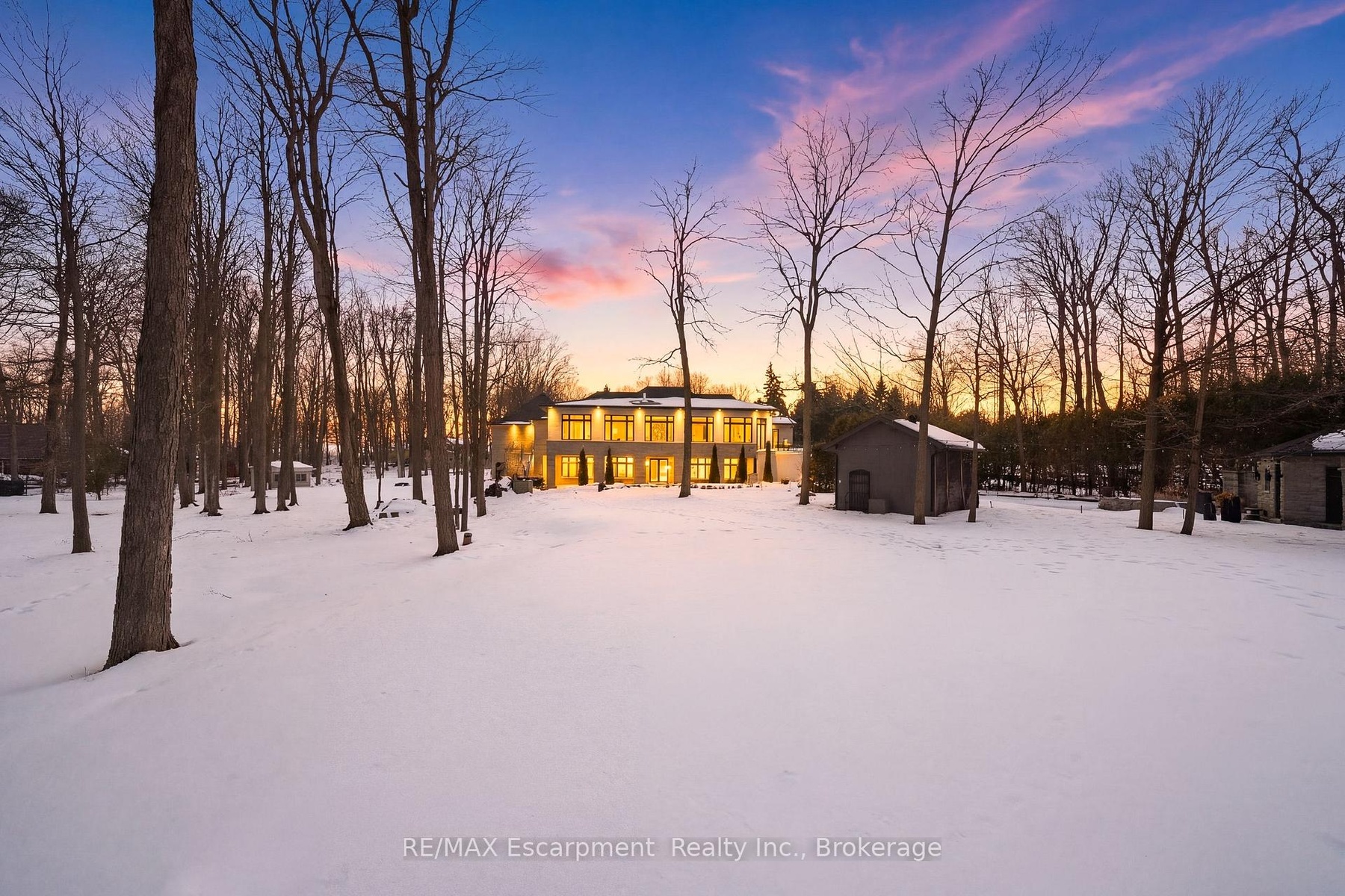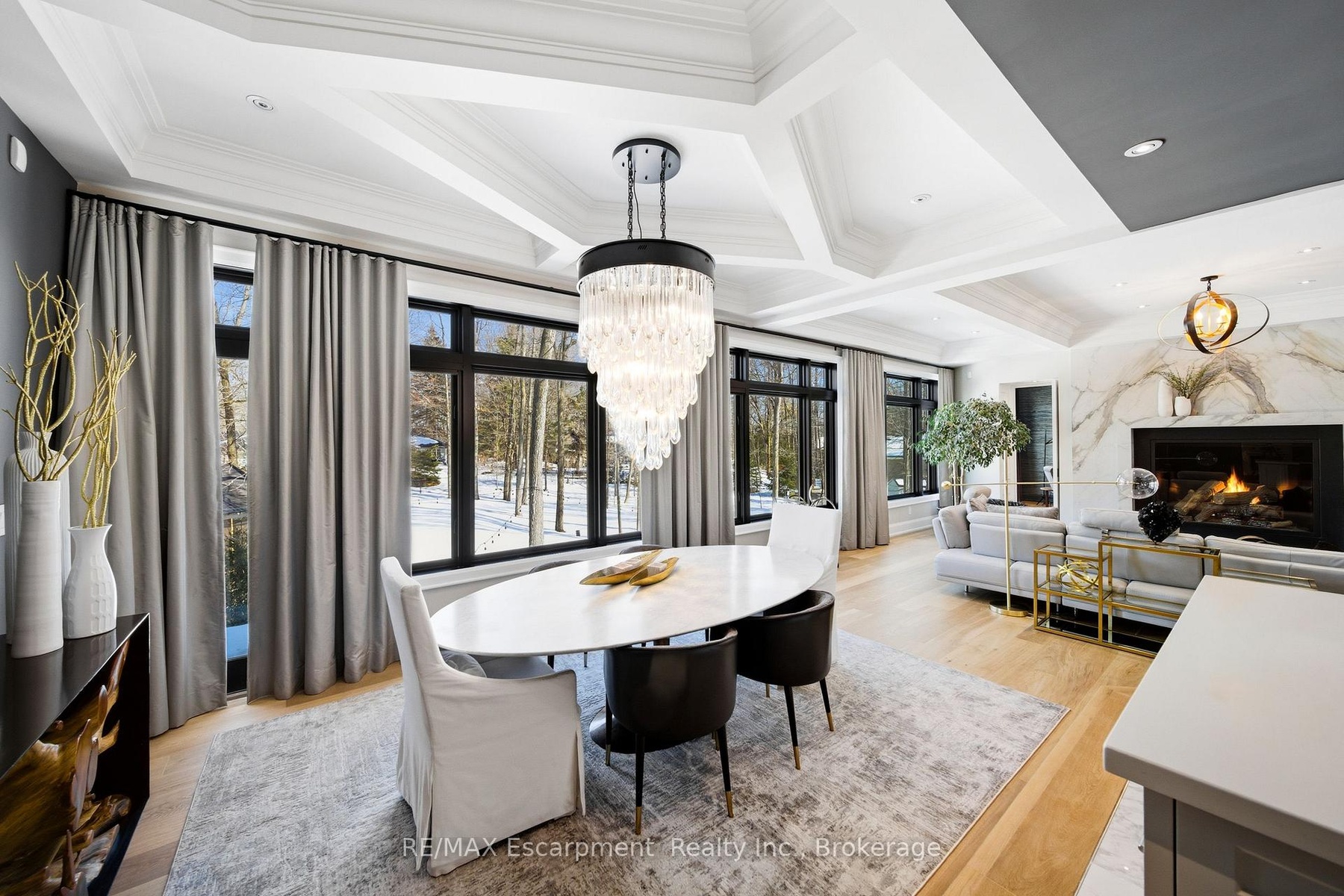 Rare offering on 2 private acres in one of Burlington's most sought after estate communities. Fully renovated bungalow with over 6,000 sq ft of finished living space, beautifully designed for everyday living, entertaining, and long term flexibility. An incredible chef's style kitchen features Wolf and SubZero appliances and a large multifunction island while the separate prep kitchen is ideal for everyday use with a direct walkout to an elevated patio overlooking the pool and landscaped grounds. The open concept living and dining areas are bright, inviting, and flow naturally for both daily life and hosting. The main level includes a beautiful primary suite with a spa-like ensuite, an additional bedroom, and a private office, creating a layout that works just as well years from now as it does today. The lower level is a standout, offering additional bedrooms, a gym, and a large recreation space with custom bar, ideal for entertaining or giving older kids and guests their own space. Outside, the property is truly special. A saltwater pool, multiple cabanas, outdoor kitchen, fireplace, hot tub, and expansive grass and treed areas create a private setting that is hard to find within Burlington. A fully separate coach house offers incredible flexibility with its own kitchen, bedroom, and bathrooms, ideal for extended family, guests, or live in support. Rare lower level garage parking for up to five vehicles, in addition to the attached garage and large driveway. A beautifully finished estate property offering space, privacy, and a level of functionality that is rarely available within the city.