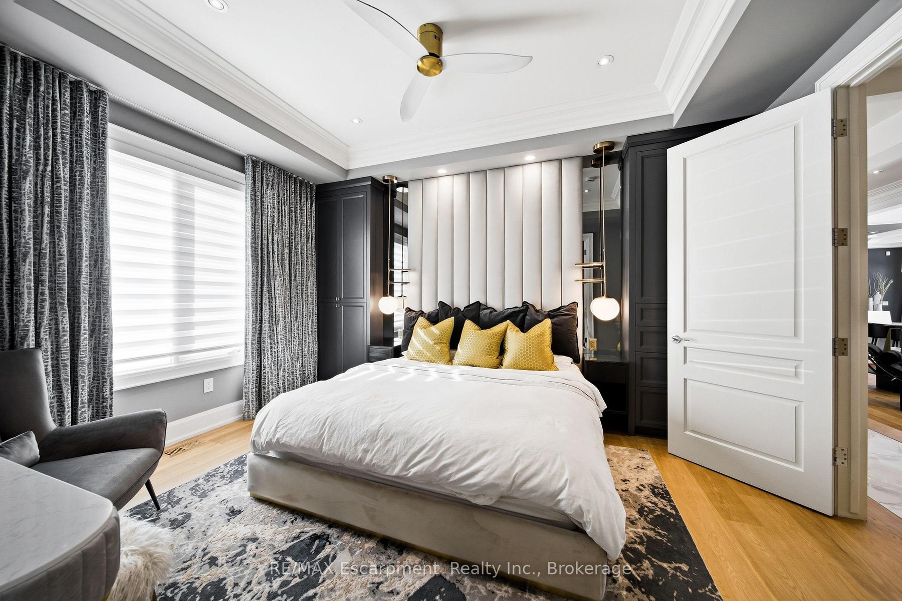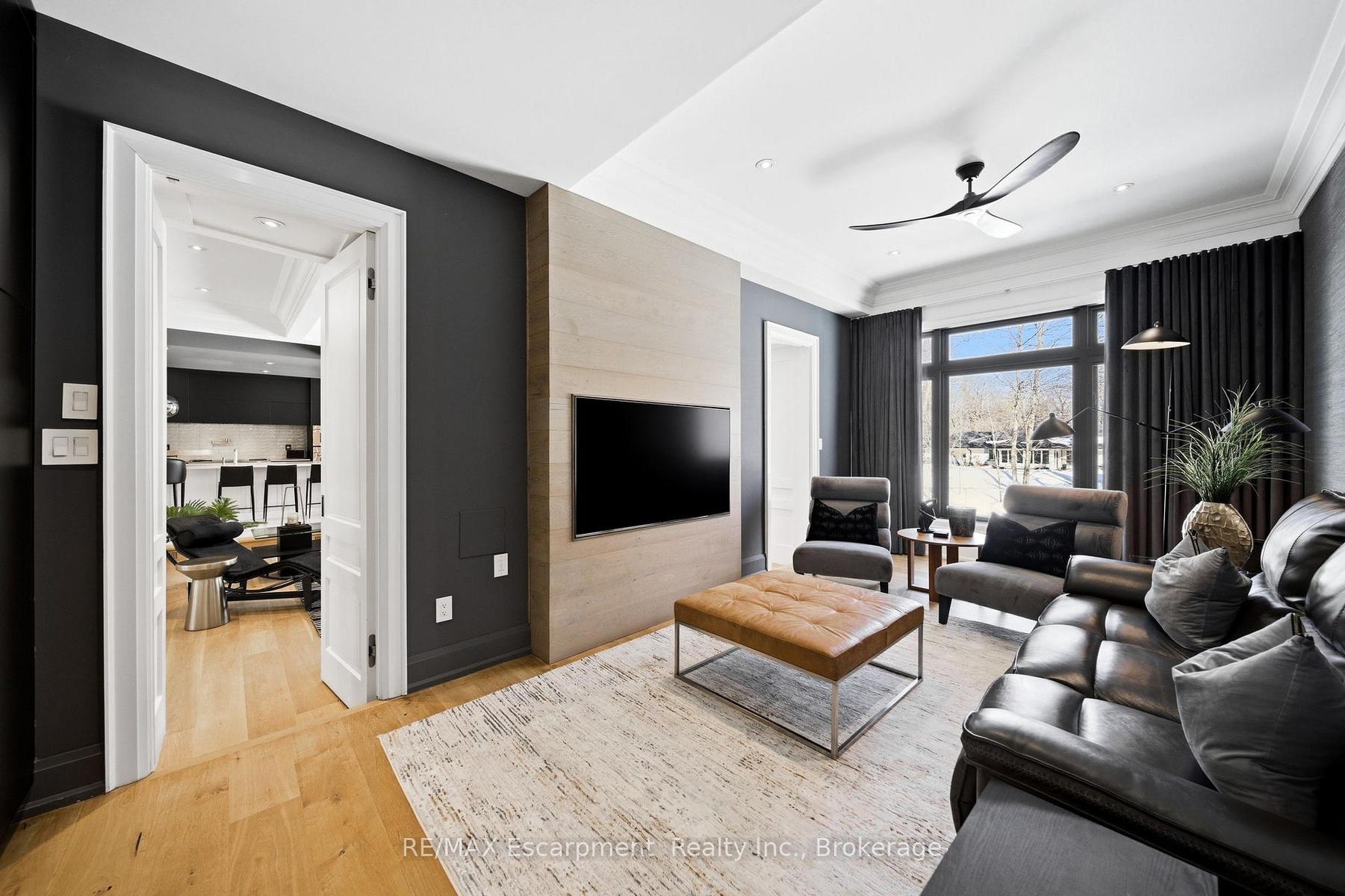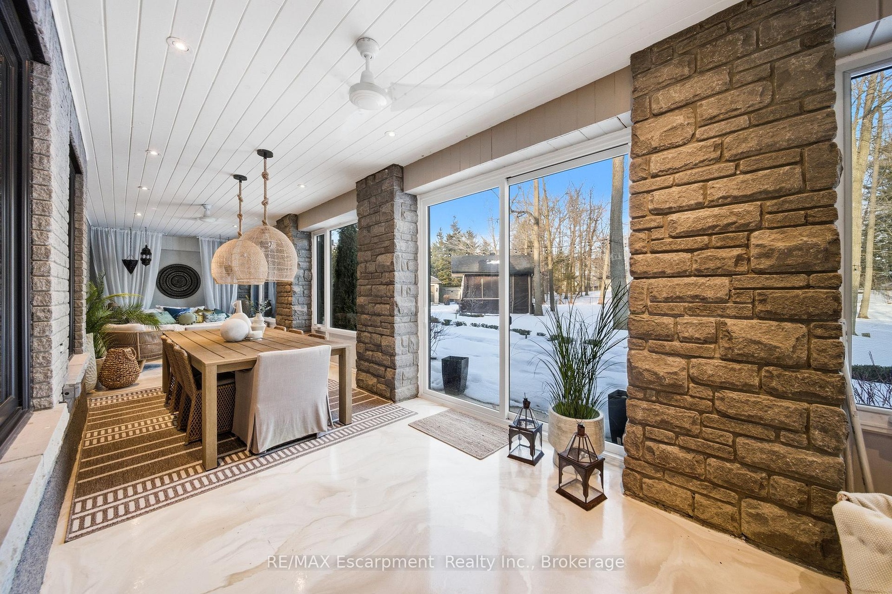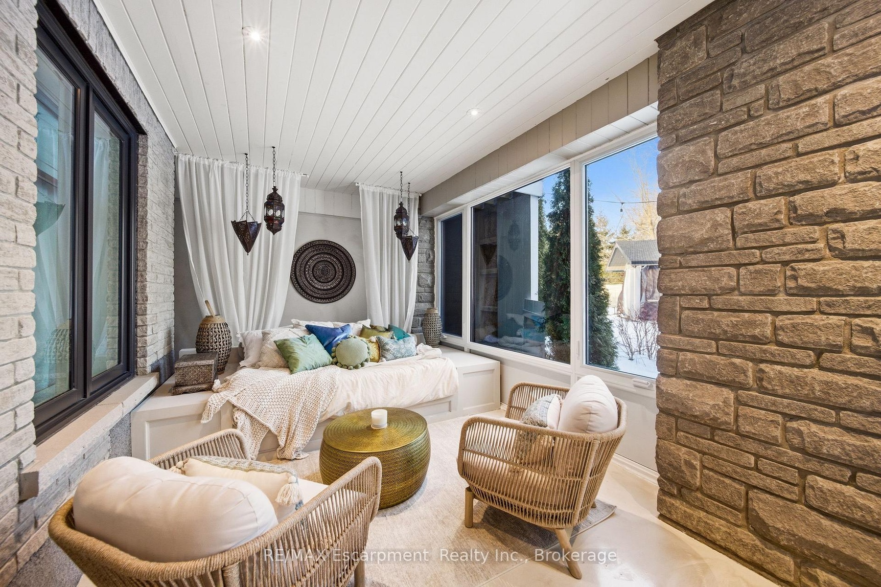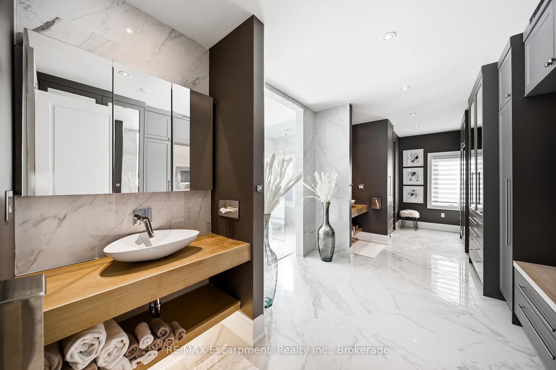 Rare offering on 2 private acres in one of Burlington's most sought after estate communities. Fully renovated bungalow with over 6,000 sq ft of finished living space, beautifully designed for everyday living, entertaining, and long term flexibility. An incredible chef's style kitchen features Wolf and SubZero appliances and a large multifunction island while the separate prep kitchen is ideal for everyday use with a direct walkout to an elevated patio overlooking the pool and landscaped grounds. The open concept living and dining areas are bright, inviting, and flow naturally for both daily life and hosting. The main level includes a beautiful primary suite with a spa-like ensuite, an additional bedroom, and a private office, creating a layout that works just as well years from now as it does today. The lower level is a standout, offering additional bedrooms, a gym, and a large recreation space with custom bar, ideal for entertaining or giving older kids and guests their own space. Outside, the property is truly special. A saltwater pool, multiple cabanas, outdoor kitchen, fireplace, hot tub, and expansive grass and treed areas create a private setting that is hard to find within Burlington. A fully separate coach house offers incredible flexibility with its own kitchen, bedroom, and bathrooms, ideal for extended family, guests, or live in support. Rare lower level garage parking for up to five vehicles, in addition to the attached garage and large driveway. A beautifully finished estate property offering space, privacy, and a level of functionality that is rarely available within the city.