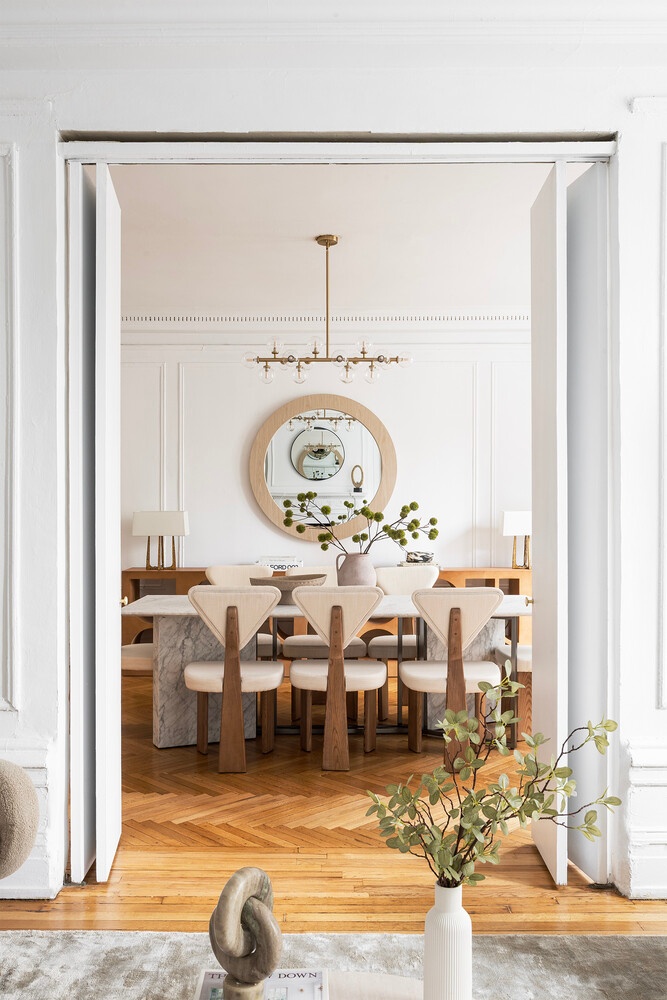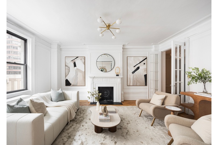 Off a semi-private elevator landing, one enters Apartment 3E into a gracious entrance gallery that immediately showcases the home's beautiful hardwood floors, high ceilings, decorative moldings, and natural light. The airy living and dining room flow seamlessly together with the living room centering around a beautiful decorative fireplace and large windows. The dining room can comfortably seat 12 or more. These spaces are perfect for both everyday living and formal entertaining.