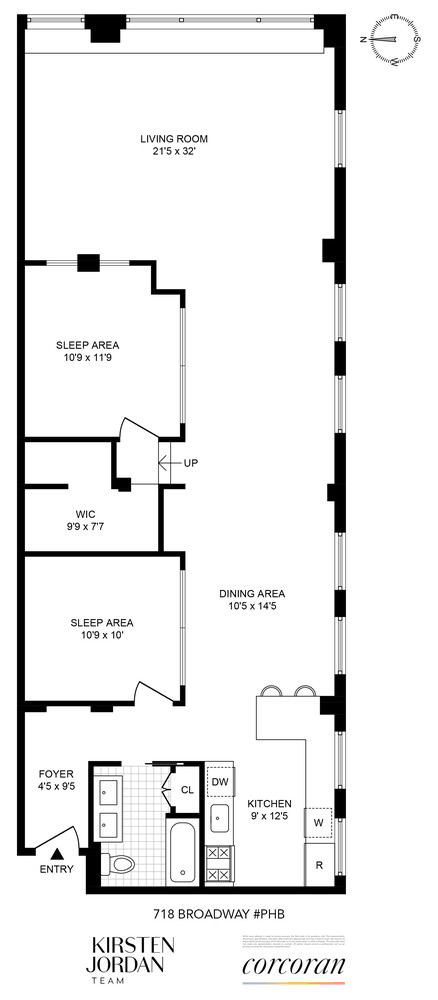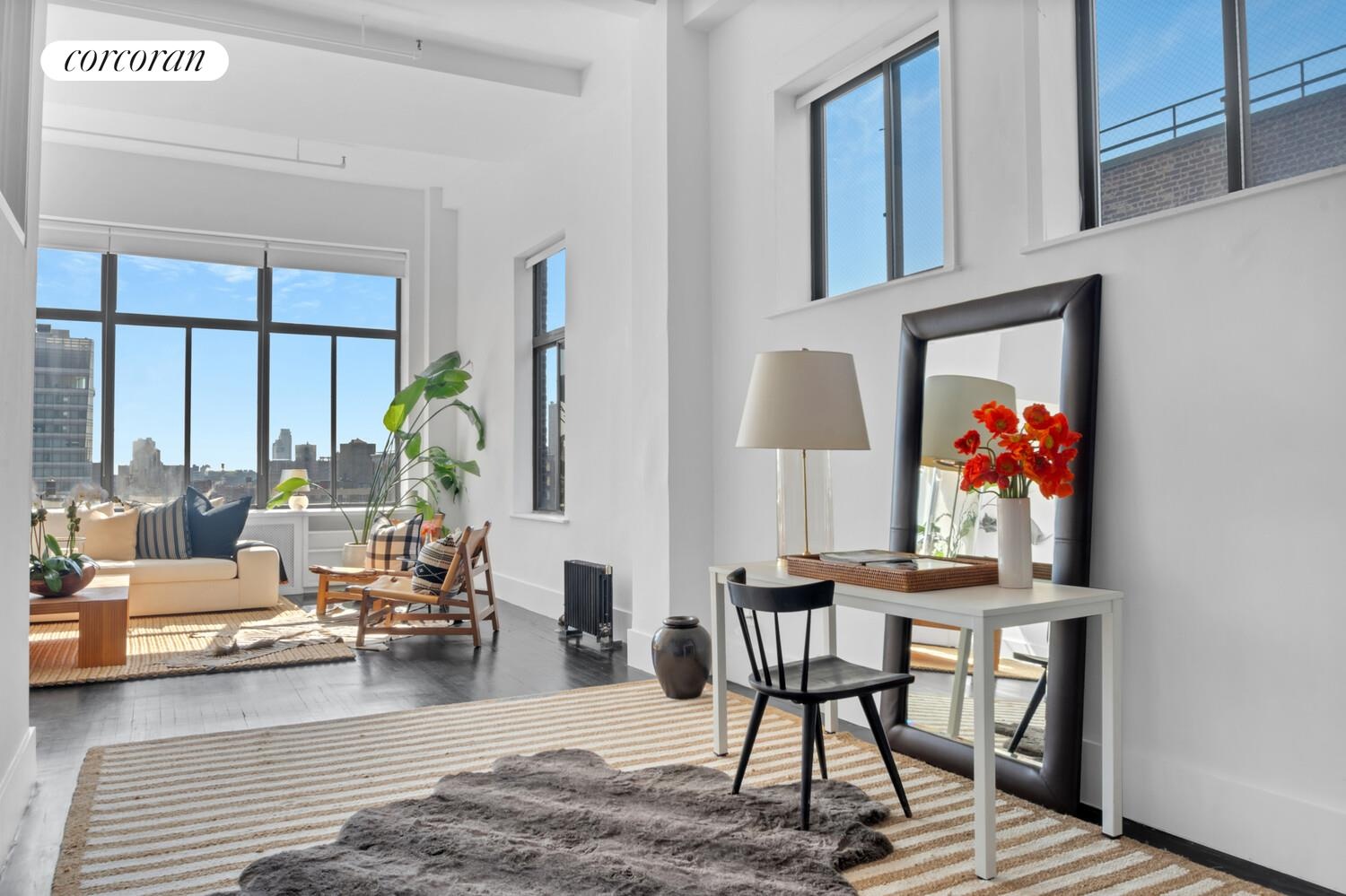 A formal foyer leads seamlessly to the open living and dining space where you are greeted by 13- foot ceilings and an abundance of natural light. The corner living room is spacious and provides both eastern and southern exposures through its oversized windows, allowing natural light to flood in all day long.