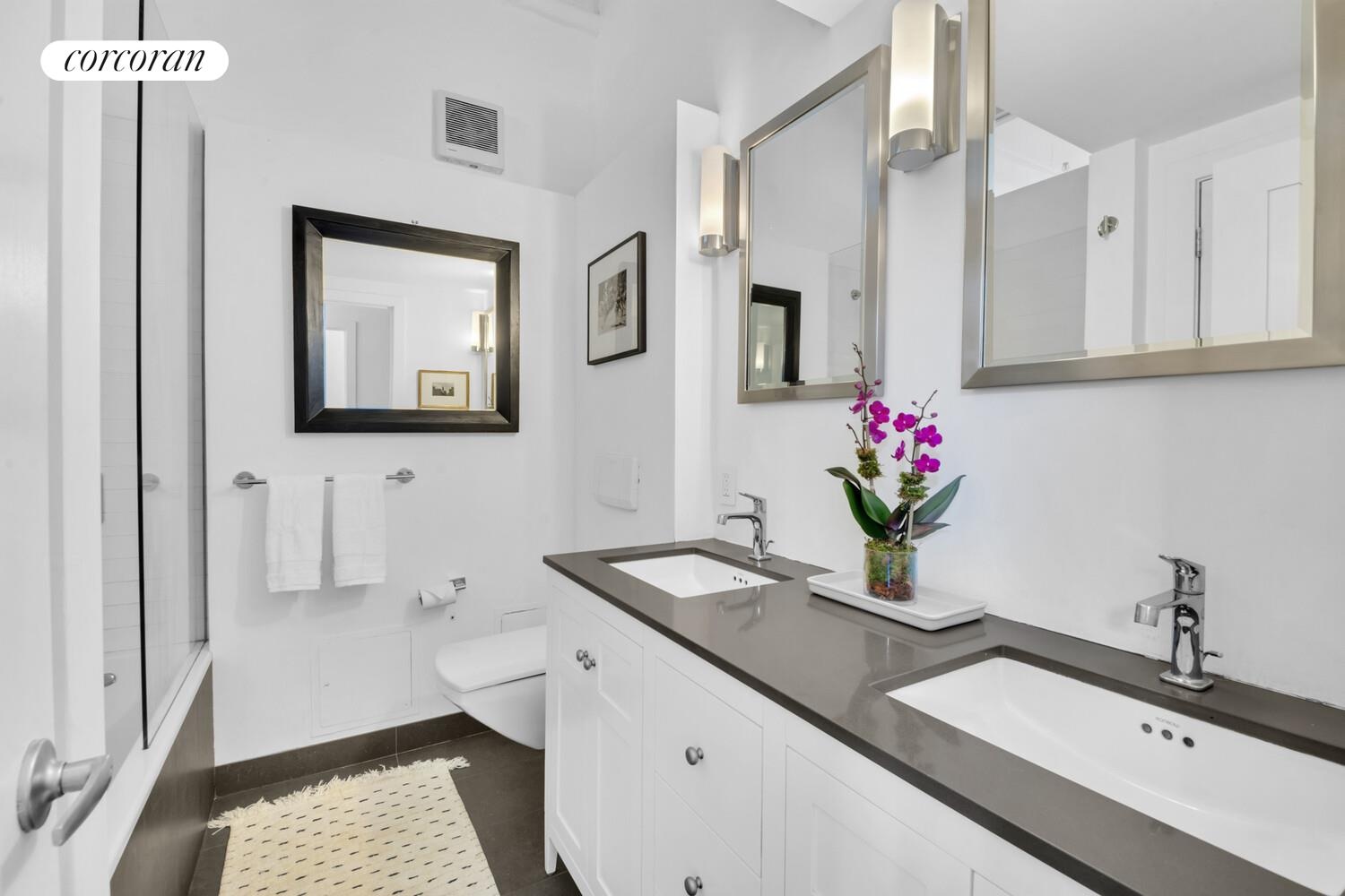 This meticulously maintained loft is currently configured as a two bedroom, one bathroom home. The primary bedroom is a true haven, accommodating a king-sized bed and featuring a fully built-out walk-in closet. The second bedroom offers versatility, perfect for accommodating guests or serving as a home office. Conveniently located directly across the hall from the second bedroom is the spa-like bathroom which is complete with a double sink, glass-enclosed shower, a closet, and ample storage space under the sinks.