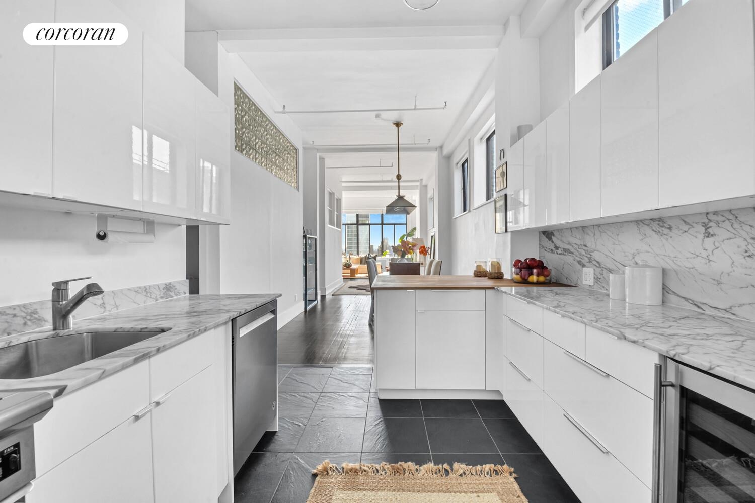 The windowed chef's kitchen is open to the dining area and features Italian marble countertops, a brand new hardwood island with bar seating, Sub-zero refrigerator, Wolf stove, and GE Monogram wine fridge. Central AC and hardwood floors make this loft a rare find.