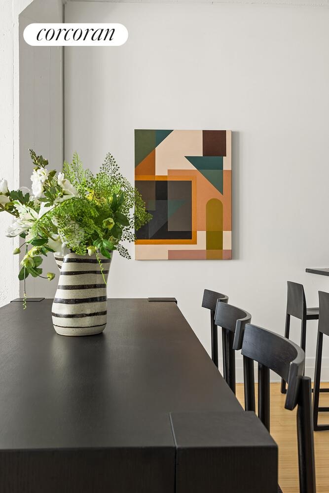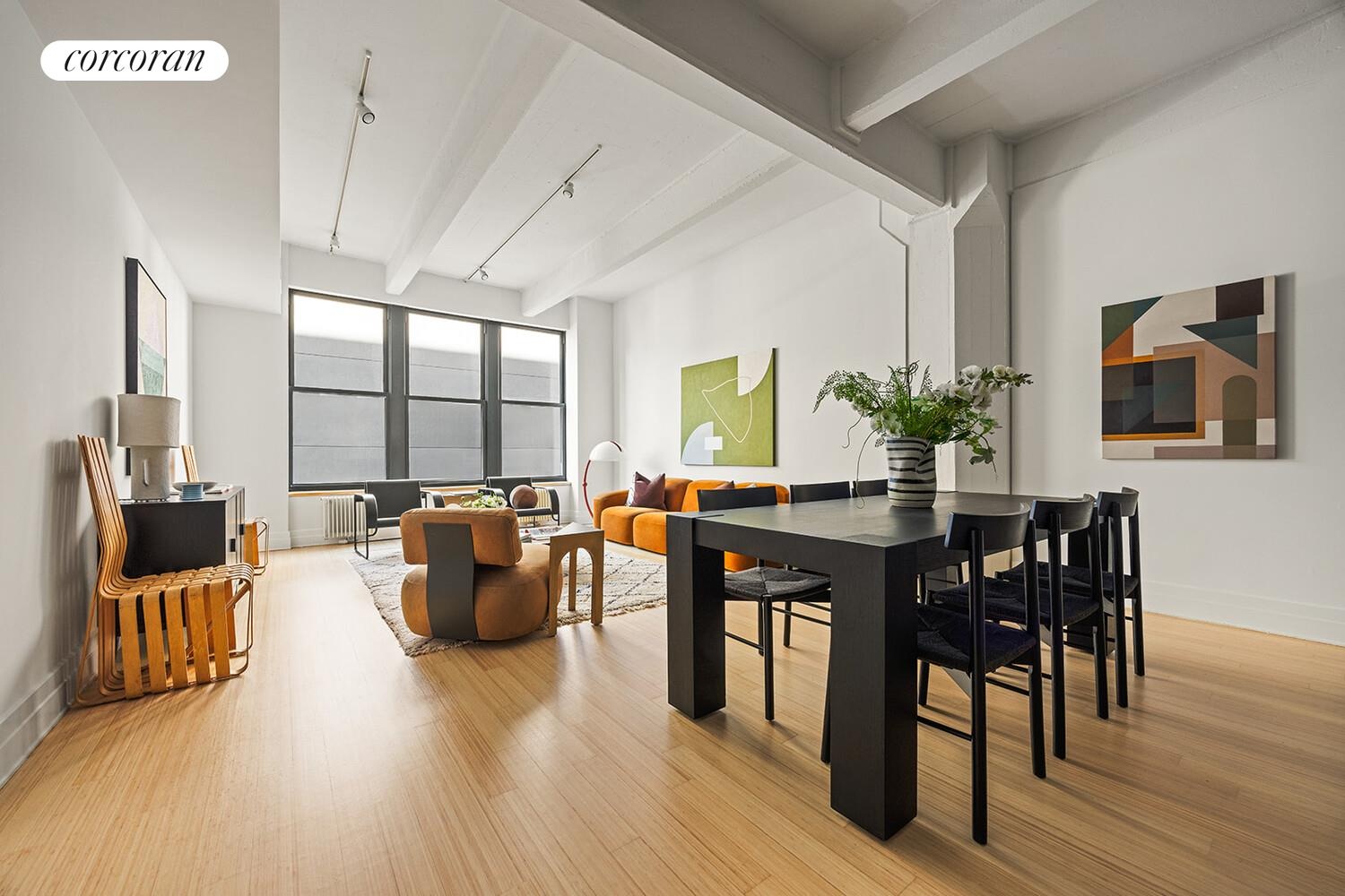 Framed by oversized windows and soaring 11-foot concrete-beamed ceilings, the residence is filled with natural light and a sense of openness that defines true loft living. Warm, refinished bamboo flooring runs throughout, grounding the space and creating an inviting, livable backdrop. The scale of the home allows for distinct living and dining areas, a seamless flow for effortless entertaining.