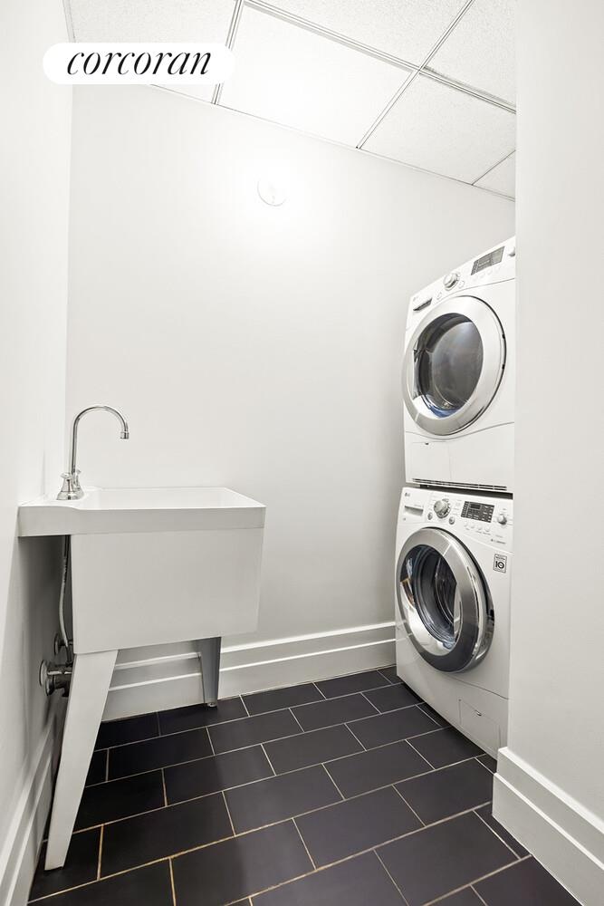 The bathroom is designed as a calming retreat with a deep Jacuzzi soaking tub, a separate glass-enclosed shower, and a clean, timeless finish palette. A dedicated laundry room, complete with an in-unit washer and dryer and a utility sink, adds a rare layer of convenience.