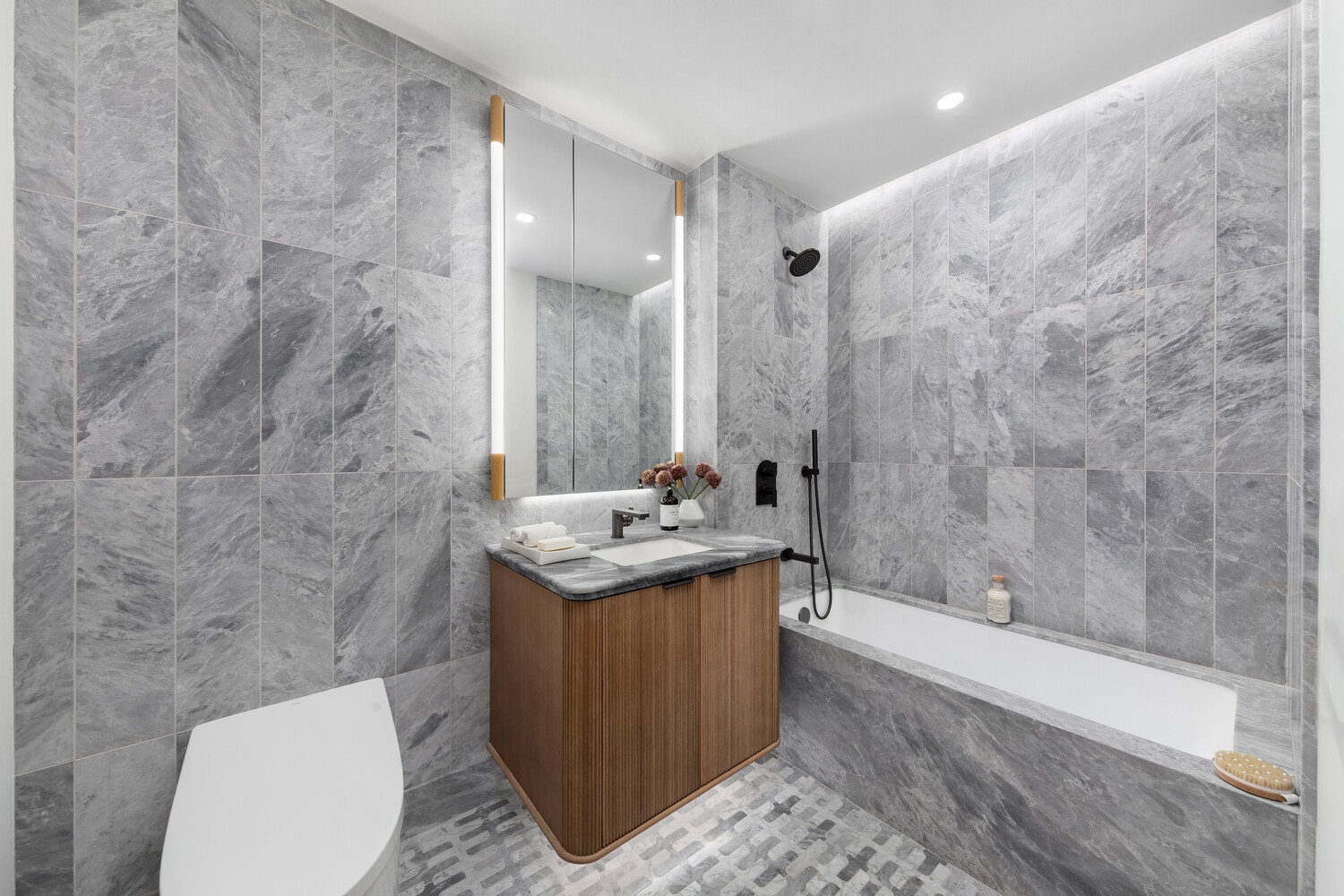 The bedroom includes a built-in reach-in closet and adjoins a pristine full bathroom with a floating oak tambour and Bardiglio Trambisera marble vanity and an automatic TOTO Neorest toilet. Additional highlights include a Brilliant smart home system, an air source heat pump water heater, central heating and cooling systems with VRF heat recovery, and a washer and heat pump dryer.