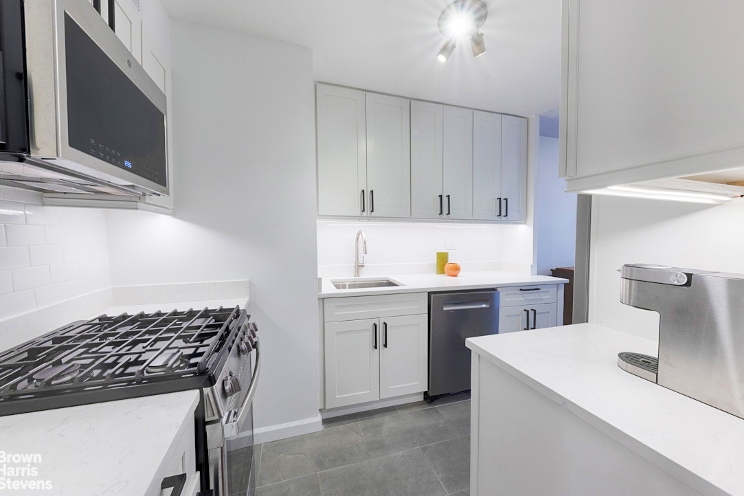 The recently renovated kitchen features sleek maple cabinetry, quartz countertops, and top-of-the-line stainless steel appliances. A beautifully updated, spa-like bathroom is outfitted with modern fixtures and a deep soaking tub for ultimate relaxation.
