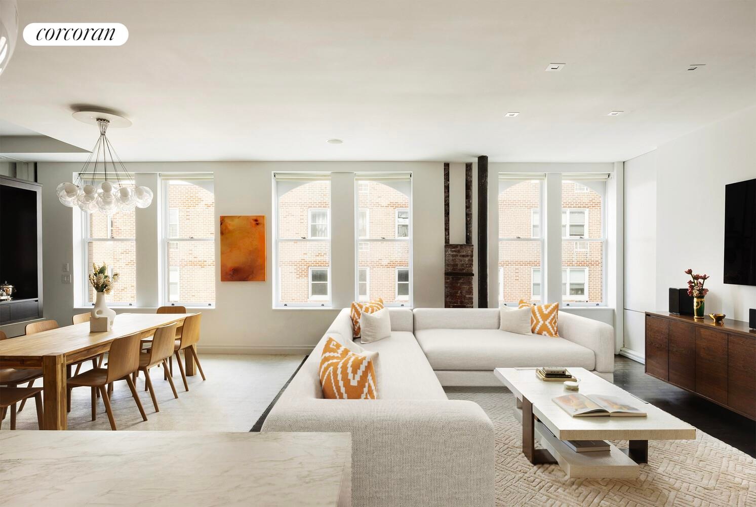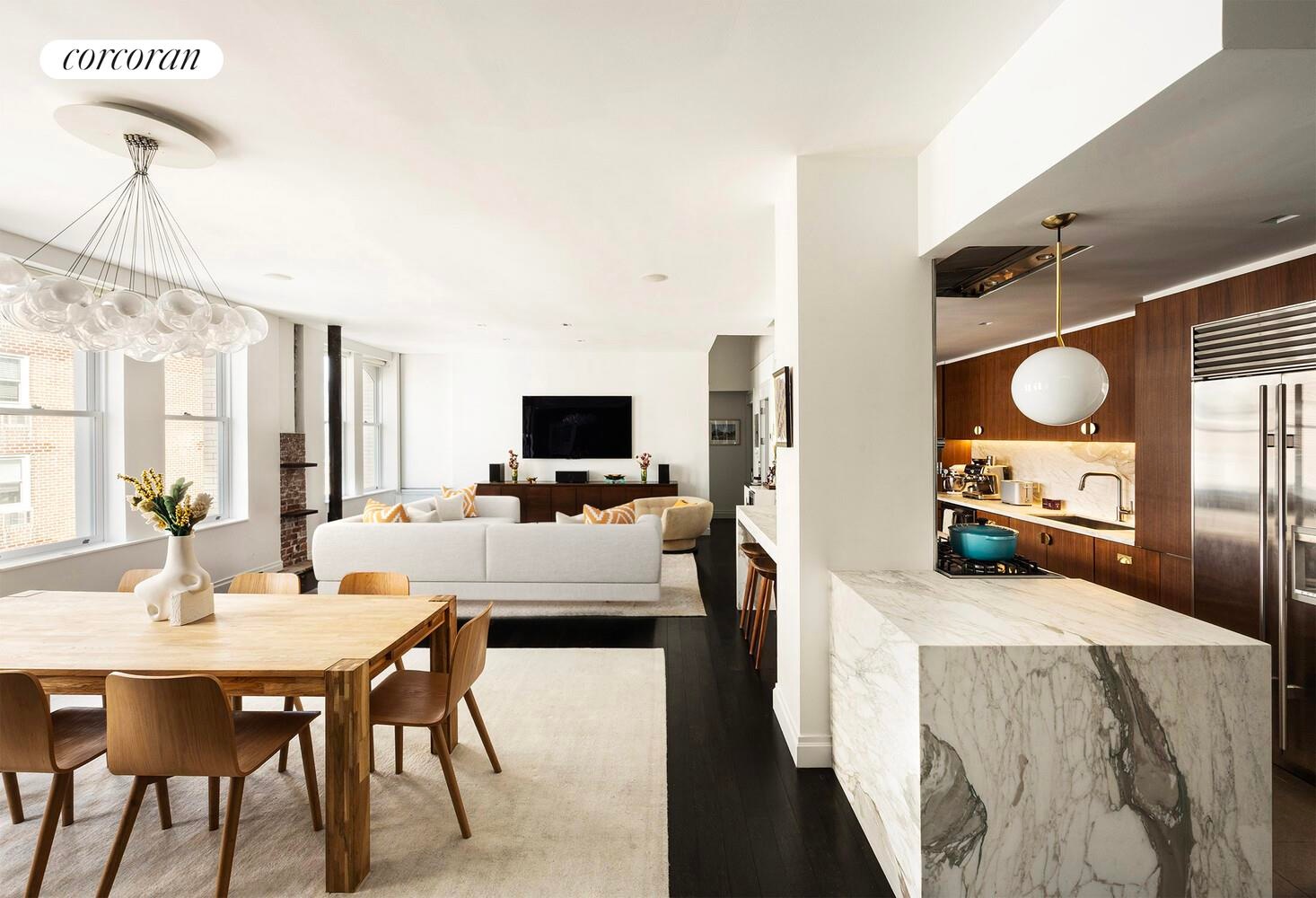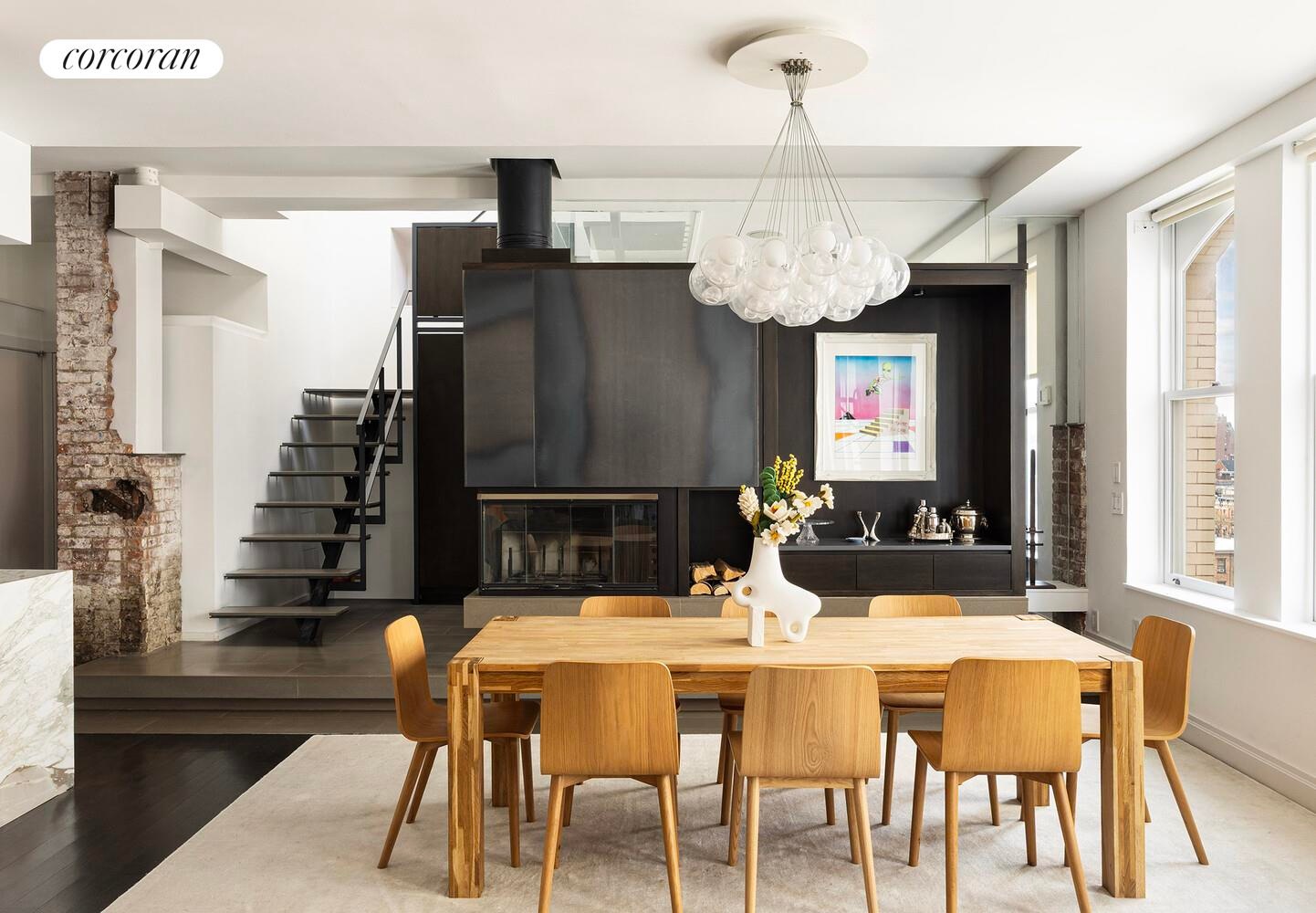 Step into a sun-flooded great room framed by a stunning wall of arched windows, soaring 10.5-foot ceilings, and original steel columns set against exposed brick. A striking Bocci chandelier anchors the living space as a sculptural focal point, while custom lighting and a wood-burning fireplace bring warmth and sophistication to the open-concept living and dining areas. A fully integrated Bose sound system, installed throughout every room including the terrace-creates an immersive, seamless audio experience for both everyday living and entertaining.