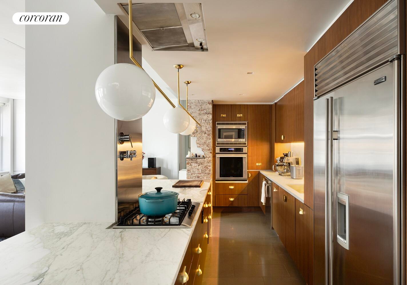 The chef's kitchen, recently renovated, is a centerpiece of contemporary elegance. Anchored by a striking marble waterfall island with new pendant lighting and gold hardware, this space is both functional and visually stunning . Outfitted with fully updated premium appliances, including a Sub-Zero refrigerator, Bosch stove, Thermador oven, and dishwasher, and abundant custom cabinetry. The kitchen blends craftsmanship and luxury seamlessly. A built-in mini bar with a wine fridge adds an extra layer of refinement for effortless entertaining.