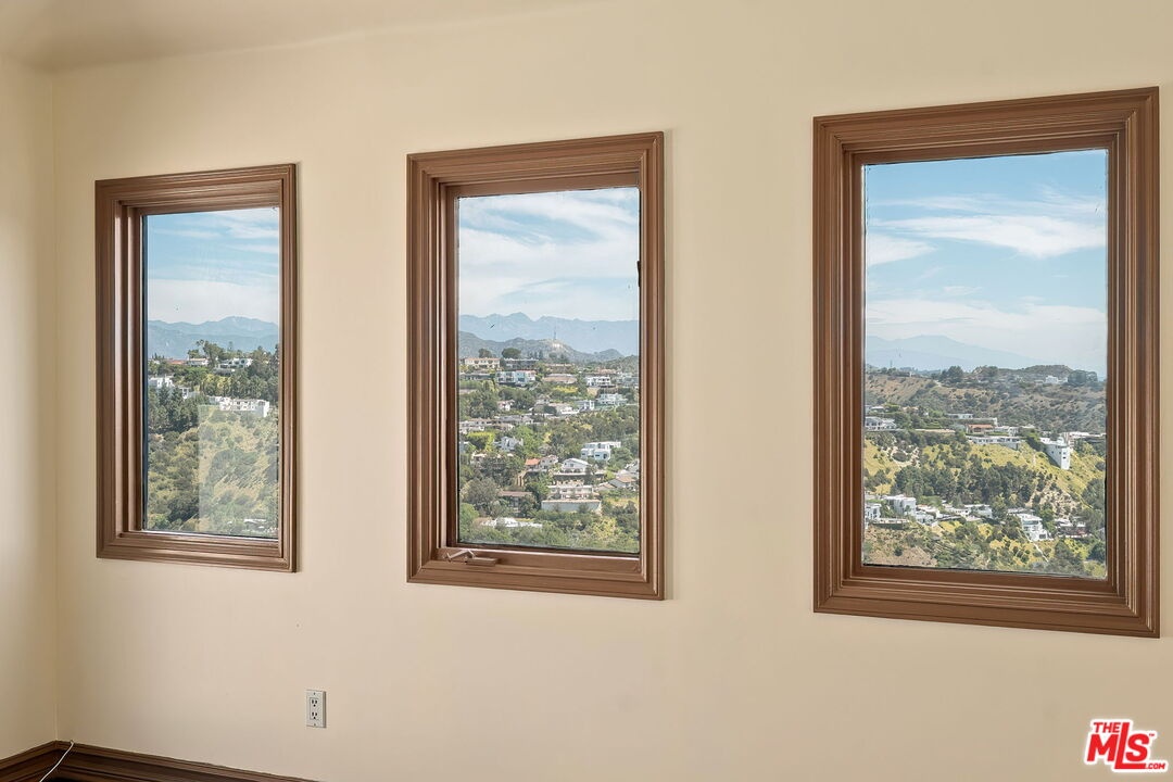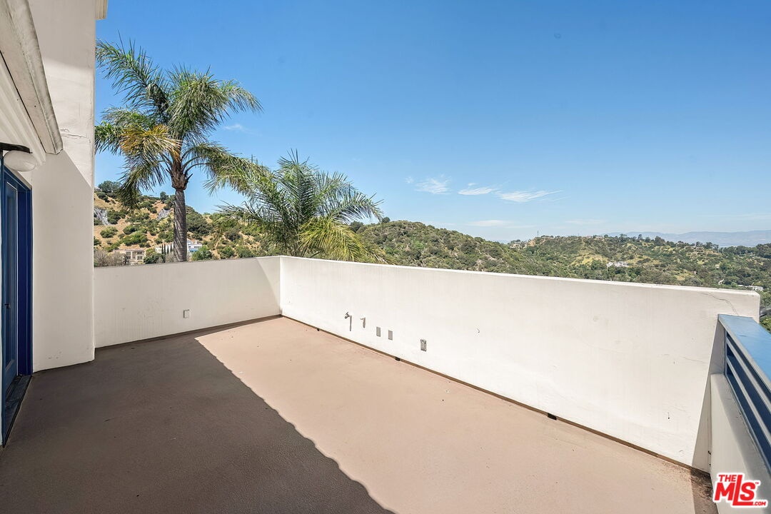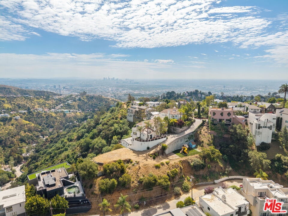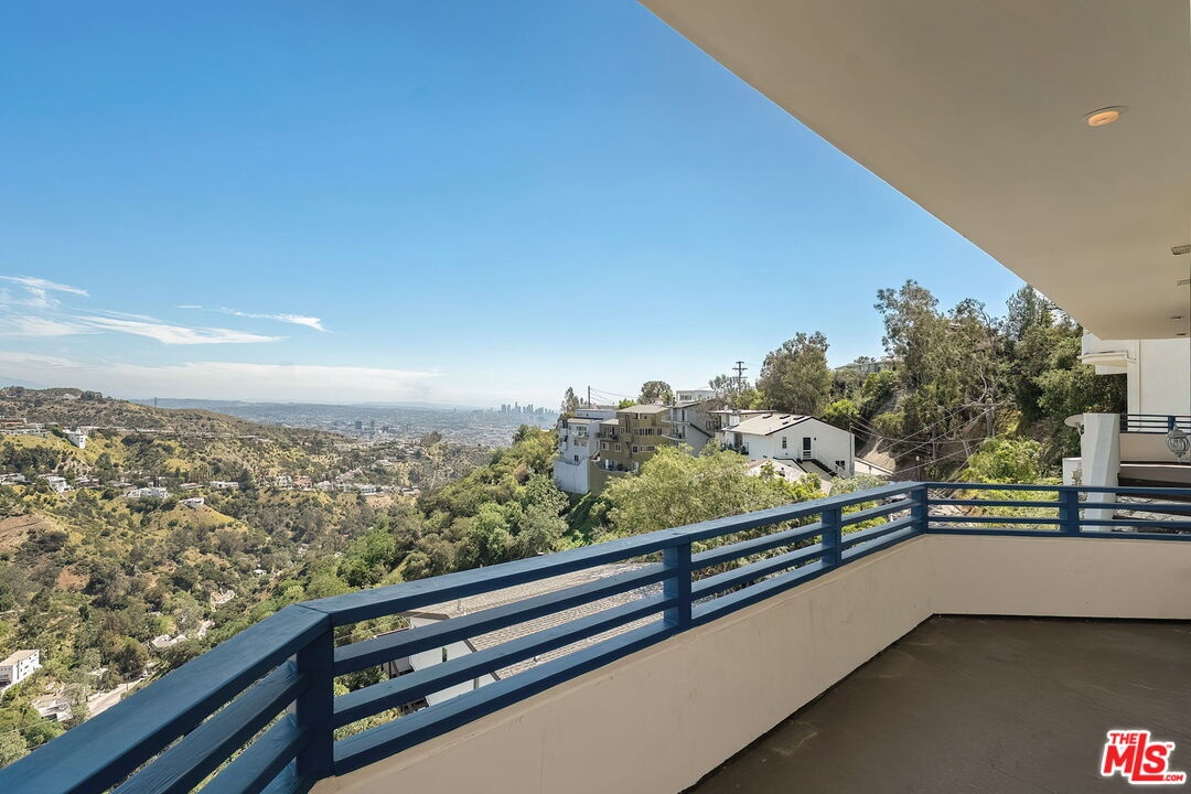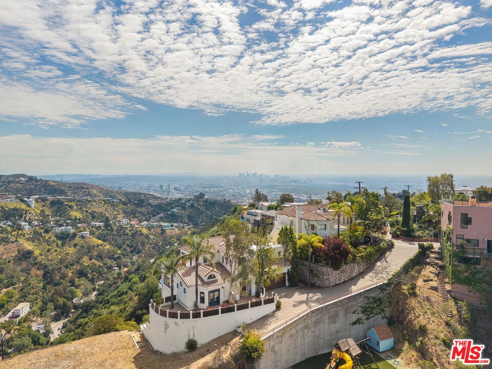 Perched on a canyon edge in the prestigious Hollywood Hills, this rare contemporary Mediterranean home offers breathtaking, near 360-degree panoramic views reminiscent of a private mountaintop castle. Enjoy sweeping vistas from the Hollywood Sign to Downtown Los Angeles, with both sunrise and sunset on display, and sparkling city lights at night. Privately gated and filled with natural light, the home showcases refined custom design elements throughout, including handmade tiles from Morocco, Turkey, and Mexico. A dramatic entry with soaring 24-foot ceilings and skylights leads to a seamless layout featuring a formal dining room, family room, and an elegant living room with beamed ceilings and a fireplace. The upper-level primary suite offers high ceilings and a luxurious bath, with an adjacent bedroom ideal as an office or nursery and access to a spacious terrace. Two generously sized bedrooms on the lower level share a bath, perfect for guests or extended living. The open gourmet kitchen is designed for both everyday living and entertaining. Outside, enjoy tranquil surroundings with fresh air and the soothing sound of birdsong. A long gated driveway provides ample parking in addition to a two-car garage. The property includes an adjacent lot with a flat pad, offering potential for a pool, guest house, or future development. Well maintained with recent renovations completed, this move-in-ready home presents both immediate comfort and future upside. Located in the highly sought-after Wonderland Elementary School District.