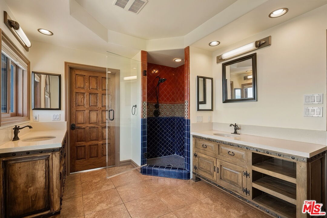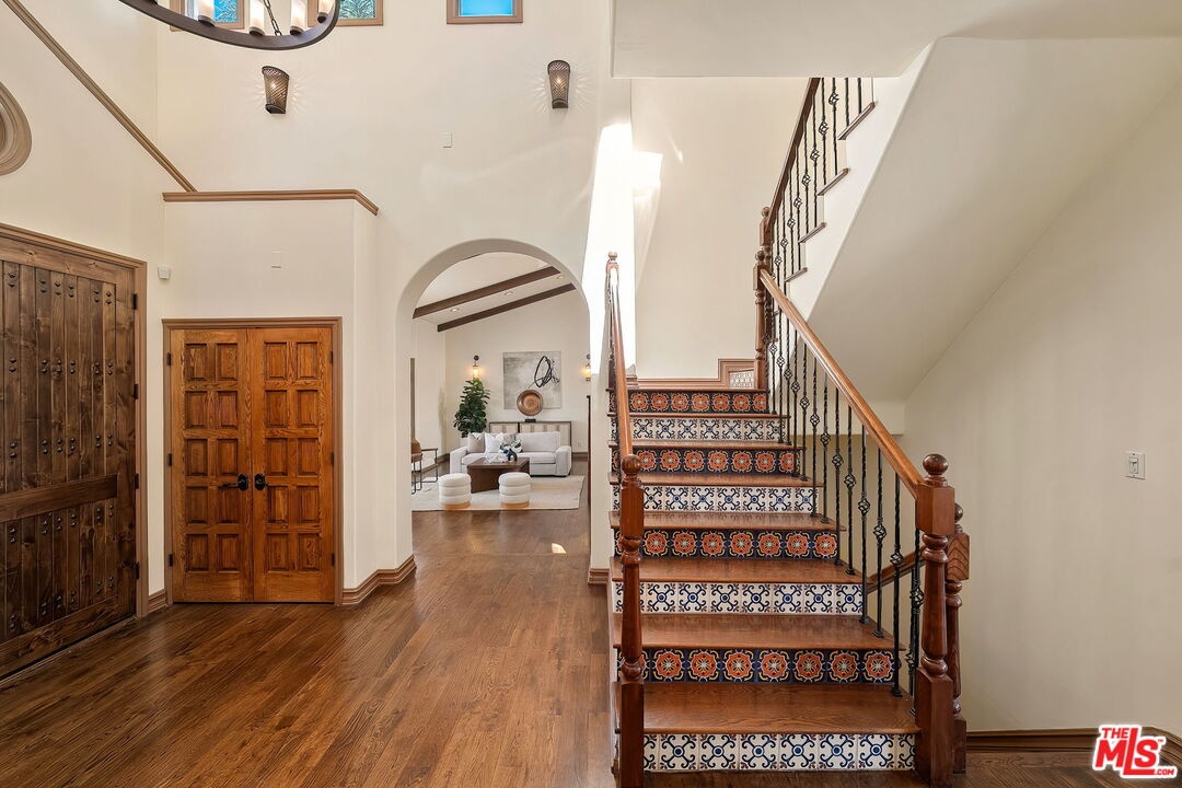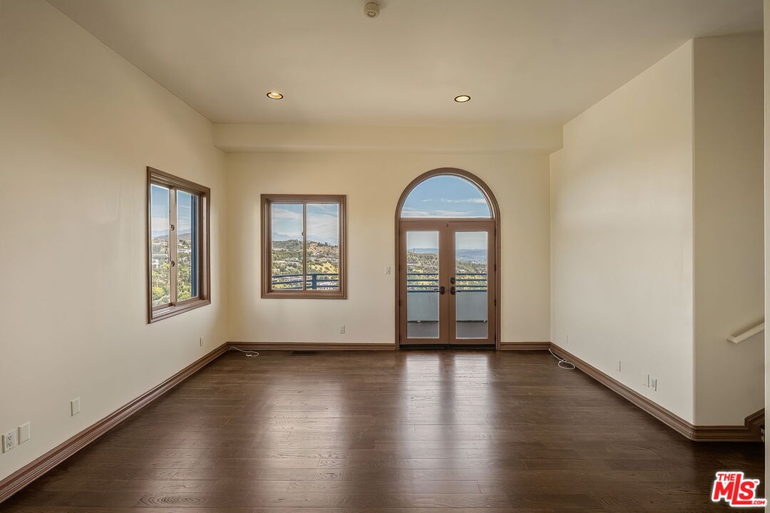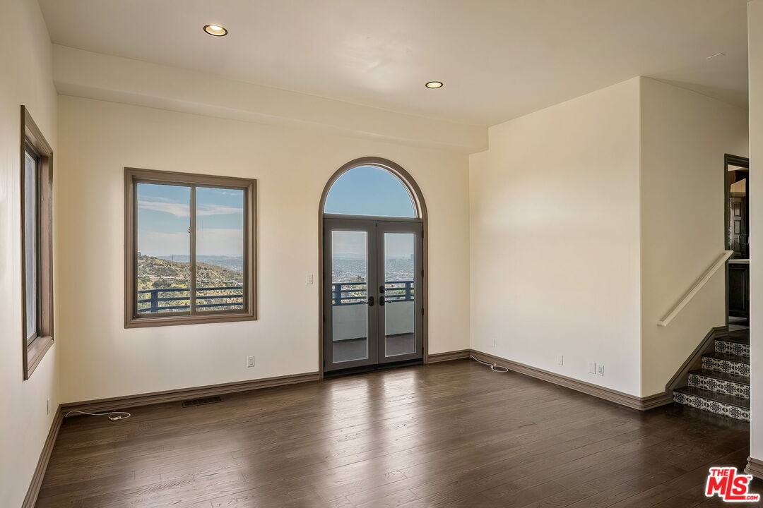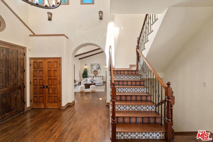 Perched on a canyon edge in the prestigious Hollywood Hills, this rare contemporary Mediterranean home offers breathtaking, near 360-degree panoramic views reminiscent of a private mountaintop castle. Enjoy sweeping vistas from the Hollywood Sign to Downtown Los Angeles, with both sunrise and sunset on display, and sparkling city lights at night. Privately gated and filled with natural light, the home showcases refined custom design elements throughout, including handmade tiles from Morocco, Turkey, and Mexico. A dramatic entry with soaring 24-foot ceilings and skylights leads to a seamless layout featuring a formal dining room, family room, and an elegant living room with beamed ceilings and a fireplace. The upper-level primary suite offers high ceilings and a luxurious bath, with an adjacent bedroom ideal as an office or nursery and access to a spacious terrace. Two generously sized bedrooms on the lower level share a bath, perfect for guests or extended living. The open gourmet kitchen is designed for both everyday living and entertaining. Outside, enjoy tranquil surroundings with fresh air and the soothing sound of birdsong. A long gated driveway provides ample parking in addition to a two-car garage. The property includes an adjacent lot with a flat pad, offering potential for a pool, guest house, or future development. Well maintained with recent renovations completed, this move-in-ready home presents both immediate comfort and future upside. Located in the highly sought-after Wonderland Elementary School District.