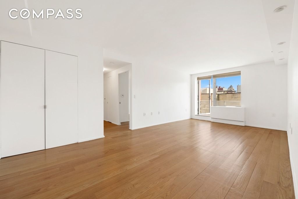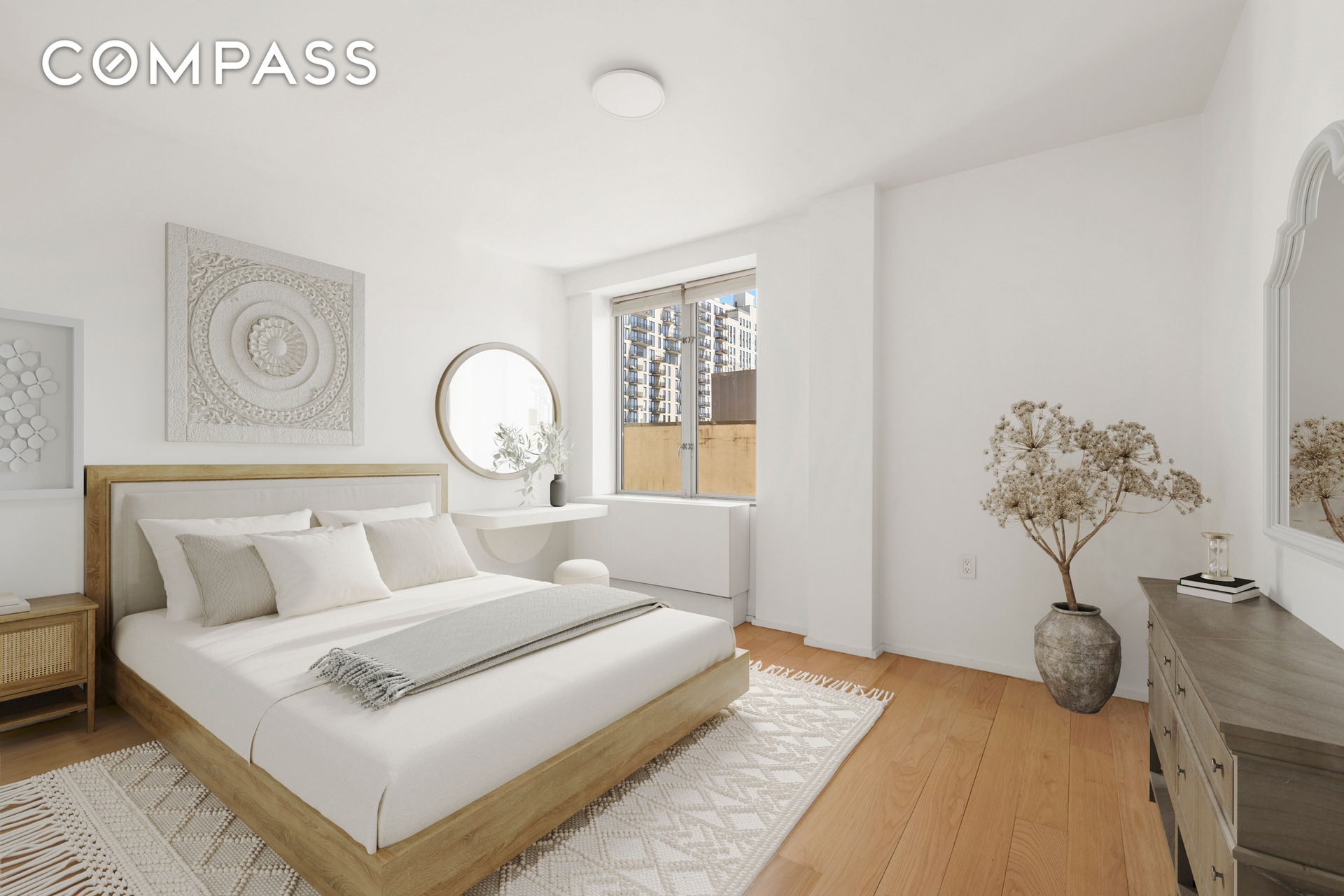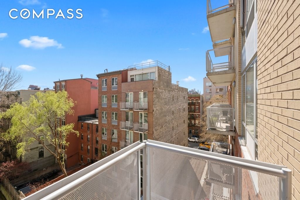 Floorplans don’t get much better than this. Alcove kitchen off generous entry hallway.... flowing into the main space with all the light; the bed/bath/laundry on its own wing off another generous hallway. Separation of space is what differentiates a box from a plan! The living space easily accommodates 6 person dining and comfortable living room seating without feeling cramped, topped off by a sunny balcony sporting classic New York roof top views.