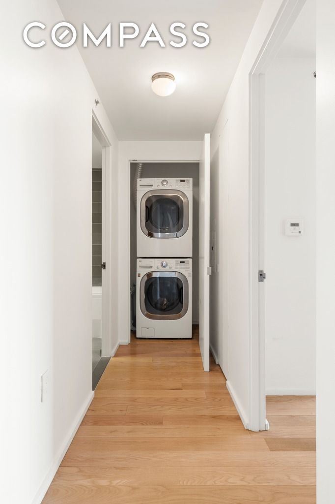 The bath has lots of storage and a separate tub/rainshower setup.. Laundry closet with stacked w/d is at the end of the hall, the bedroom spacious, with great closets everywhere. The sleek kitchen is very user friendly with room to move and store things, plus stainless steel appliances including a new refrigerator.