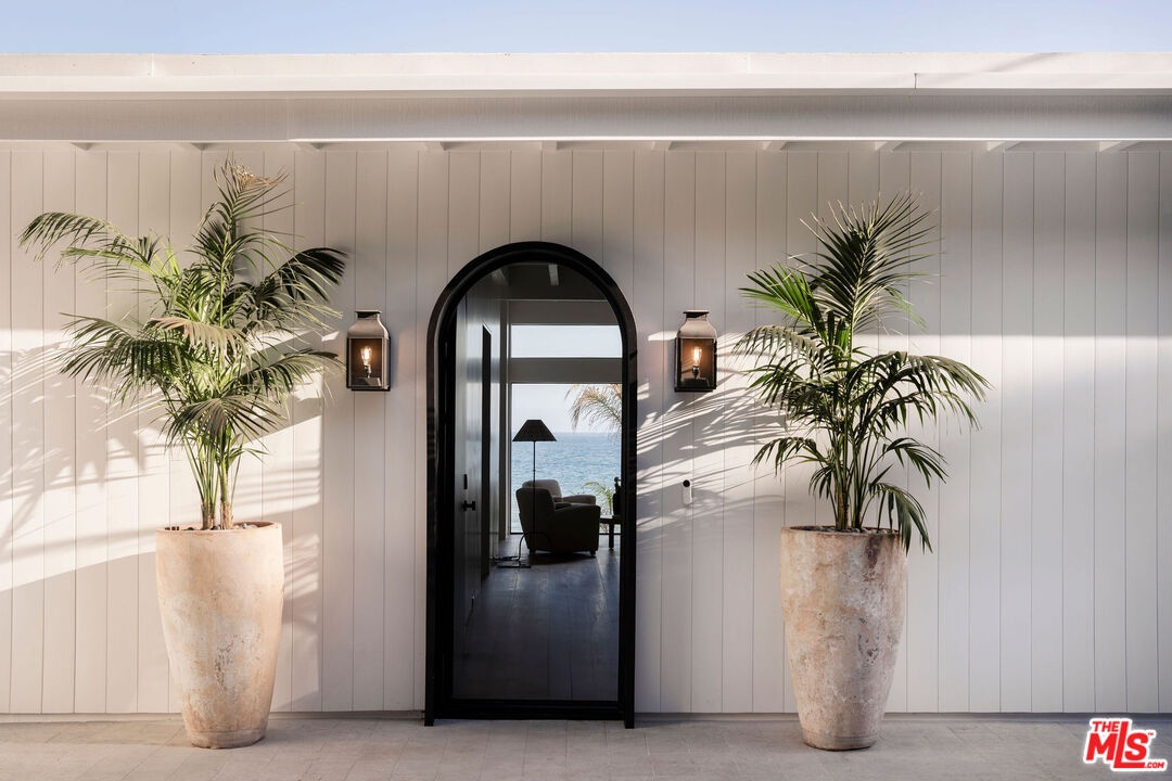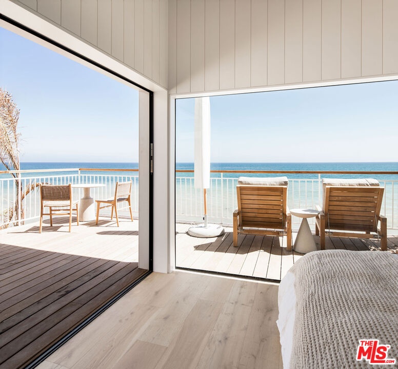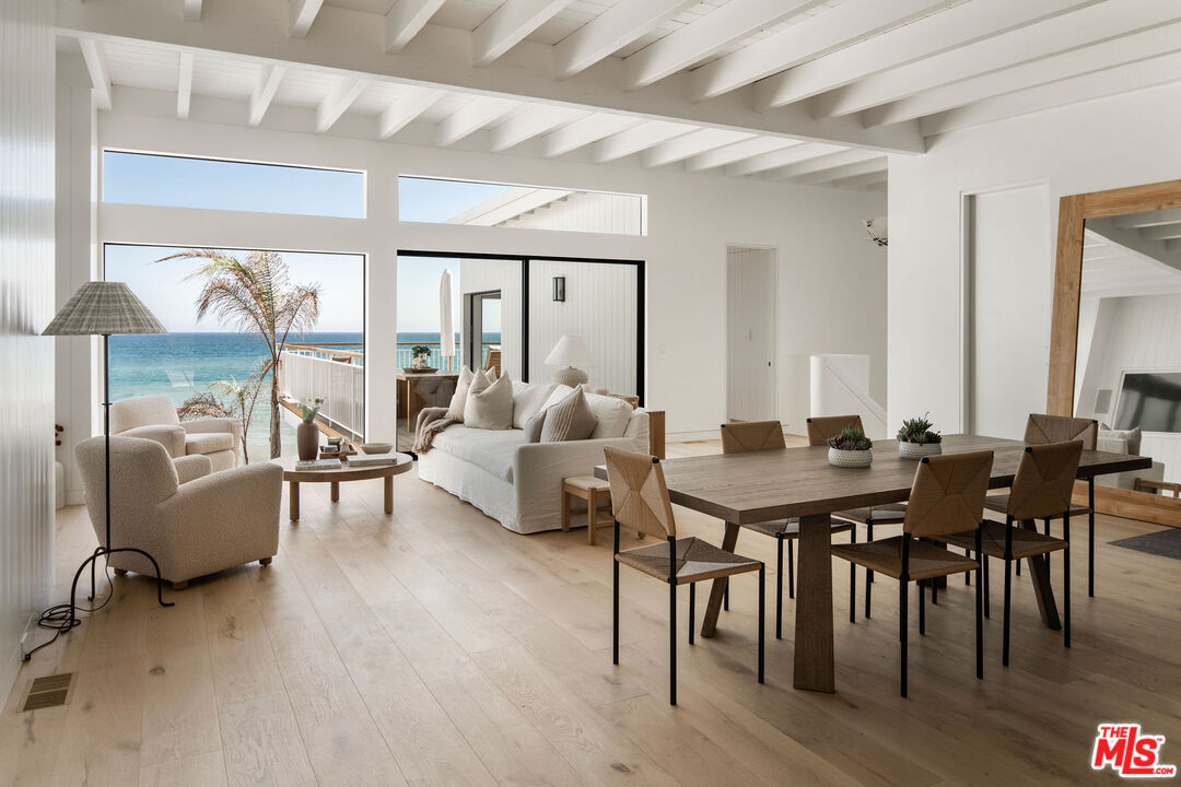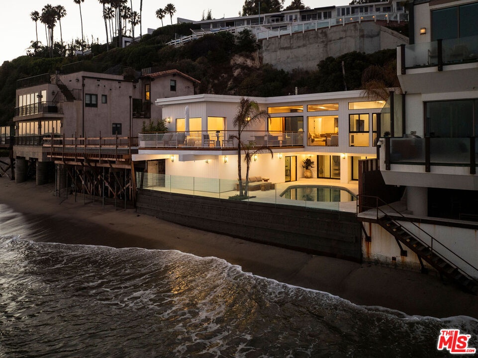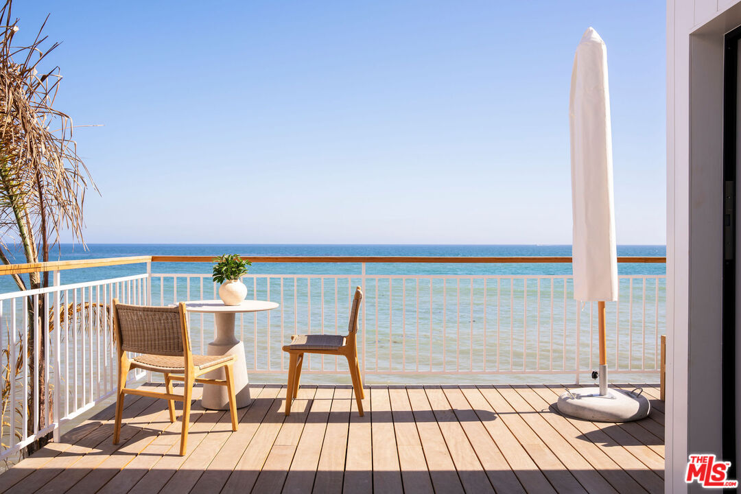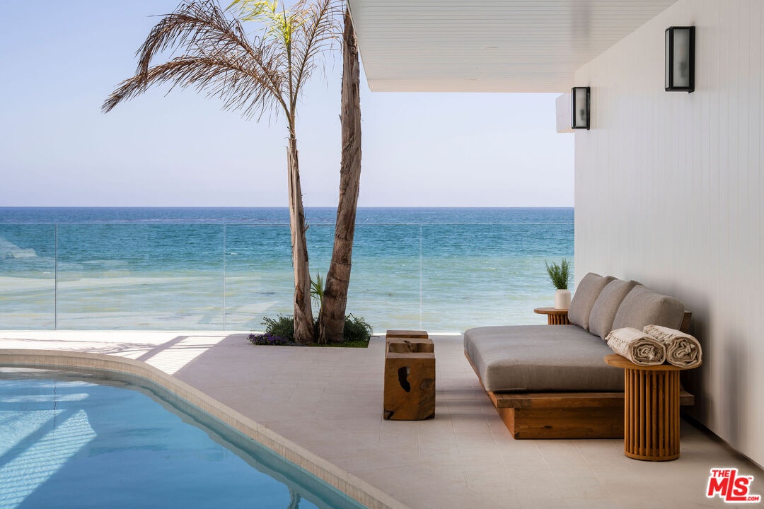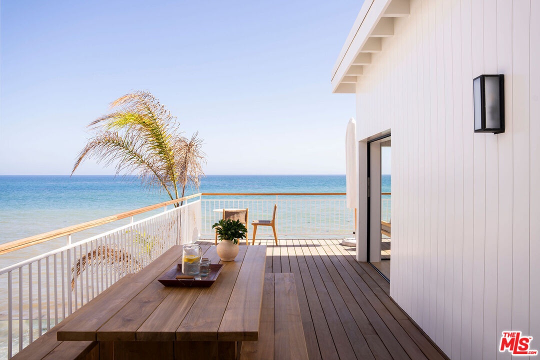 Situated off of PCH on the Private Escondido Beach Road, sits this Mid-Century gem on 50 feet of the exclusive and coveted Escondido Beach. Embrace the opportunity to call this special property home, that has been extensively and meticulously reimagined by design team Warren Garrett. The newly completed home elegantly blends timeless materials with modern amenities and exudes a restrained sophistication. The turnkey beachfront residence offers 4 bedrooms, 4.5 baths, two levels of expansive waterfront decks and features a gorgeous french grey plaster pool that takes center stage only a few steps from the sand. This idyllic beach house is conveniently located steps away from the iconic Geoffrey's restaurant and a leisurely beachside stroll to Paradise Cove Beach Cafe. Located near the end of a private street, the peaceful retreat enjoys ample separation from Pacific Coast Highway. The clean design of the modest exterior facade is centered by an arched solid steel front door opening to panoramic ocean views framed with white oak floors and soaring exposed beam ceilings. An open gourmet kitchen showcases a grand Italian limestone island, exquisite stone shelving, a La Cornue range and new high end appliances. The main level features 3 bedrooms with spa-like en-suite bathrooms, while the lower level offers a 4th bedroom and full bathroom with breathtaking views of the pool and ocean beyond. A secondary bar and kitchen as well as a cozy interior lounge were designed to make this the perfect setting for pool and beachside entertaining. This home is furnished and is move-in ready with brand new furnishings from Jenni Kayne Home, experience the best of coastal living in this unique Malibu beachfront paradise. **Available Summer months at $75,000/mo**