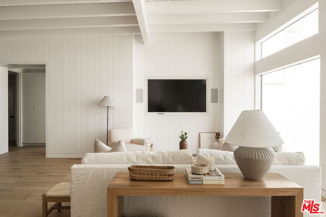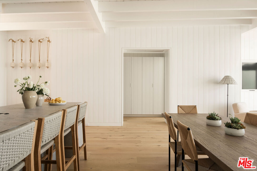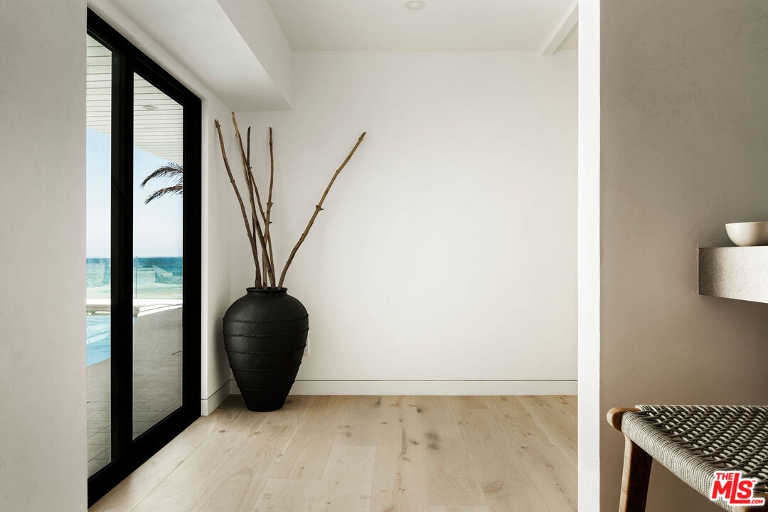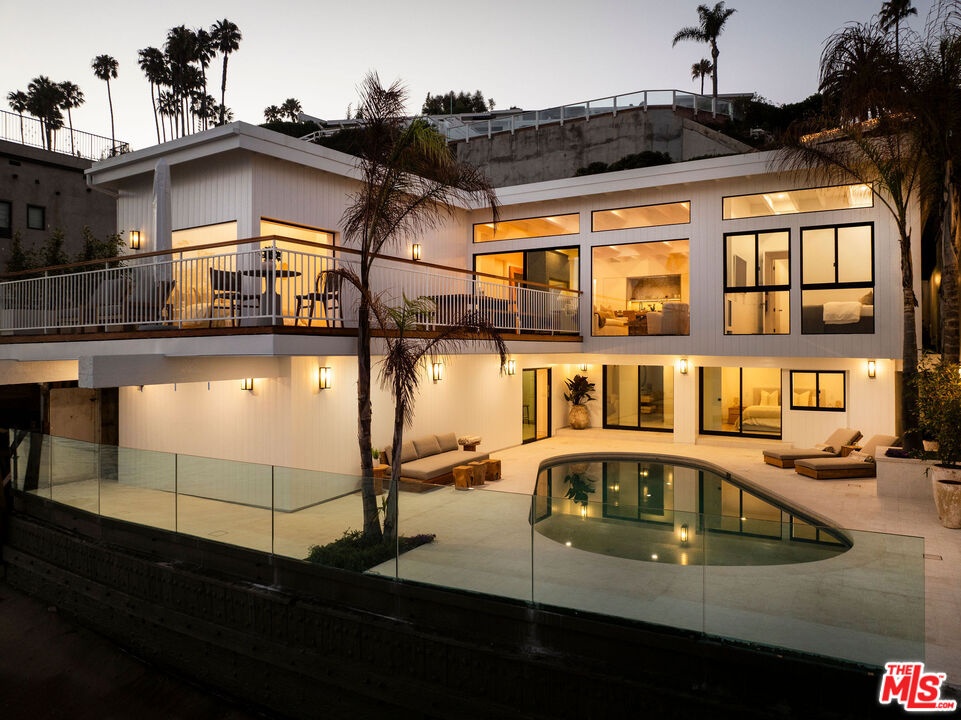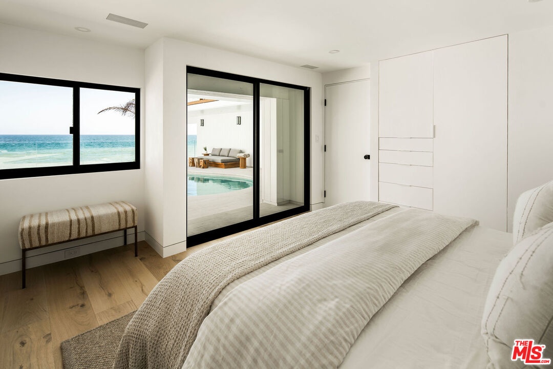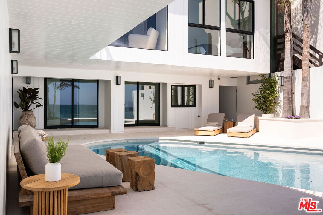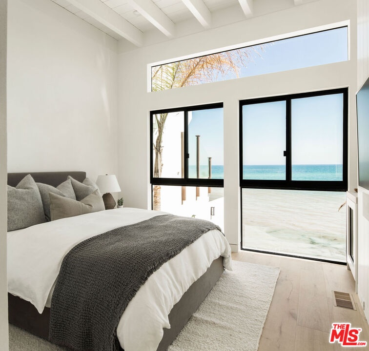 Situated off of PCH on the Private Escondido Beach Road, sits this Mid-Century gem on 50 feet of the exclusive and coveted Escondido Beach. Embrace the opportunity to call this special property home, that has been extensively and meticulously reimagined by design team Warren Garrett. The newly completed home elegantly blends timeless materials with modern amenities and exudes a restrained sophistication. The turnkey beachfront residence offers 4 bedrooms, 4.5 baths, two levels of expansive waterfront decks and features a gorgeous french grey plaster pool that takes center stage only a few steps from the sand. This idyllic beach house is conveniently located steps away from the iconic Geoffrey's restaurant and a leisurely beachside stroll to Paradise Cove Beach Cafe. Located near the end of a private street, the peaceful retreat enjoys ample separation from Pacific Coast Highway. The clean design of the modest exterior facade is centered by an arched solid steel front door opening to panoramic ocean views framed with white oak floors and soaring exposed beam ceilings. An open gourmet kitchen showcases a grand Italian limestone island, exquisite stone shelving, a La Cornue range and new high end appliances. The main level features 3 bedrooms with spa-like en-suite bathrooms, while the lower level offers a 4th bedroom and full bathroom with breathtaking views of the pool and ocean beyond. A secondary bar and kitchen as well as a cozy interior lounge were designed to make this the perfect setting for pool and beachside entertaining. This home is furnished and is move-in ready with brand new furnishings from Jenni Kayne Home, experience the best of coastal living in this unique Malibu beachfront paradise. **Available Summer months at $75,000/mo**