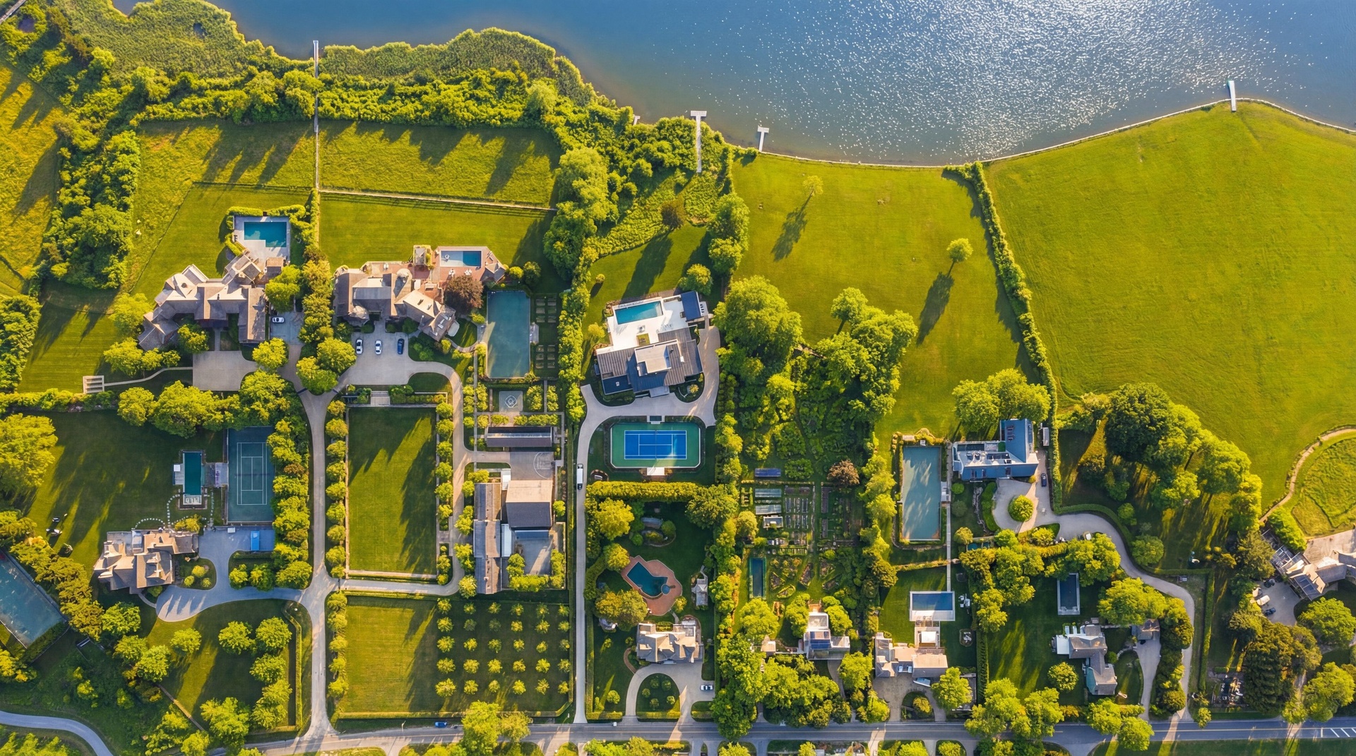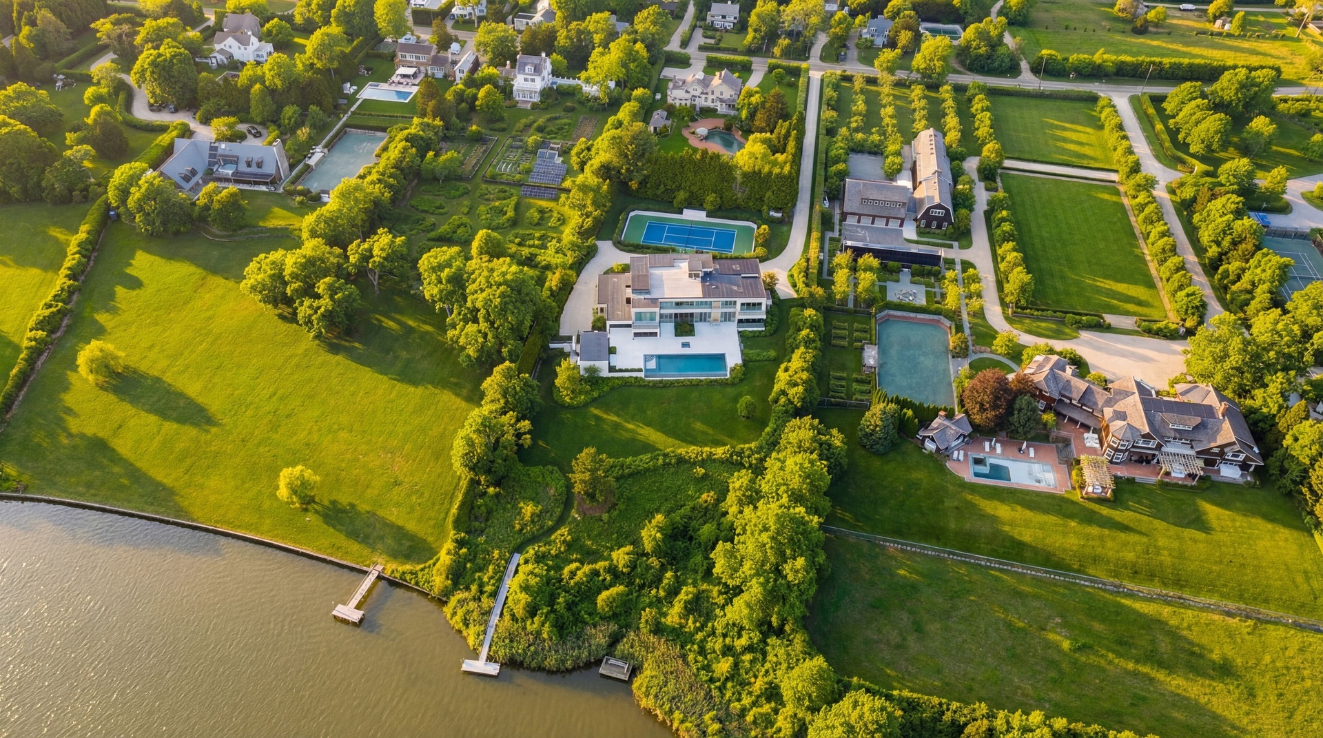 Every amenity has been thoughtfully curated, from the state-of-the-art movie theater, private gym, and golf simulator to the spectacular outdoor living spaces designed to capture the beauty of Mecox Bay. The grounds are nothing short of breathtaking, with sweeping water views, a resort-style swimming pool and pool house, tennis court, and every luxury outdoor feature expected in a world-class waterfront compound.