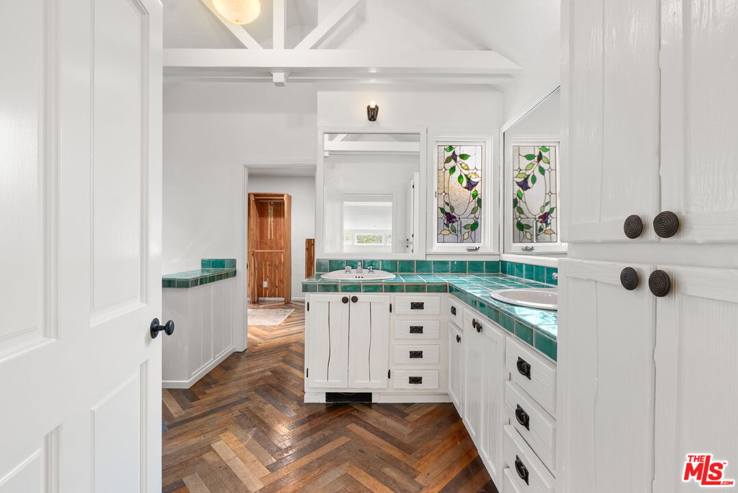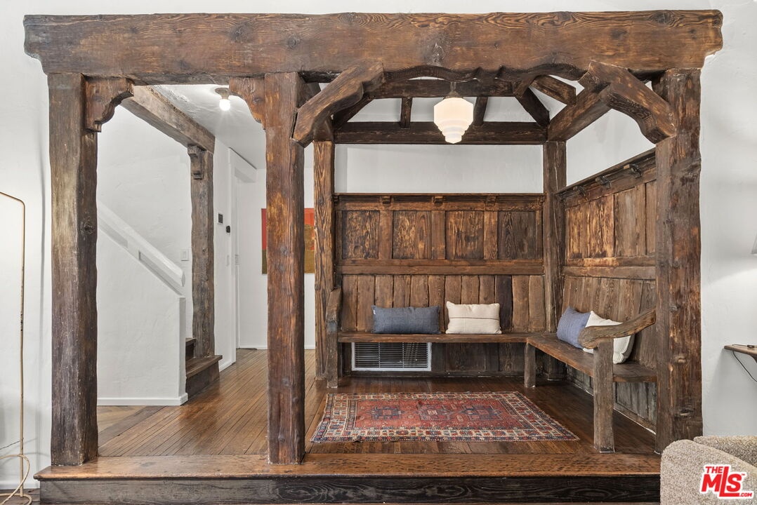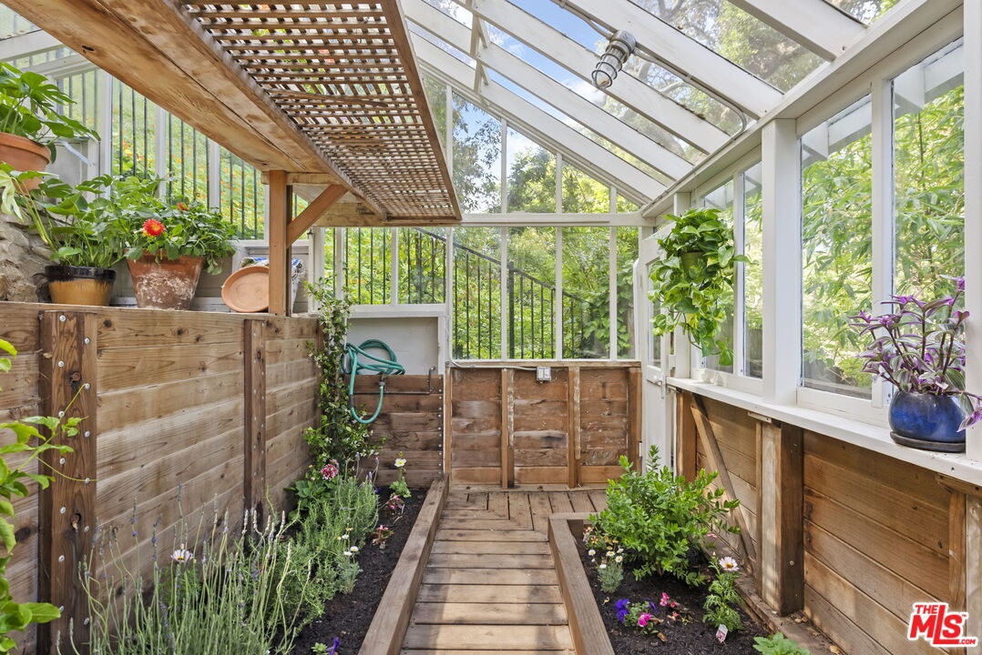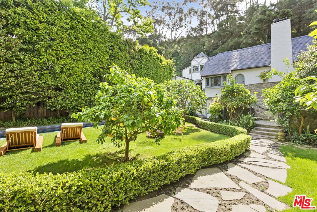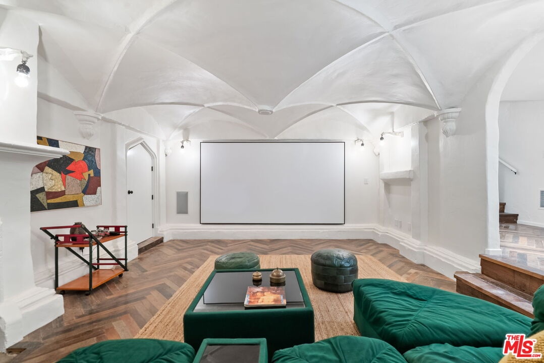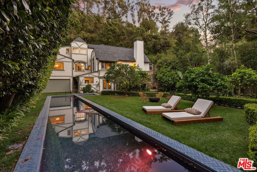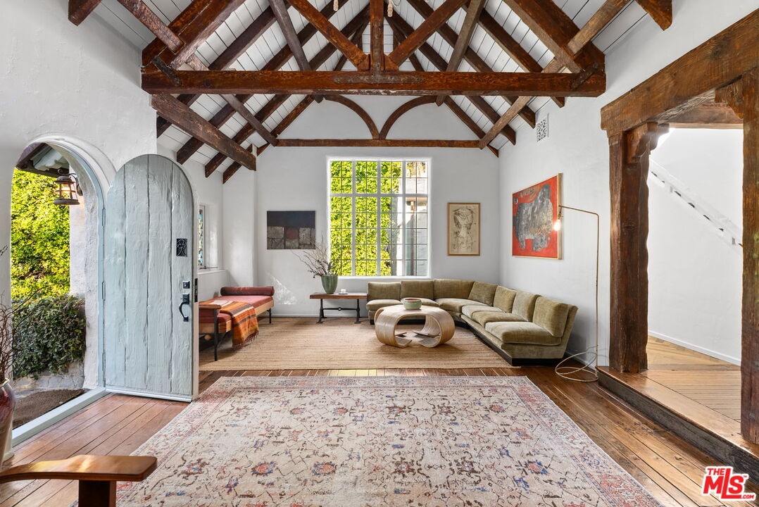 Nearly a century in the making, this enchanting 1928 retreat rests quietly within the storybook landscape of Rustic Canyon. The property has evolved with grace into a timeless English Tudor where every detail feels considered, a blend of craftsmanship, history, and warmth. Inside, soaring beamed cathedral ceilings create a sense of openness and light, while custom herringbone wood floors ground the space in quiet sophistication. Sunlight filters gently through colorful stained-glass windows, casting shifting patterns across the rooms throughout the day. Restored vintage lighting glows softly in the evenings, enhancing the home's intimate, almost cinematic ambiance. Each of the five en suite bedrooms offers its own distinct rhythm and personality, private & peaceful. At the very top, the primary suite feels like a retreat unto itself, bathed in natural light and surrounded by treetop views that stretch across the lush canyon landscape. On the lower level, the home reveals one of its most captivating chapters. Published as part of the original 1920s cabin, this space carries the spirit of another era. A dramatic refurbished screening lounge unfolds, leading to a hidden Prohibition-era speakeasy tucked behind secret doors- a playful and storied nod to the home's past as a gathering place for the Uplifters community. Outside, the grounds feel equally transportive. Mature greenery surrounds the home, creating a sense of privacy and calm, while the 54-foot saline pool and spa stretch elegantly across the landscape designed for long afternoons in the sun and quiet evenings under a verdant canopy. Incredible creative studio over 3-car garage. Gardening shed. Set within one of Los Angeles' most cherished and storied enclaves, this is more than a home... it's a rare and soulful retreat where history, artistry, and nature exist in effortless harmony.