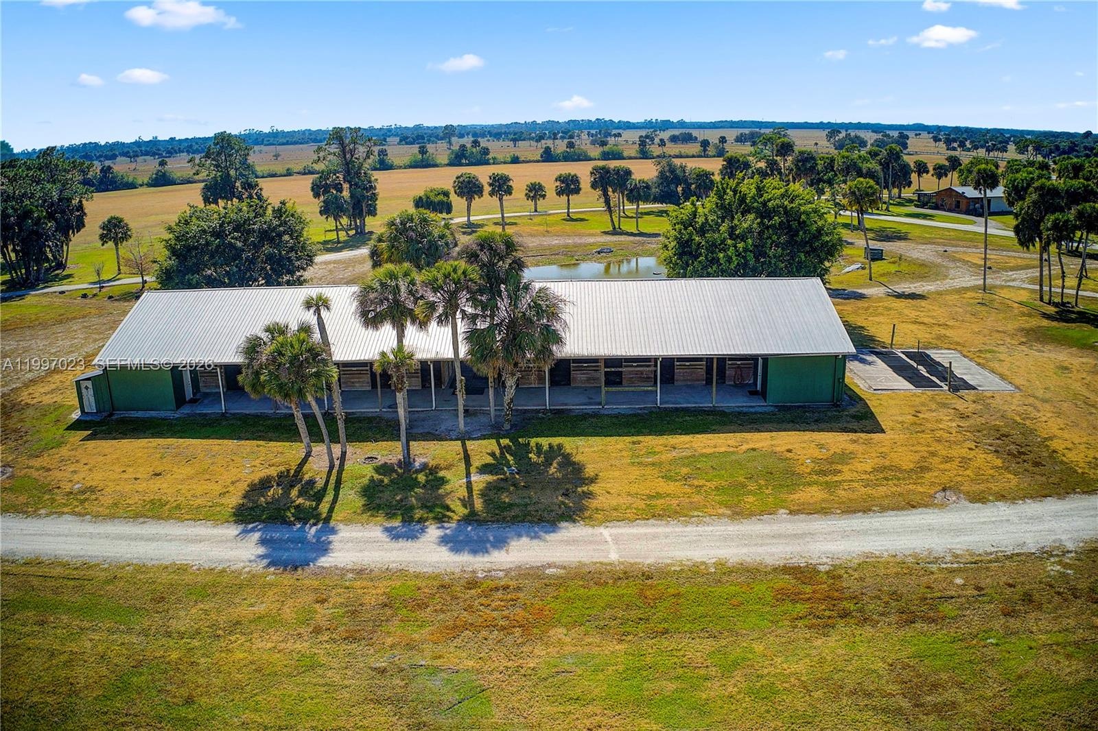 Introducing an extraordinary equestrian estate spanning approximately 161 acres in the heart of Okeechobee. This rare offering presents a fully equipped polo and training facility designed for both professional use and private enjoyment. The property features 38 horse stables, complete with tack rooms and wash racks, along with a 6-room bunkhouse ideally suited for staff or seasonal accommodations. An exercise track enhances conditioning capabilities, while two full-sized polo practice fields provide the perfect setting for training, matches, or equestrian events. In addition to its world-class equestrian infrastructure, the estate includes multiple residences, offering comfortable living for owners, guests, or team members. Whether utilized as a private ranch, seasonal polo retreat, or income-producing equestrian facility, this property offers unmatched scale, versatility, and potential. Conveniently located near Port Mayaca, it provides both privacy and accessibility for South Florida’s equestrian community. A truly unique opportunity to own a premier equestrian compound in one of Florida’s most sought-after rural settings.