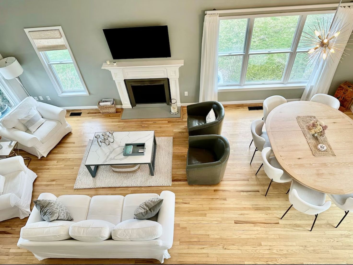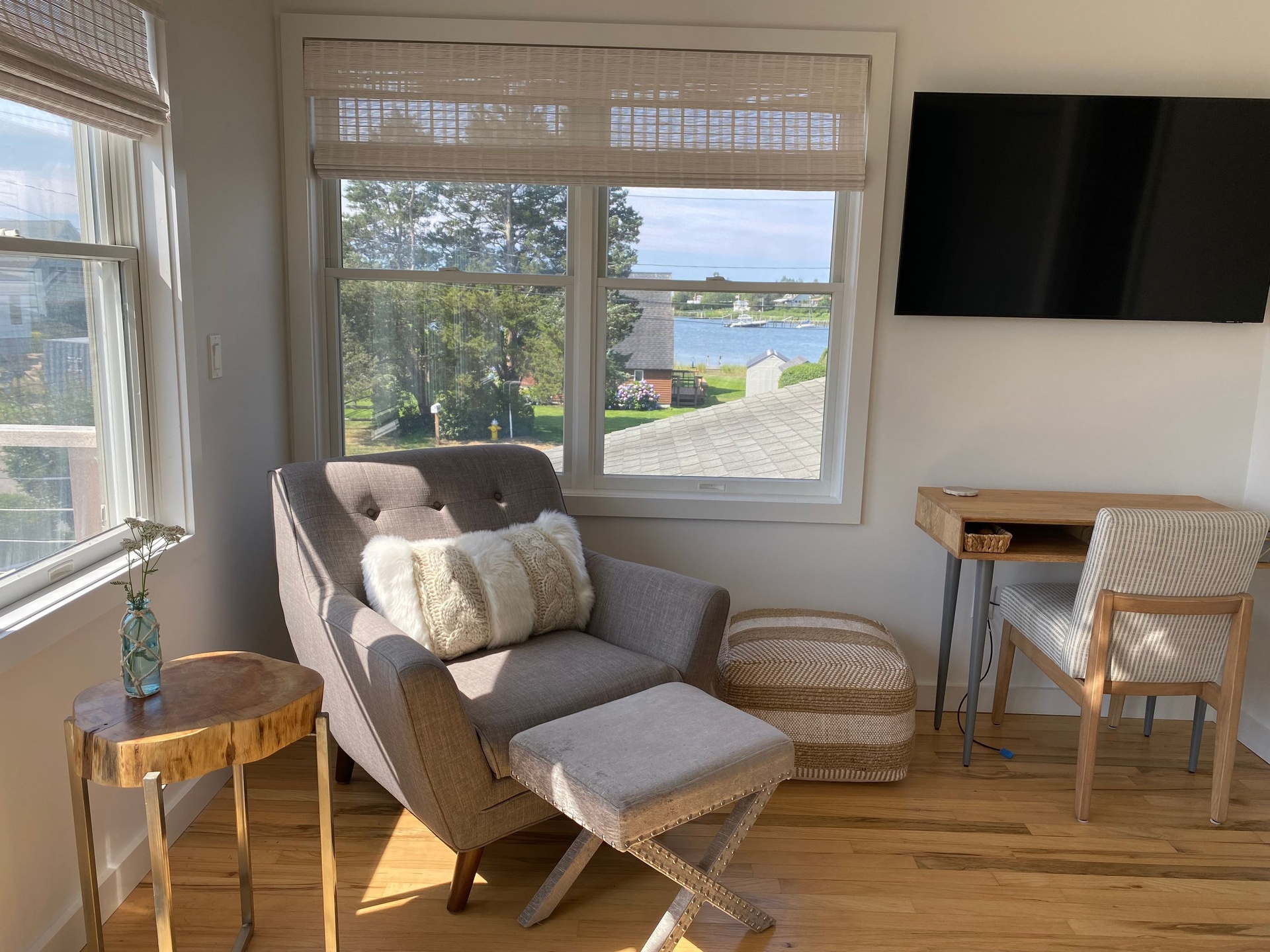 The four-bedroom layout includes a first-floor primary suite, a second en-suite bedroom upstairs, and two additional guest bedrooms. The open floor plan with high ceilings features a living room with fireplace, a dining area with bay views, which opens into a spacious kitchen. The kitchen is bright with new appliances and countertop seating.