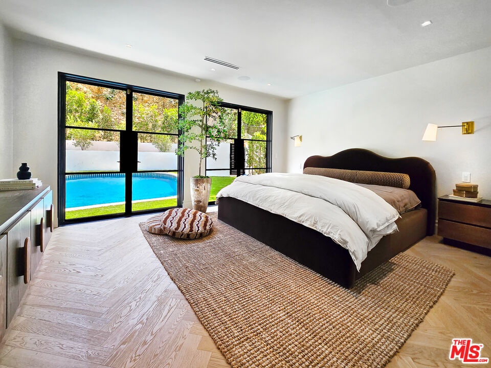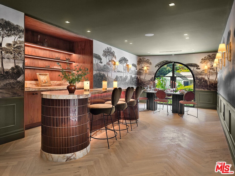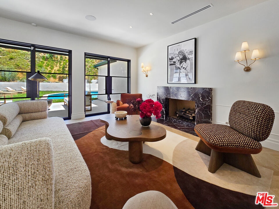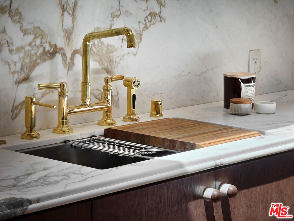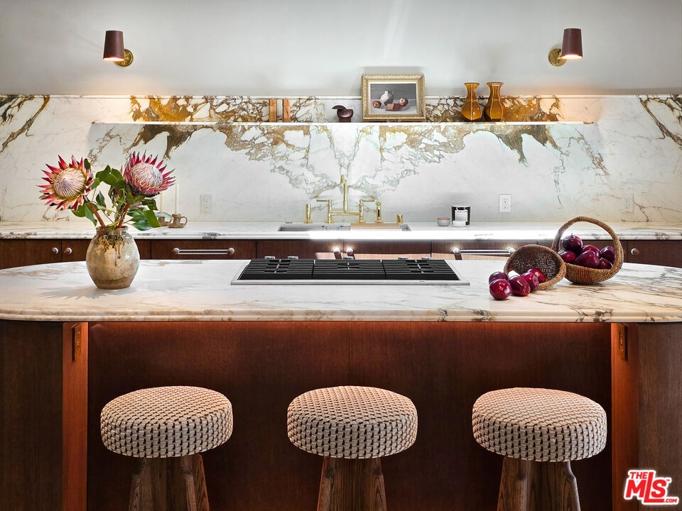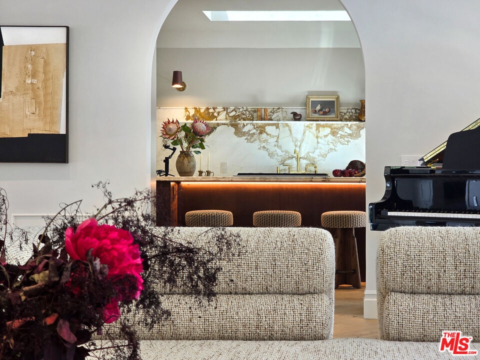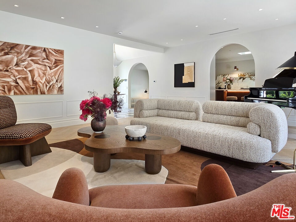 Perched on a corner lot of a serene knoll in the heart of Beverly Hills' coveted Coldwater Canyon, this exquisitely just remodeled single-story Contemporary estate is a newly completed design masterpiece by renowned designer Nina Takesh. Spanning over 2,900 square feet, this four-bedroom, five-bathroom residence redefines bespoke luxury, blending refined sophistication with effortless California living. From the moment you enter through Pinky's custom iron doors, it's clear no expense was spared. The home features engineered herringbone wood floors, Roman Clay walls by Portola, and custom finishes at every turn. The entire property is outfitted in real marble, lending timeless elegance and material integrity throughout. The formal entry, accented by a coved ceiling and sculptural plaster chandelier by Visual Comfort, opens into an oversized, step-down family room that connects seamlessly to a designer bar and dining area. The bar features a rare, hand-hammered polished steel sink by Mick De Giulio for Kallistaone of many exceptional selections, as every plumbing fixture in the home is exclusively from the luxury brand Kallista. The formal living room is centered around a one-of-a-kind fireplace clad in dramatic Rosso Levanto marble and opens to the expansive backyard through three sets of glass doors. The chef's kitchen is a study in both beauty and functionality, with a central island, breakfast bar, top-tier Jenn Air appliances, Calacatta marble backsplash, and flawless flow. All four bedrooms are en suite, including the luxurious primary suite with a walk-in closet and private access to the backyard. Every bathroom features custom glass shower doors inset with a mix of polished nickel and brass, adding a tailored, jewel-box quality to the spaces. Outside, the newly redone resort-style pool, built-in BBQ station with refrigerator, al fresco dining area, and lush landscaping creates a true entertainer's paradise. There's even a dedicated dog run for your four-legged guests. Lighting has been curated down to the last detail: all decorative fixtures are by Visual Comfort, and the recessed lighting is powered by Elemis, Visual Comfort's most advanced home lighting solution. A state-of-the-art home automation system ensures effortless control of lighting, climate, and entertainment. Additional highlights include elegant wainscoting throughout and premium architectural hardware from the luxury Australian brand Bankston. Just minutes from the legendary Beverly Hills Hotel and the world's most coveted shopping and dining on Rodeo Drive, this top-of-the-line residence offers an extraordinary level of design, customization, and comfort designed for the most discerning buyer.