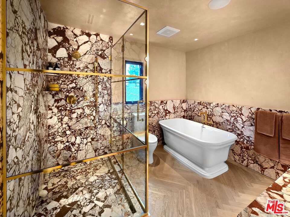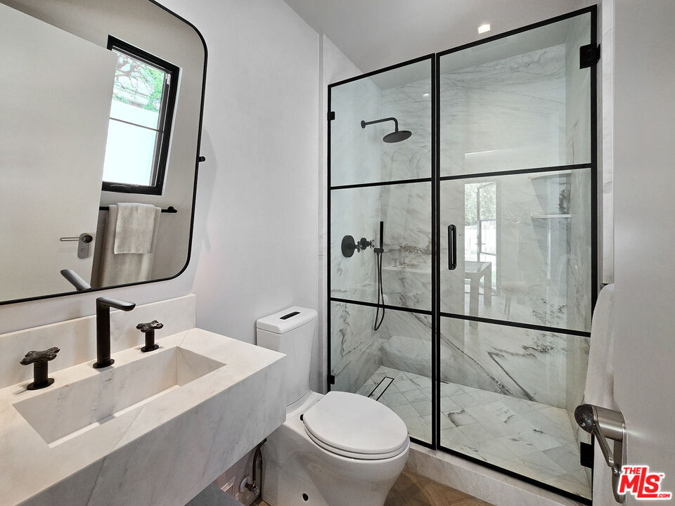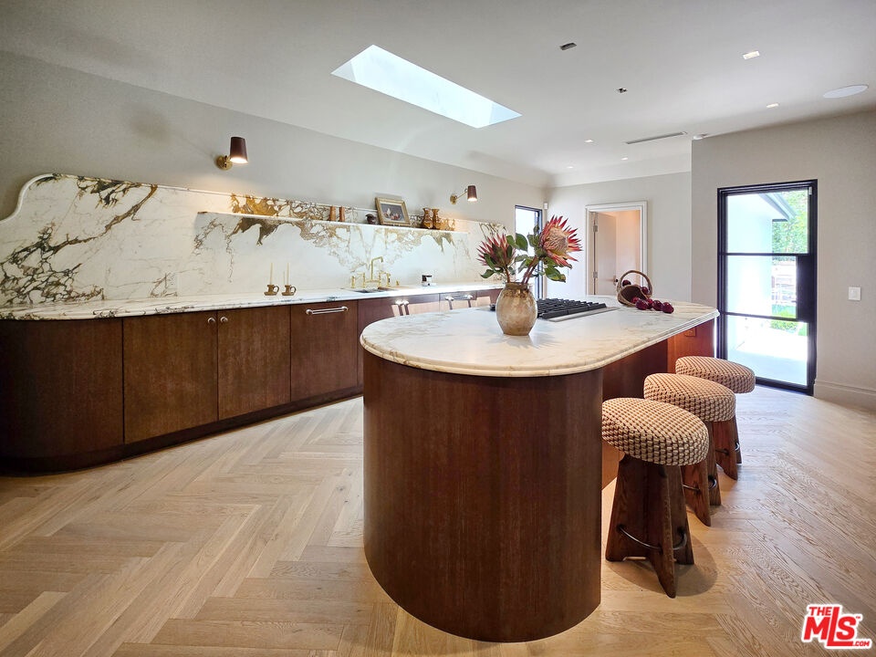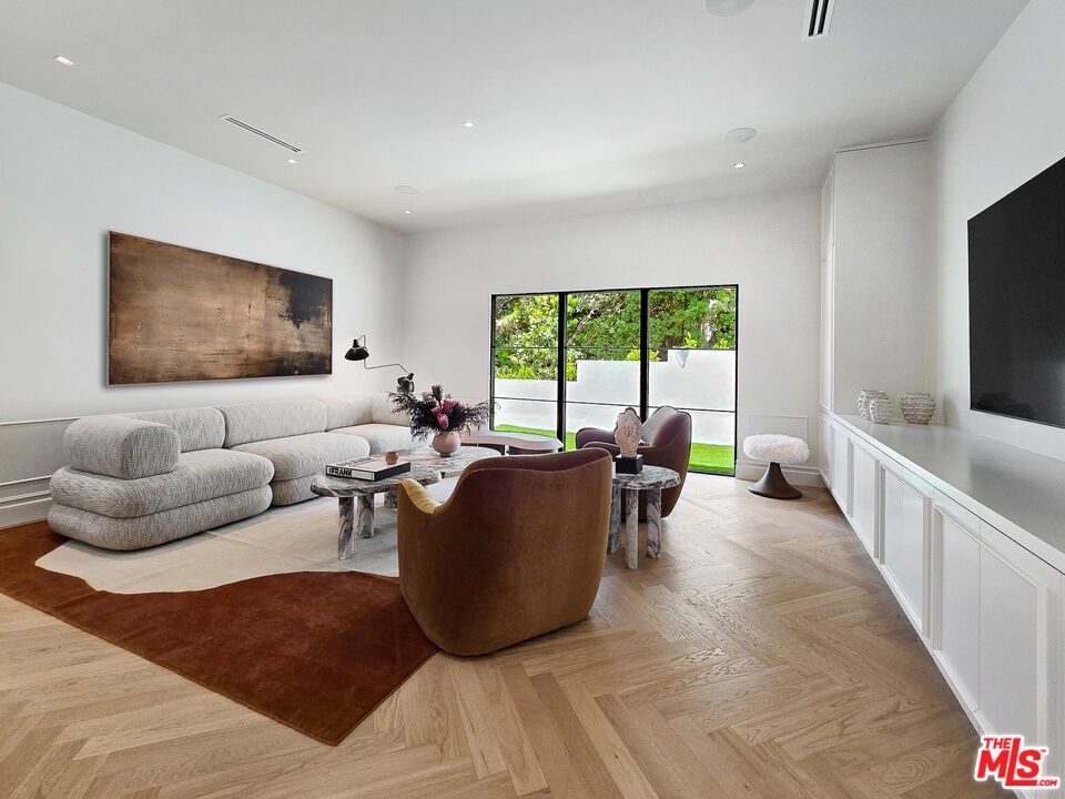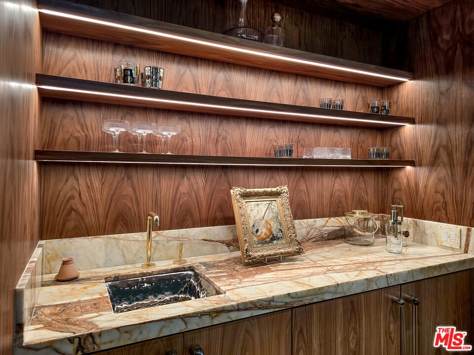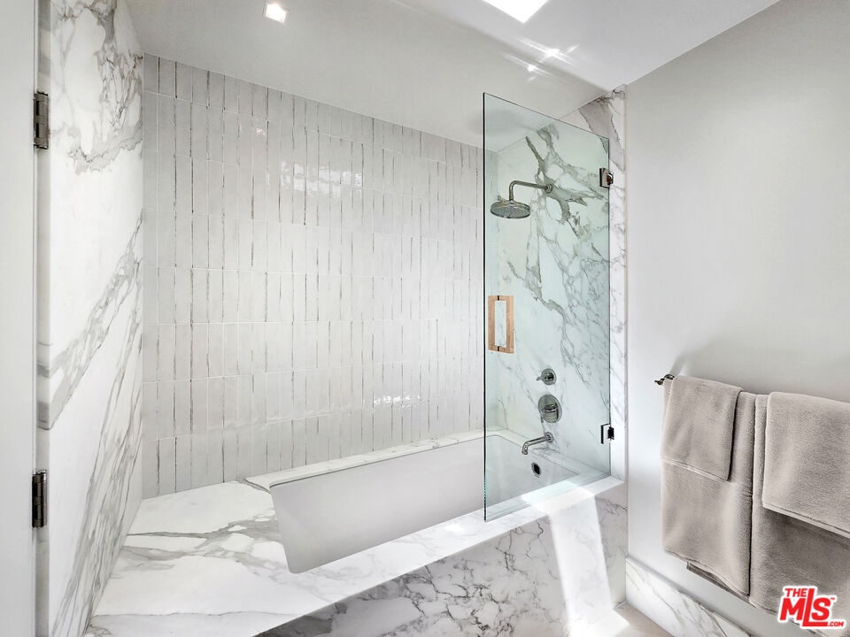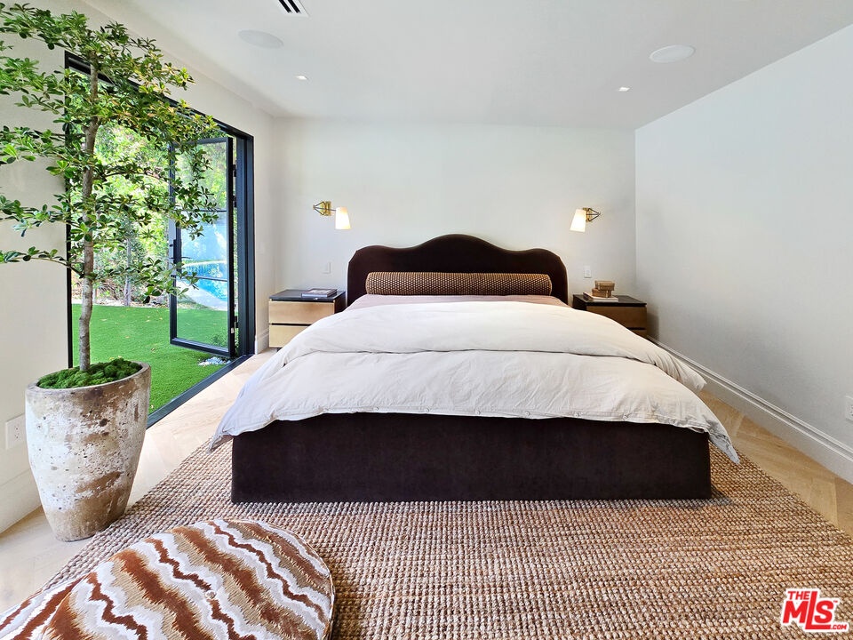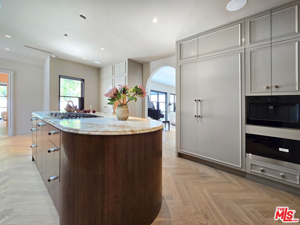 Perched on a corner lot of a serene knoll in the heart of Beverly Hills' coveted Coldwater Canyon, this exquisitely just remodeled single-story Contemporary estate is a newly completed design masterpiece by renowned designer Nina Takesh. Spanning over 2,900 square feet, this four-bedroom, five-bathroom residence redefines bespoke luxury, blending refined sophistication with effortless California living. From the moment you enter through Pinky's custom iron doors, it's clear no expense was spared. The home features engineered herringbone wood floors, Roman Clay walls by Portola, and custom finishes at every turn. The entire property is outfitted in real marble, lending timeless elegance and material integrity throughout. The formal entry, accented by a coved ceiling and sculptural plaster chandelier by Visual Comfort, opens into an oversized, step-down family room that connects seamlessly to a designer bar and dining area. The bar features a rare, hand-hammered polished steel sink by Mick De Giulio for Kallistaone of many exceptional selections, as every plumbing fixture in the home is exclusively from the luxury brand Kallista. The formal living room is centered around a one-of-a-kind fireplace clad in dramatic Rosso Levanto marble and opens to the expansive backyard through three sets of glass doors. The chef's kitchen is a study in both beauty and functionality, with a central island, breakfast bar, top-tier Jenn Air appliances, Calacatta marble backsplash, and flawless flow. All four bedrooms are en suite, including the luxurious primary suite with a walk-in closet and private access to the backyard. Every bathroom features custom glass shower doors inset with a mix of polished nickel and brass, adding a tailored, jewel-box quality to the spaces. Outside, the newly redone resort-style pool, built-in BBQ station with refrigerator, al fresco dining area, and lush landscaping creates a true entertainer's paradise. There's even a dedicated dog run for your four-legged guests. Lighting has been curated down to the last detail: all decorative fixtures are by Visual Comfort, and the recessed lighting is powered by Elemis, Visual Comfort's most advanced home lighting solution. A state-of-the-art home automation system ensures effortless control of lighting, climate, and entertainment. Additional highlights include elegant wainscoting throughout and premium architectural hardware from the luxury Australian brand Bankston. Just minutes from the legendary Beverly Hills Hotel and the world's most coveted shopping and dining on Rodeo Drive, this top-of-the-line residence offers an extraordinary level of design, customization, and comfort designed for the most discerning buyer.