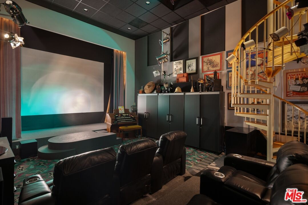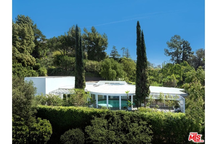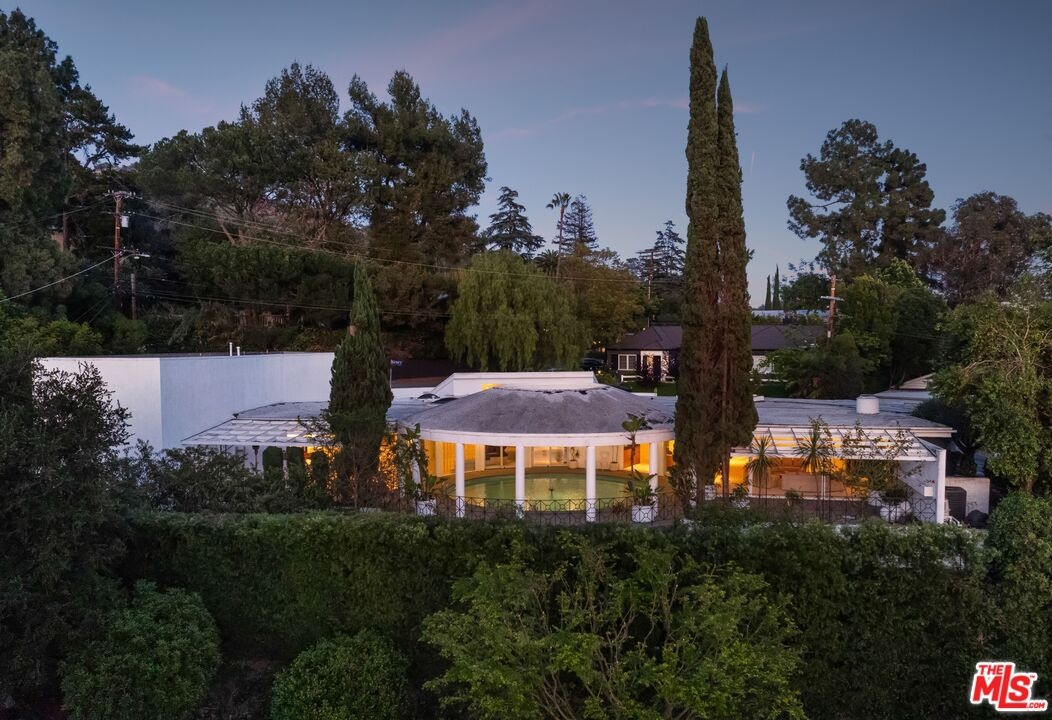 "TEMPO HOUSE" RAY KAPPE, 1959. Little has been written about this extraordinary residence due to its history of ultra-private ownership, yet it remains a property of remarkable architectural pedigree. With original plans archived at the Getty, the Tempo House represents a rare departure from Kappe's more widely recognized body of work. Since 1977, the home has been owned by prominent Hollywood figures Chuck McCann and Betty Fanning. Built around a stunning circular pool with an oculus overhead, the home is centered on a dramatic architectural focal point, with all principal rooms oriented to embrace this striking feature. In the early 2000's, the residence was expanded by architect Gus Duffy, seamlessly enhancing the original design while preserving its integrity. A dramatic two-story movie theater serves as a true centerpiece of the home, designed for both cinematic viewing and live entertainment. The upper level offers additional flexibility and can be utilized as a recording studio, creative workspace, or private production suite. The home features 3 bedrooms plus an office, including a primary suite overlooking the outdoor pool area. Tucked away in a quiet highly coveted celebrity enclave, the property offers exceptional privacy along with serene city, canyon, and hillside views. A compelling and unique offering!