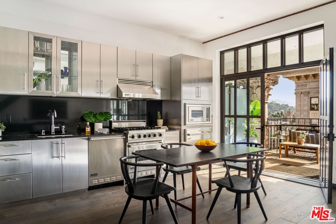 This recently updated, east-facing penthouse at The Broadway Hollywood pairs iconic Art Deco architecture with expansive city views and dramatic floor-to-ceiling windows, making it a true standout within one of Hollywood's most historic buildings. A generous open-plan living space sets the tone, offering ample room for both living and dining while capturing views of the Capitol Records Building, the Hollywood Sign, Griffith Observatory, and the Hollywood Hills. Newly updated wood floors run throughout, while the kitchen features premium stainless steel appliances and connects seamlessly to an expansive balcony accessible from both the living room and kitchen, extending the living space outdoors. Upstairs, a private one-bedroom suite provides a comfortable retreat, complete with its own balcony, sitting area, full bathroom, and an updated in-unit washer and dryer. Thoughtfully designed to support both living and working, the unit balances openness with privacy across two levels. Benefiting from the Mills Act, the residence offers significant property tax savings alongside full-service amenities including valet parking for two cars and 24-hour security, rooftop pool, spa. Ideally located near Equinox, Trader Joe's, Barry's Bootcamp, the Sunday Hollywood Farmers Market, and many of Hollywood's most notable dining destinations, this pet-friendly penthouse delivers the best of historic character and modern city living.