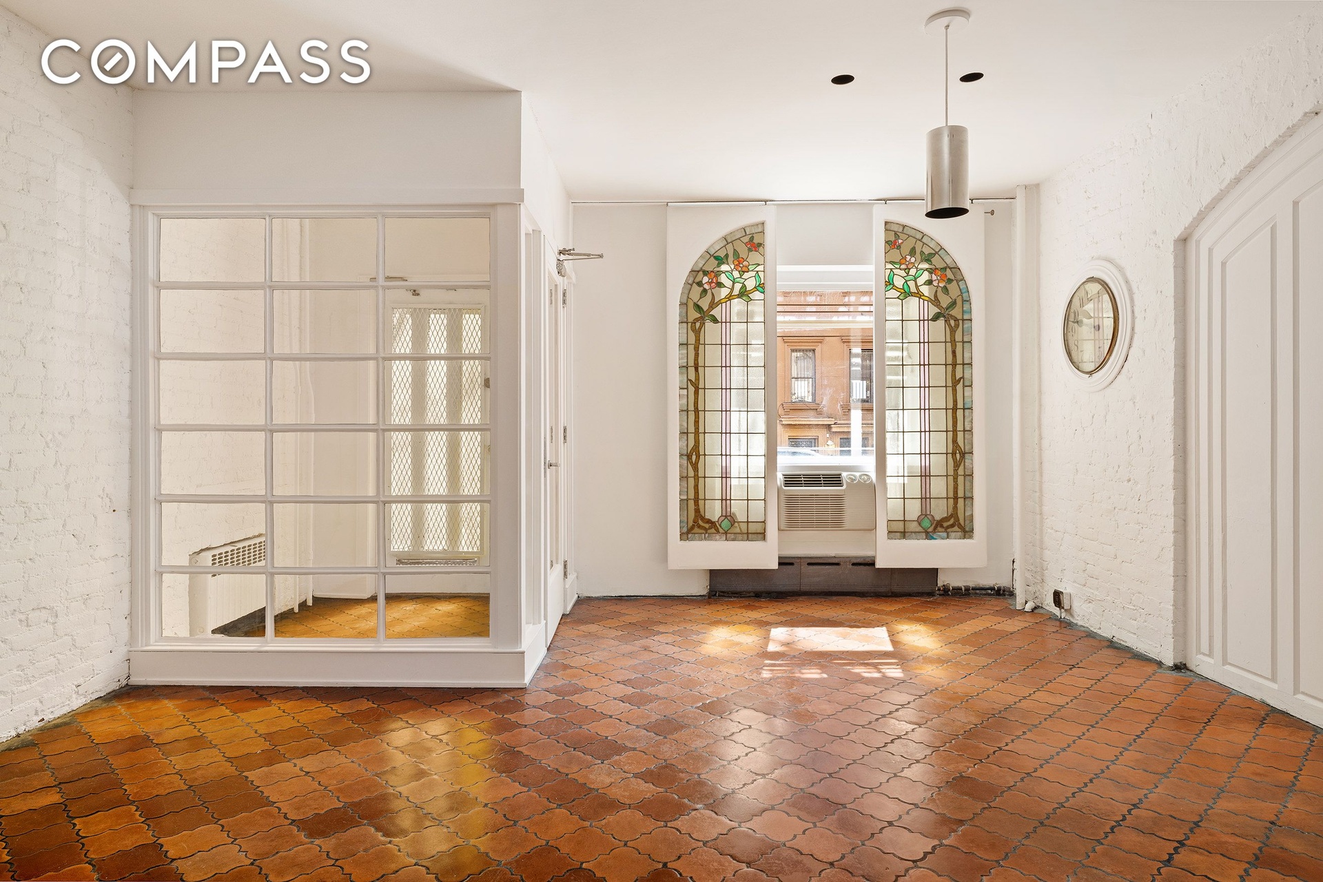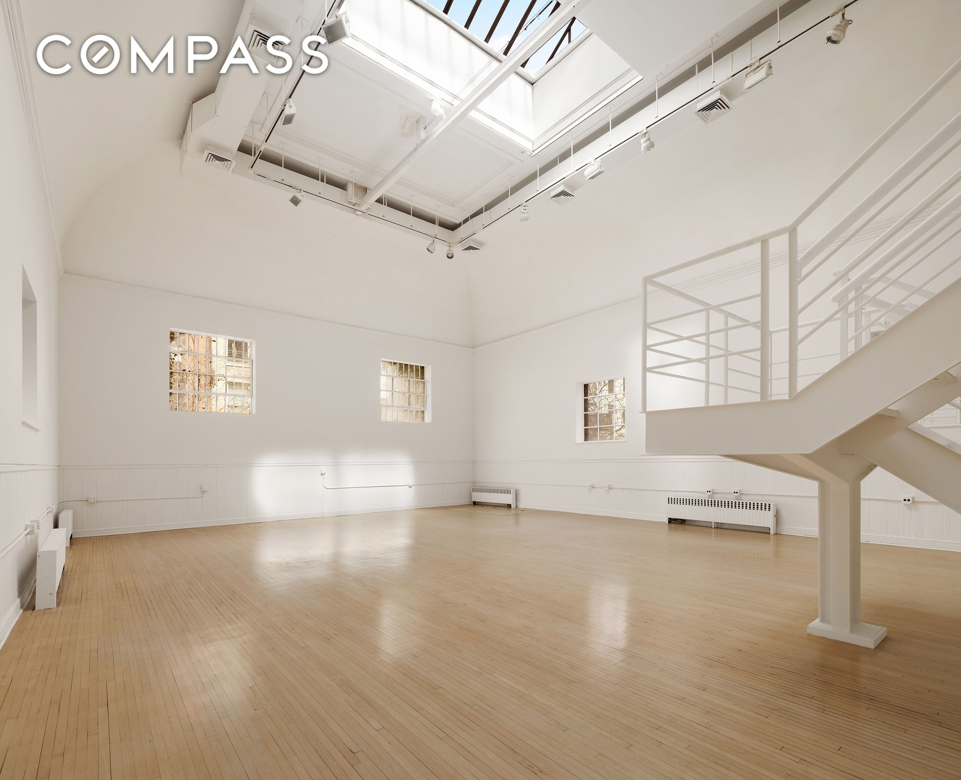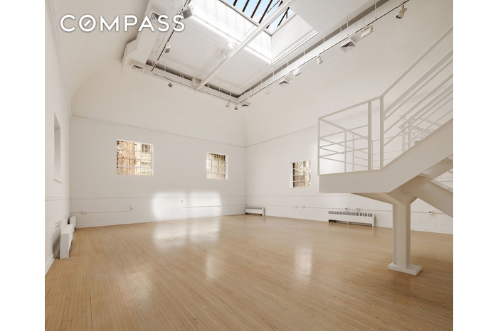 The ground level features a welcoming reception area (easily reconfigured to suit a variety of uses), a kitchen, two half bathrooms, one on-site parking garage space, and three private offices. Toward the rear, a studio space that was built of the garden of both houses at a dramatic 23 Ft tall 42 ft long by 30 ft wide, with a retractable sunroof creates a striking architectural focal point. This unique volume has been featured in the HBO series And Just Like That..., the continuation of Sex and the City. What we do know from historical records was this building was purchased by the first Chinese Presbyterian Church in New York and was also a school and the massive structure was likely their gymnasium.